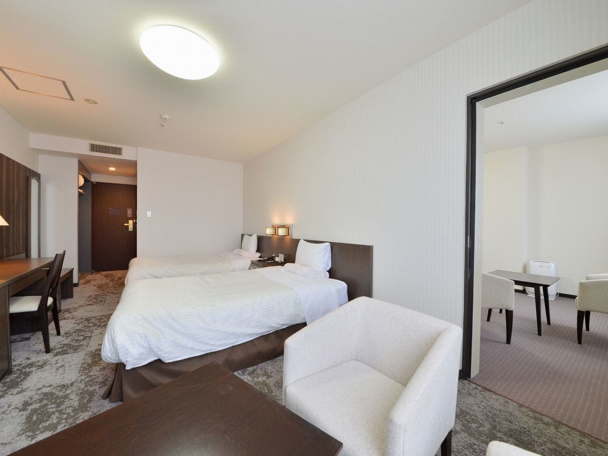 こちらのお部屋は、1予約で2室ご予約いただけます・東館・広さ:28平米 ・ベッド幅:120cm×2台 のツインルーム2室・43型液晶テレビ・全室加湿器付空気清浄機完備・インターネット接続無料(Wi-Fi接続のみ)