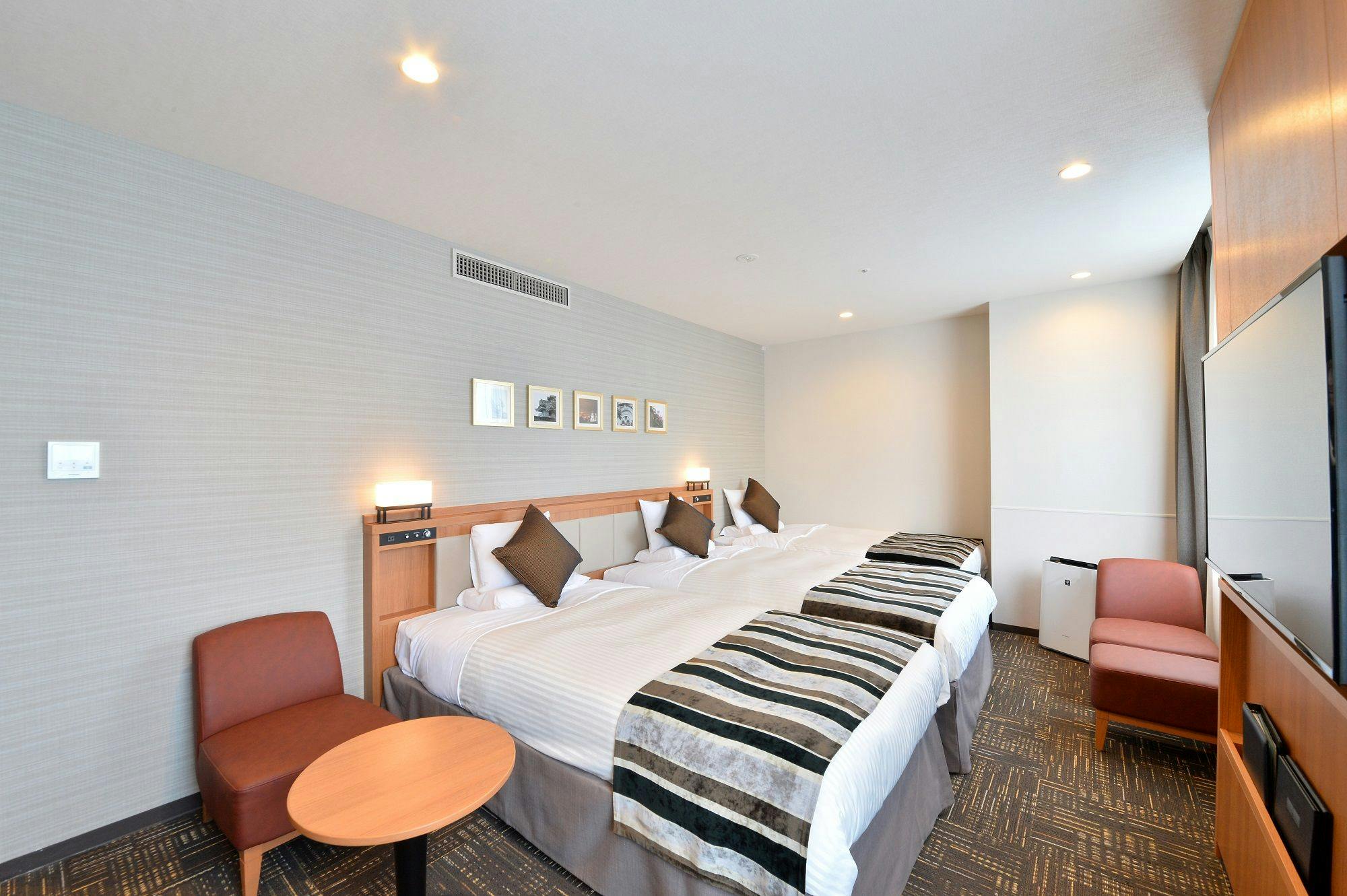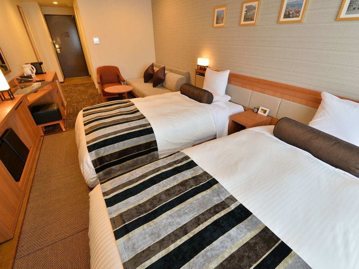 ・本館 ・広さ:27平米 ・ベッド幅:110cm 2台(人数に応じてエキストラベッド1台まで追加可)シックな落ち着きのあるデザインで機能性と快適性を追求したお部屋です。エキストラベッドを1台追加可能。3名様までご宿泊いただけます。・43型液晶テレビ・無料コーヒーマシン付き・全室加湿器付空気清浄機完備・インターネット接続無料(Wi-Fi接続のみ)
