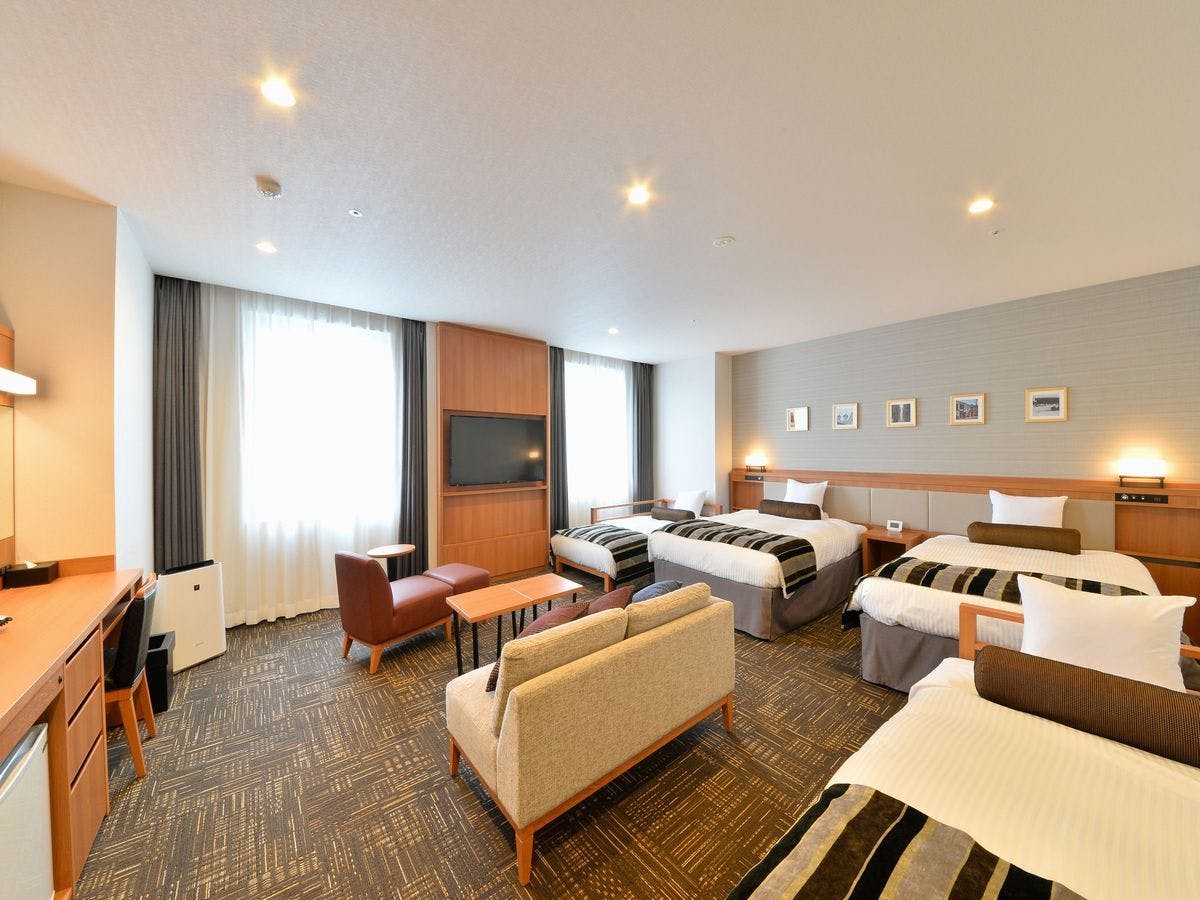 ・東館 ・広さ:46平米 ・ベッド幅:120cm 2台+ソファベッド2台広々した贅沢な空間で、ゆったりお過ごしいただけます。・43型液晶テレビ・バス・トイレ別・無料コーヒーマシン付き・全室加湿器付空気清浄機完備・インターネット接続無料(Wi-Fi接続のみ)
