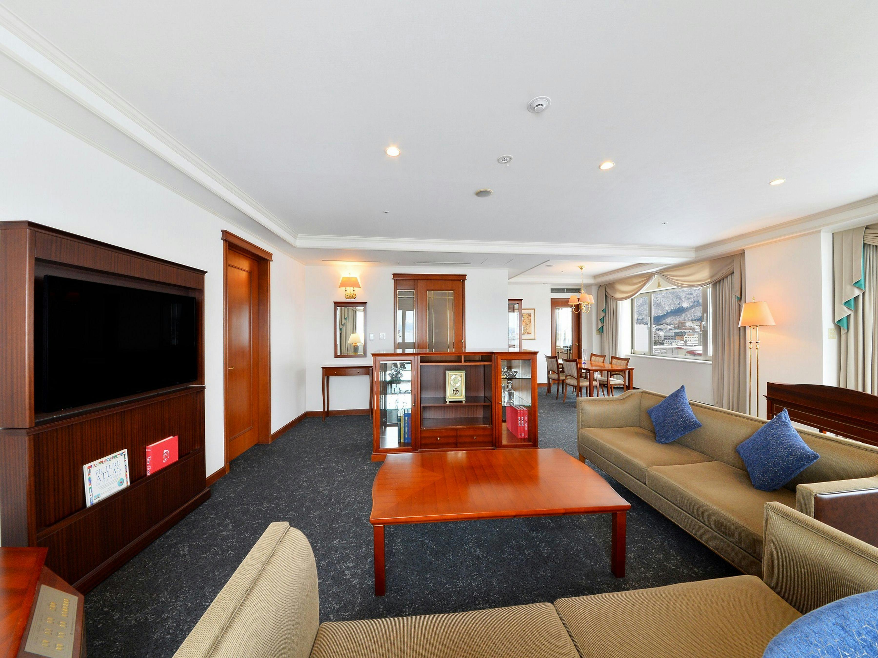 ・西館 ・広さ:120平米 ・ベッド幅:120cm 2台(エキストラベッド追加不可)120平米の開放感溢れる室内には、重厚で気品あるインテリアを配し、優雅なひとときを演出します。眼下に広がる幻想的な函館湾の夜景に、知らず知らず魅せられることでしょう。1室限定の特別室です。・49型液晶テレビ・バス・トイレ別・無料コーヒーマシン付き・全室加湿器付空気清浄機完備・インターネット接続無料(Wi-Fi接続のみ)