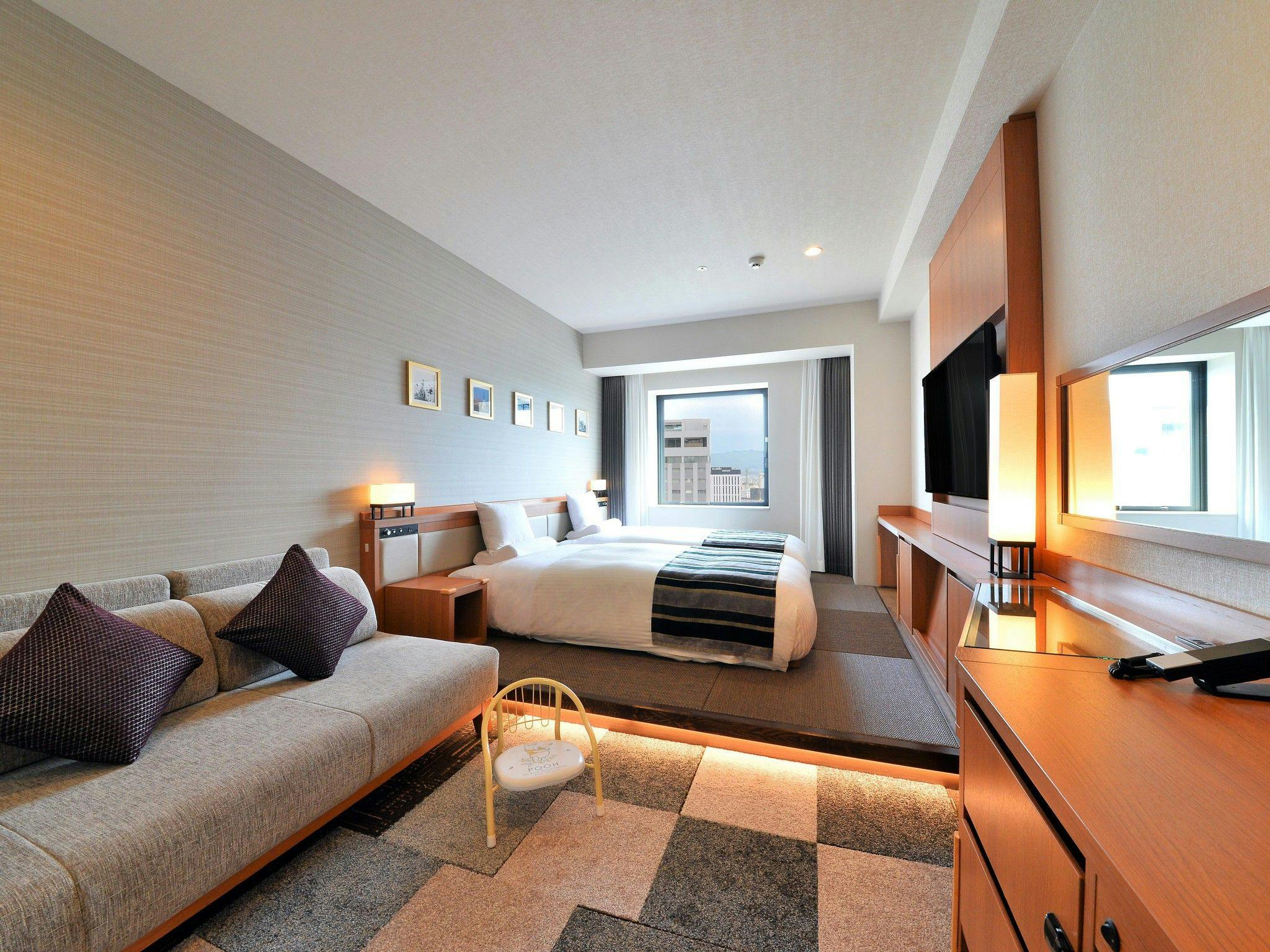 ・本館 ・広さ:27平米 ・ベッド幅:110cm 2台ベッドサイドは琉球畳を使用しており、和モダンなイメージのお部屋です。ミキハウス子育て総研「ウェルカムベビーのお宿」認定客室。お子様の安心、安全、清潔に配慮し、小さなお子様連れファミリーでも一緒にお過ごしいただけます。お部屋は靴を脱いでご利用ください。・43型液晶テレビ・無料コーヒーマシン付き・全室加湿器付空気清浄機完備・インターネット接続無料(Wi-Fi接続のみ)