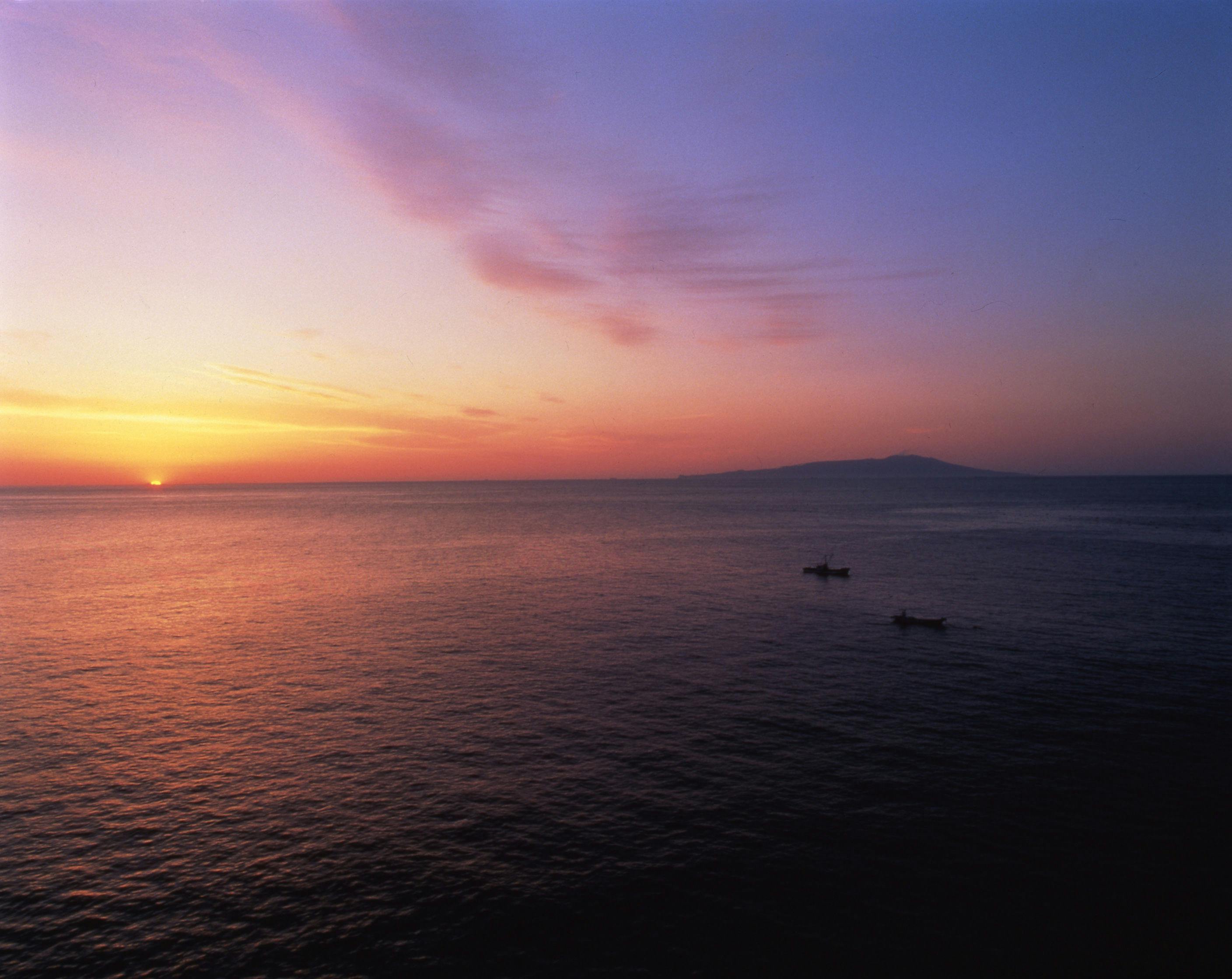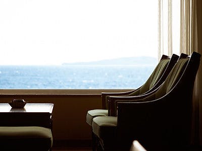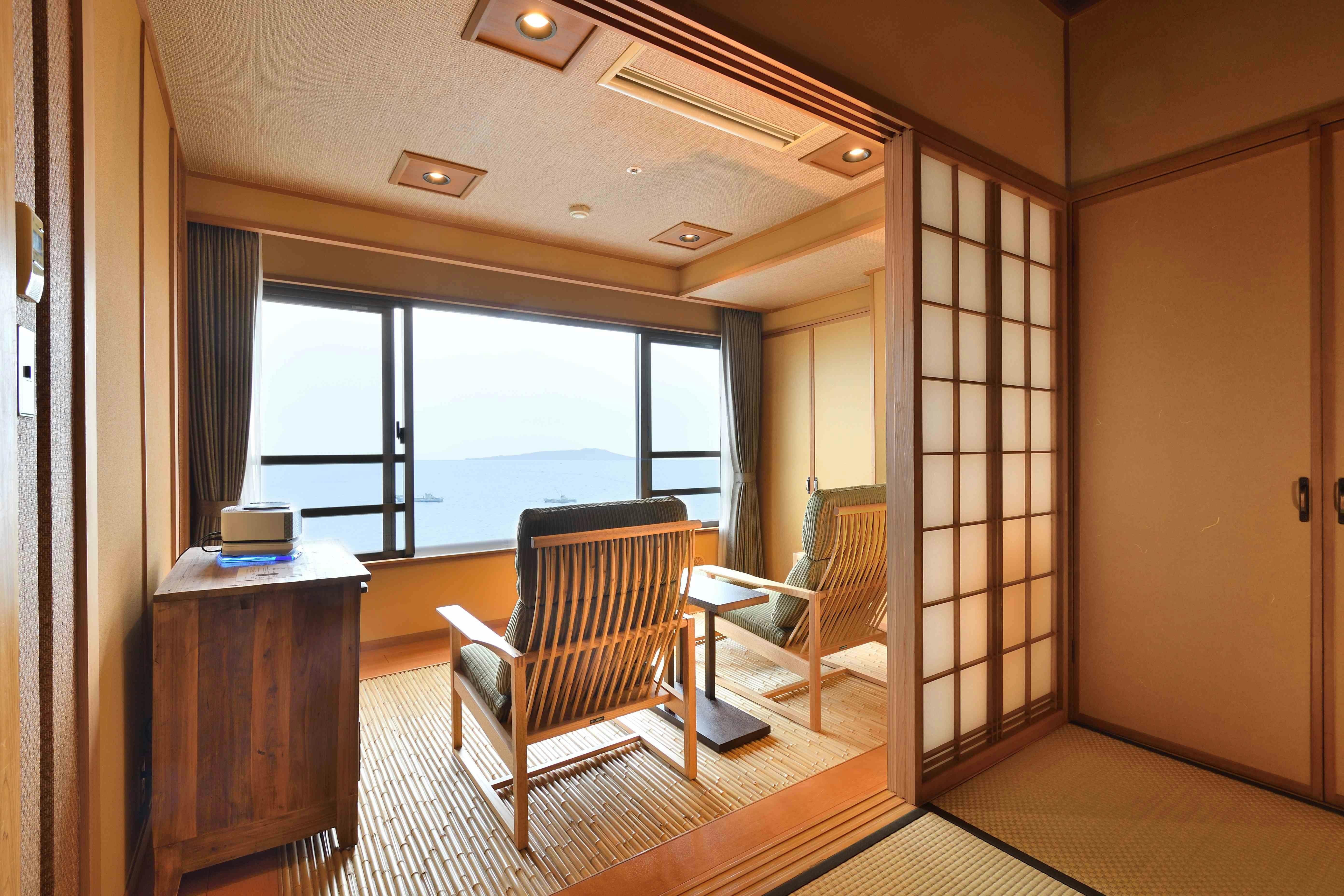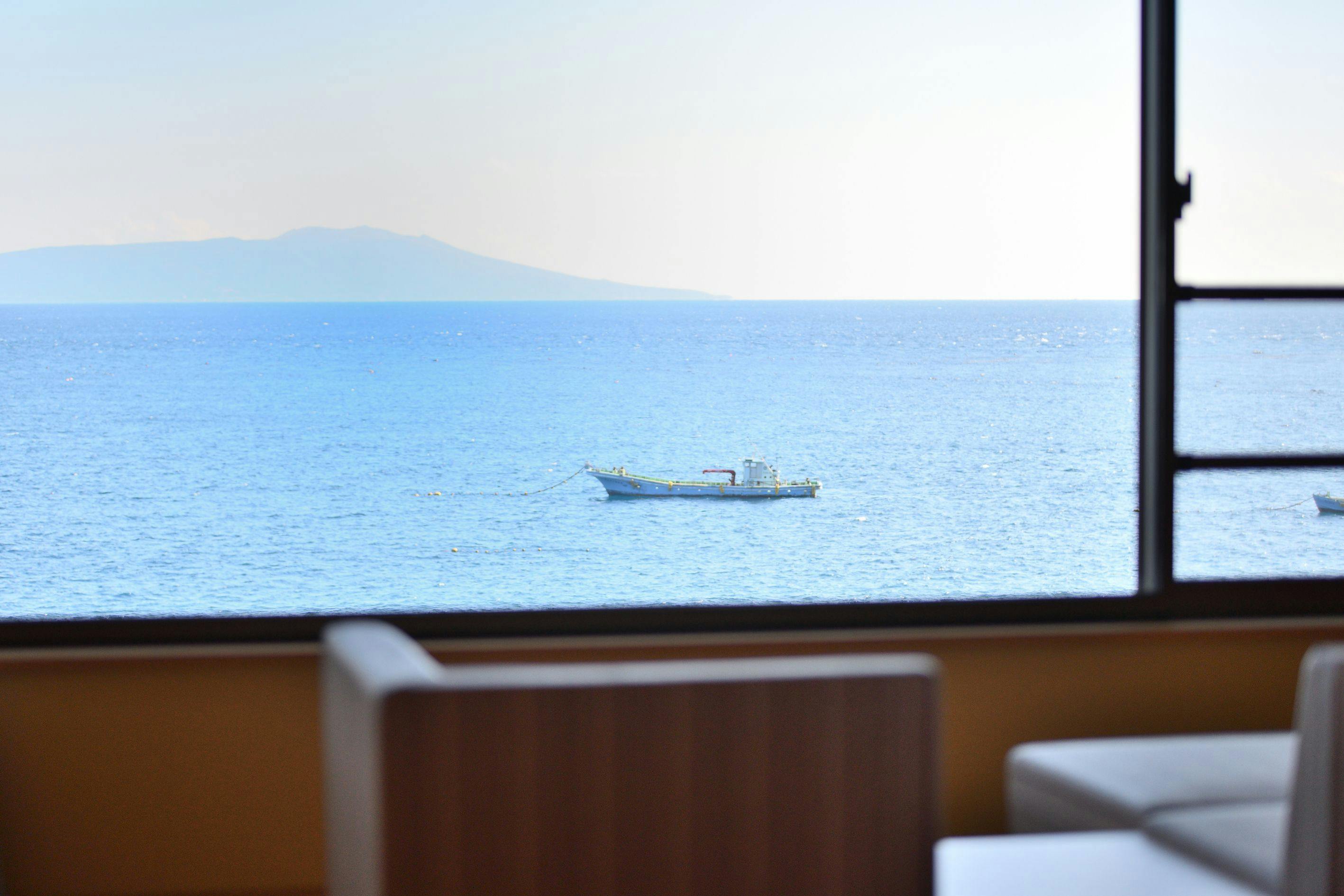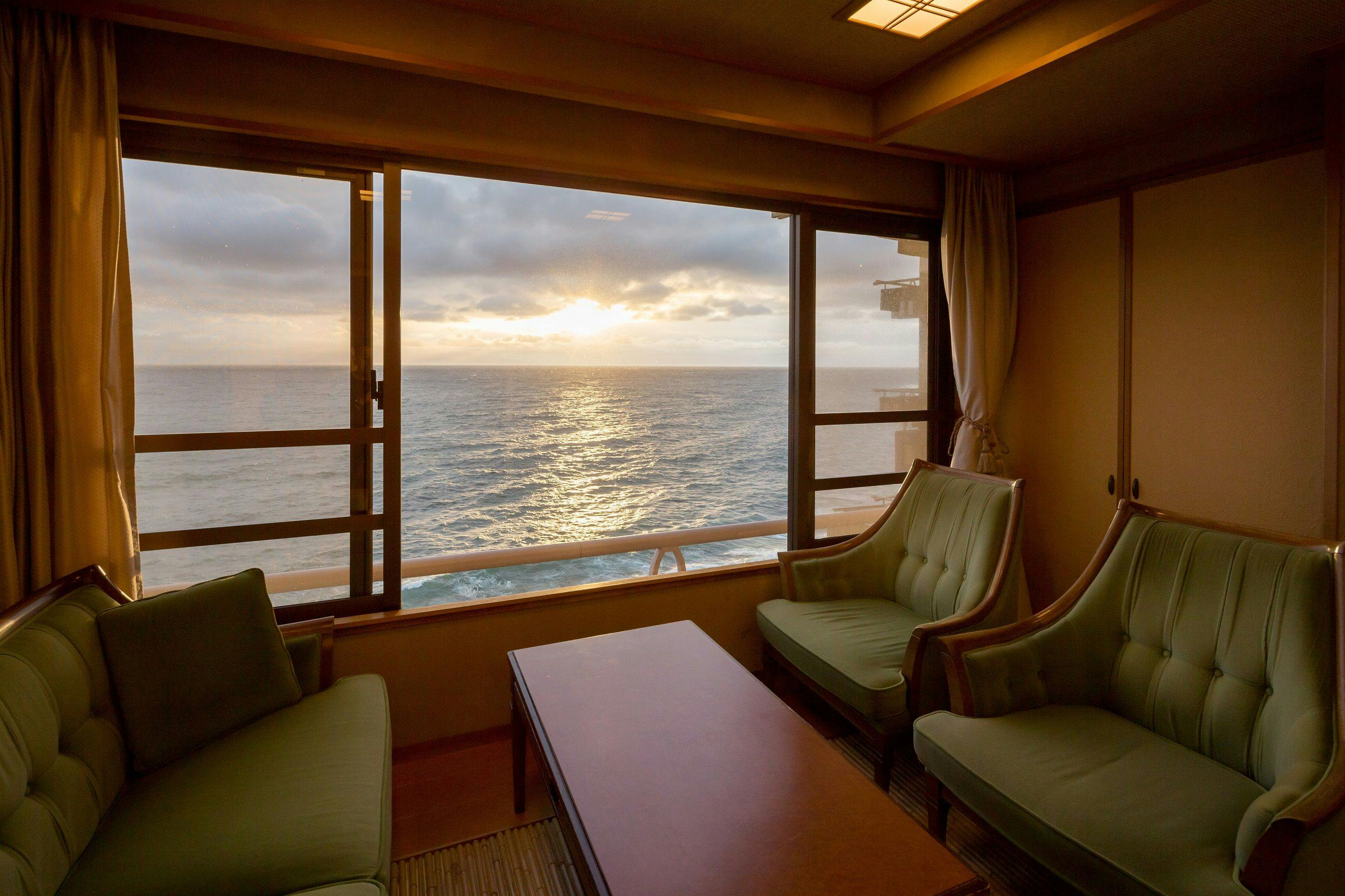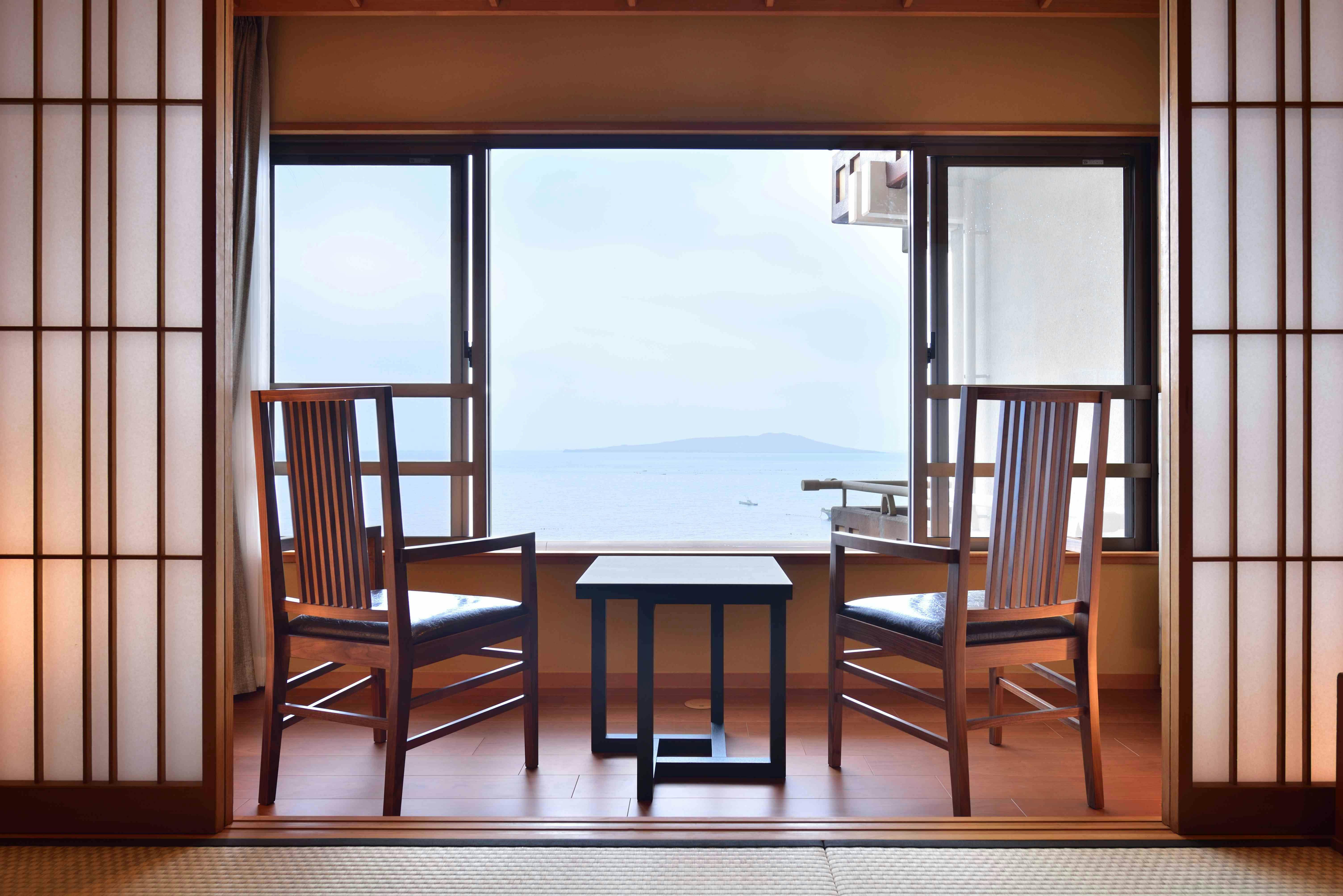 沖に浮かぶ大島を眼前に太平洋を一望できるおちついたお部屋。海へせり出すように設えたPrivateGazebo「ときの凪」-海鮮料理に舌づつみする豊かな時を