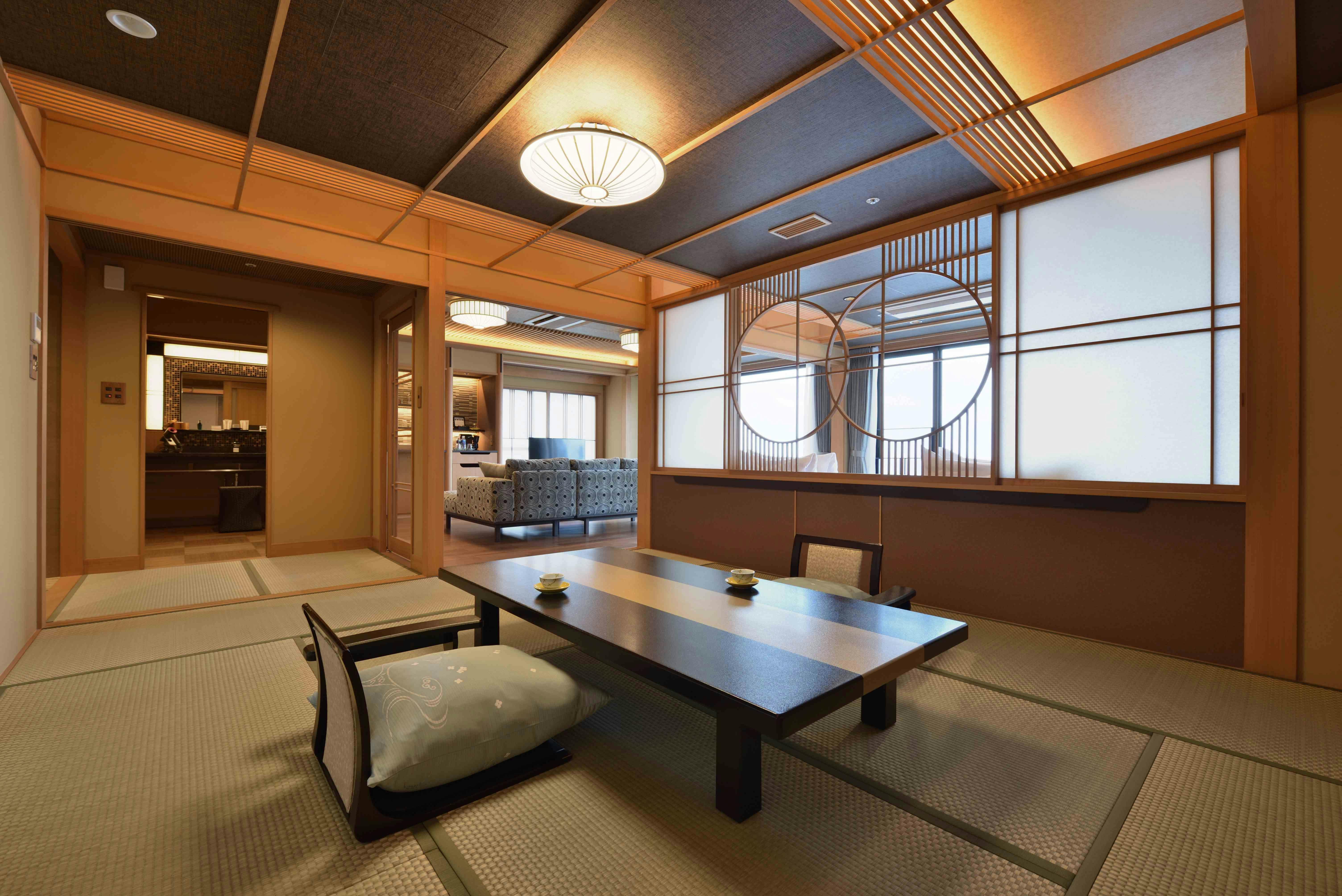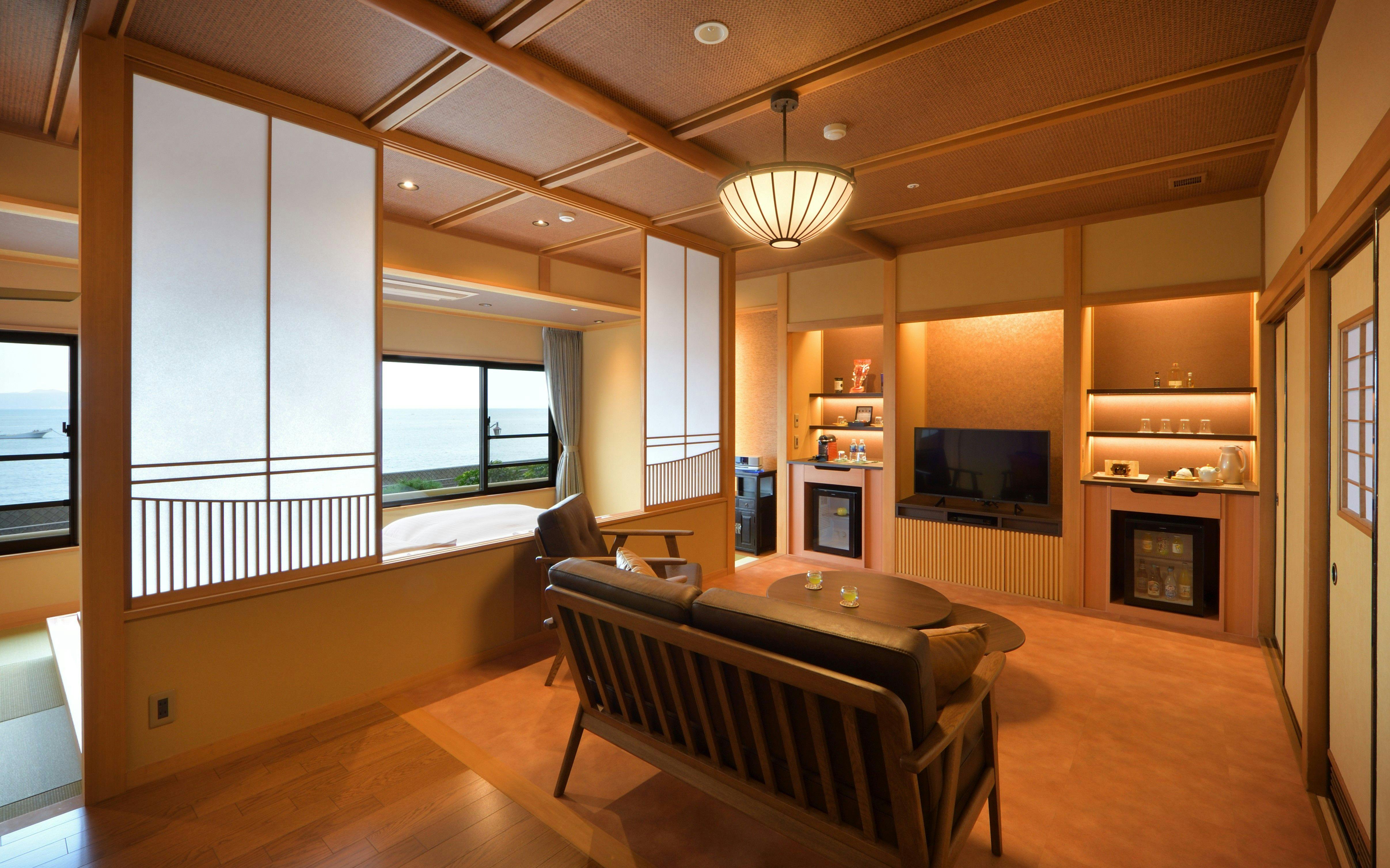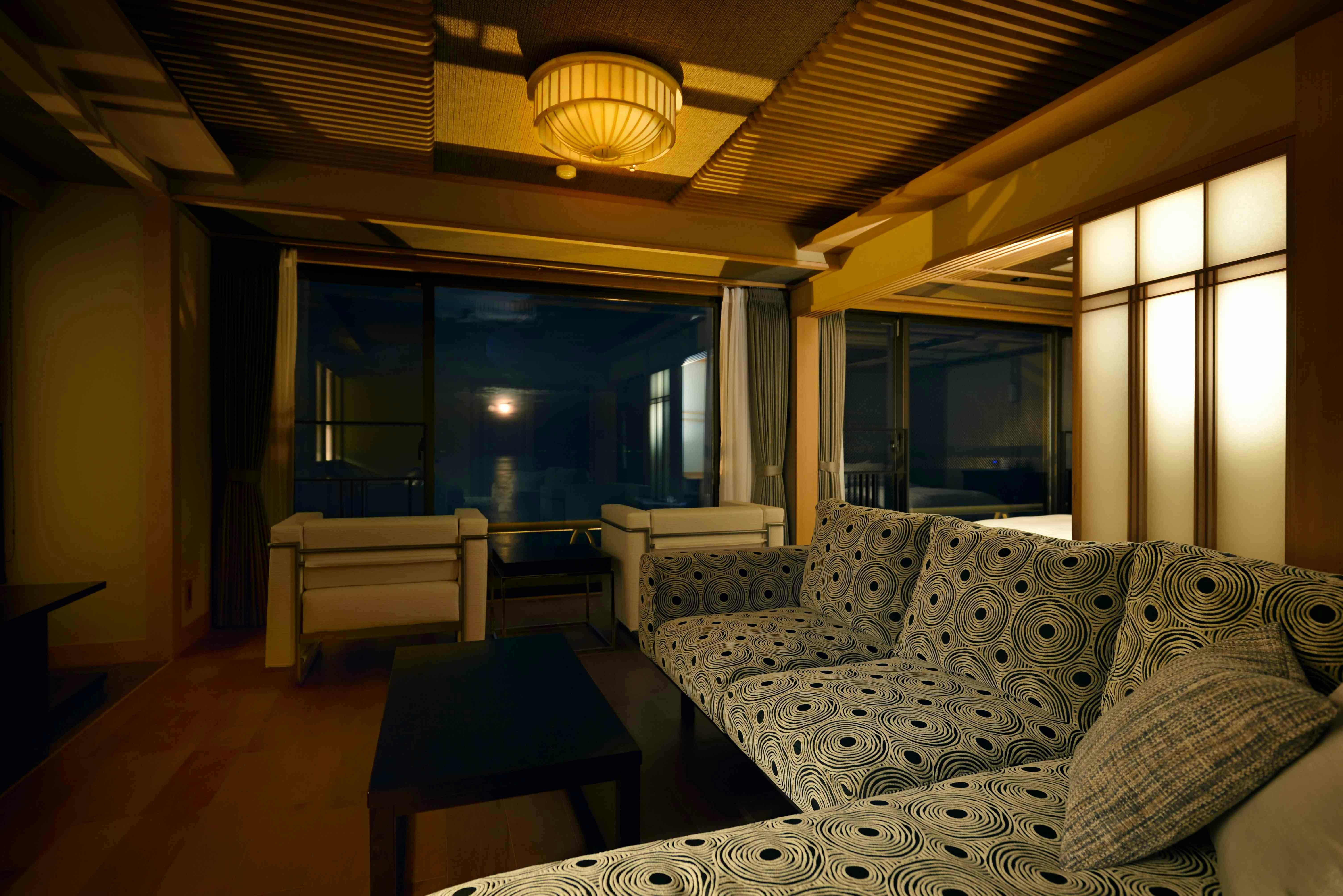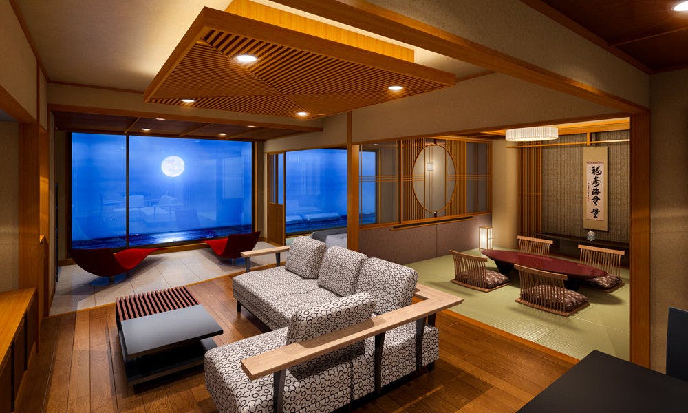 シャープな色調でまとめられたムーンロードスイート「大室」。 広々としたリビングエリア、くつろぎの和室、海に面したツインベッド、快適なシャワーブースに加え、お食事を楽しめるダイニングエリアを備えたスイートルームです。