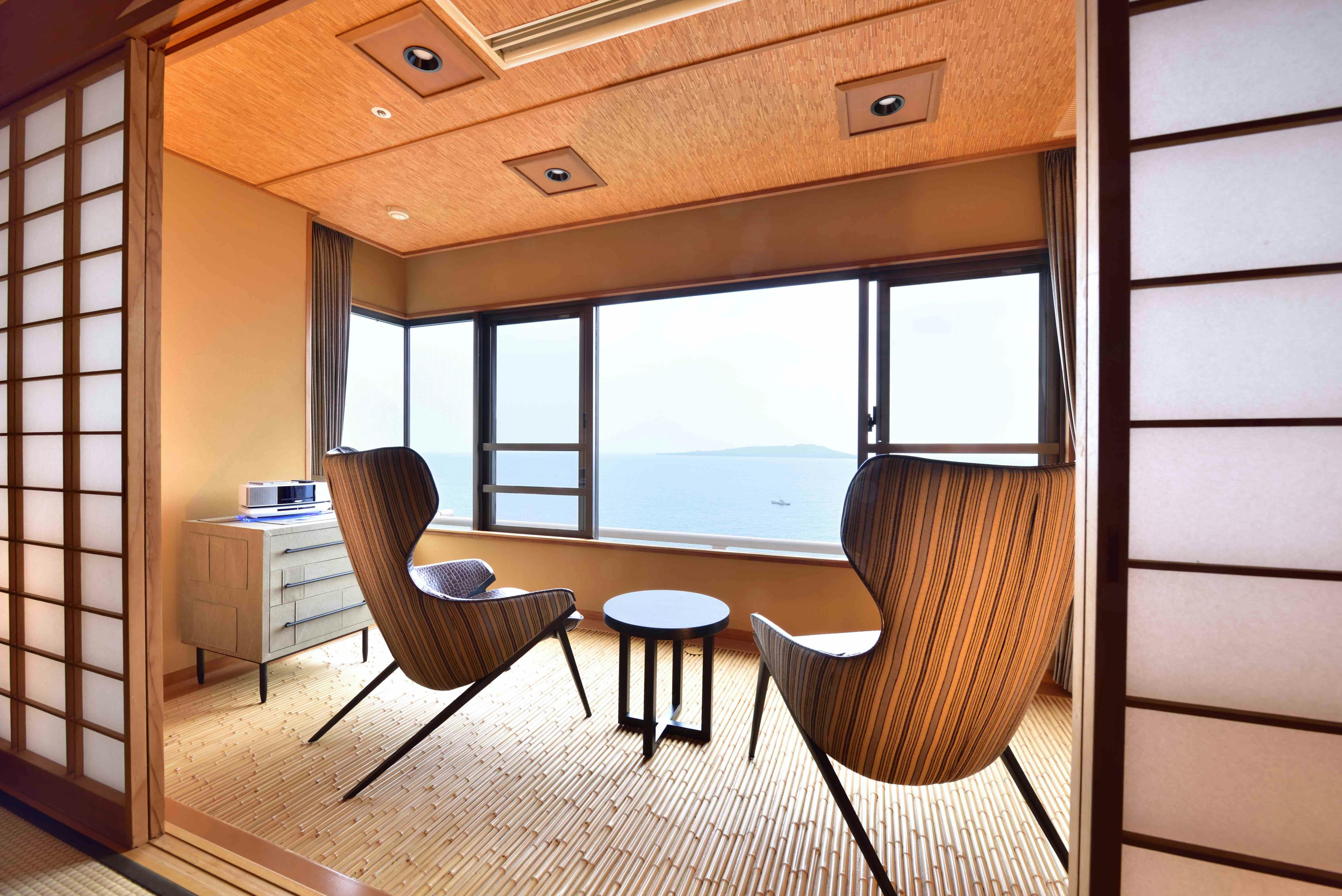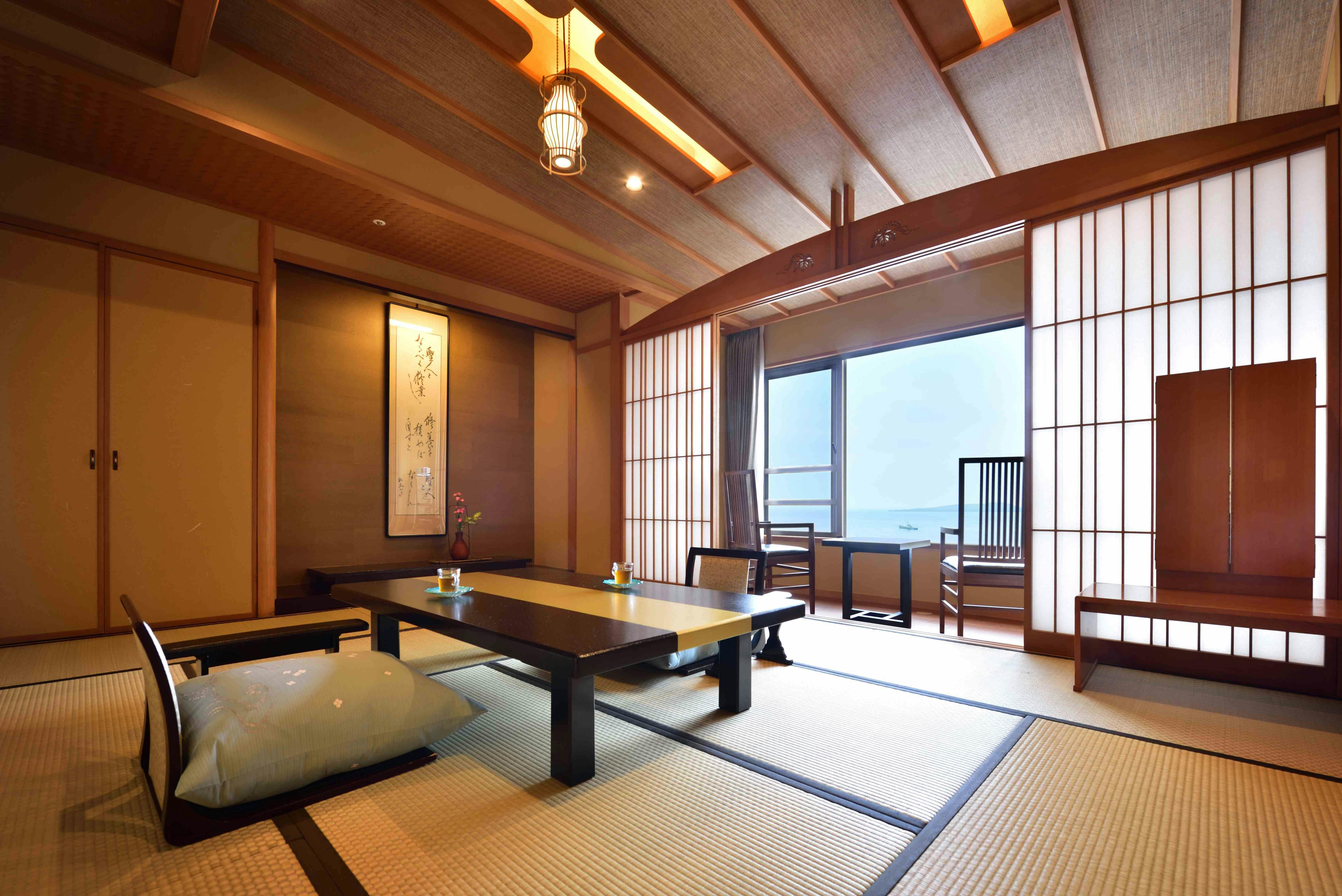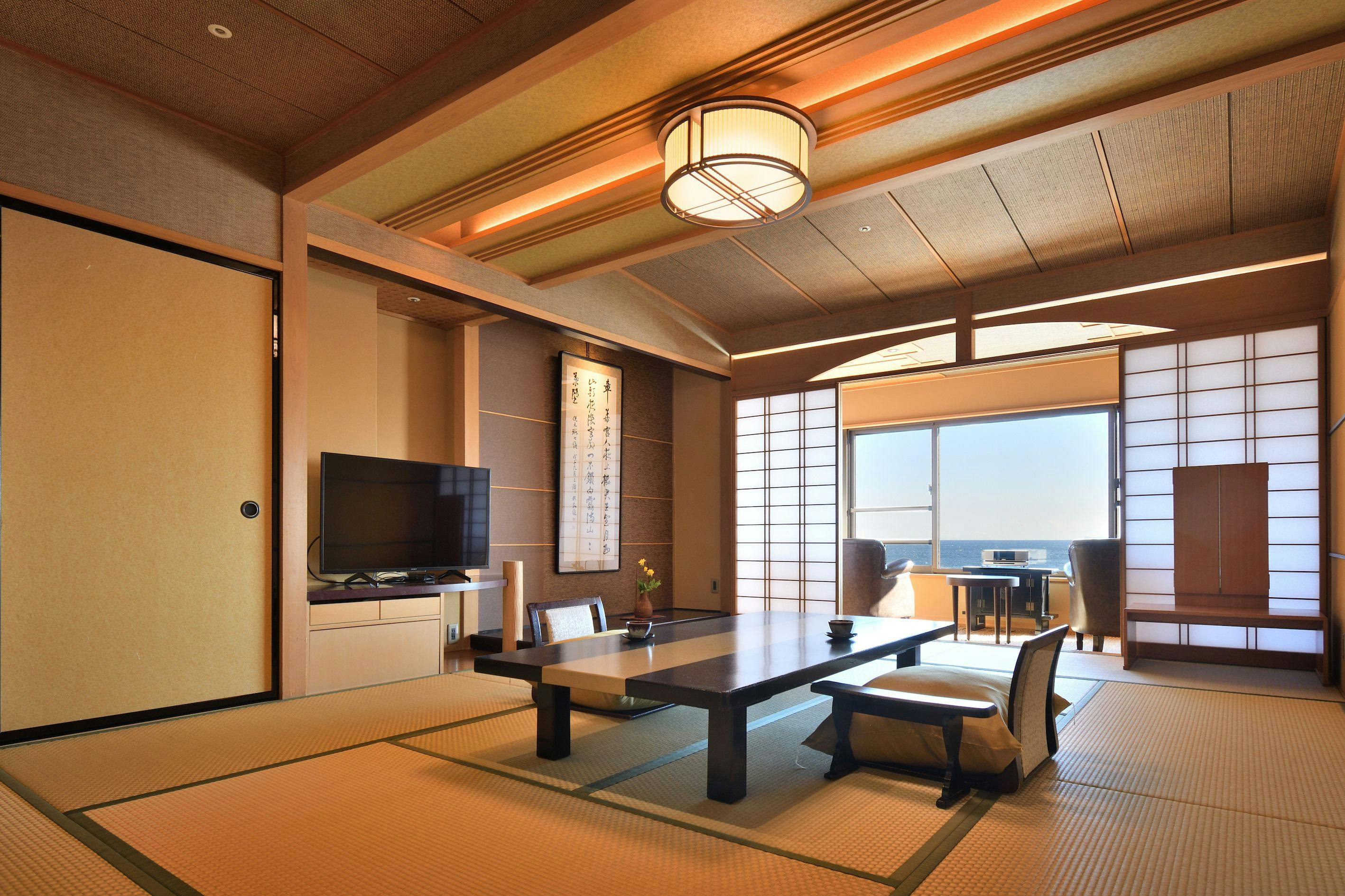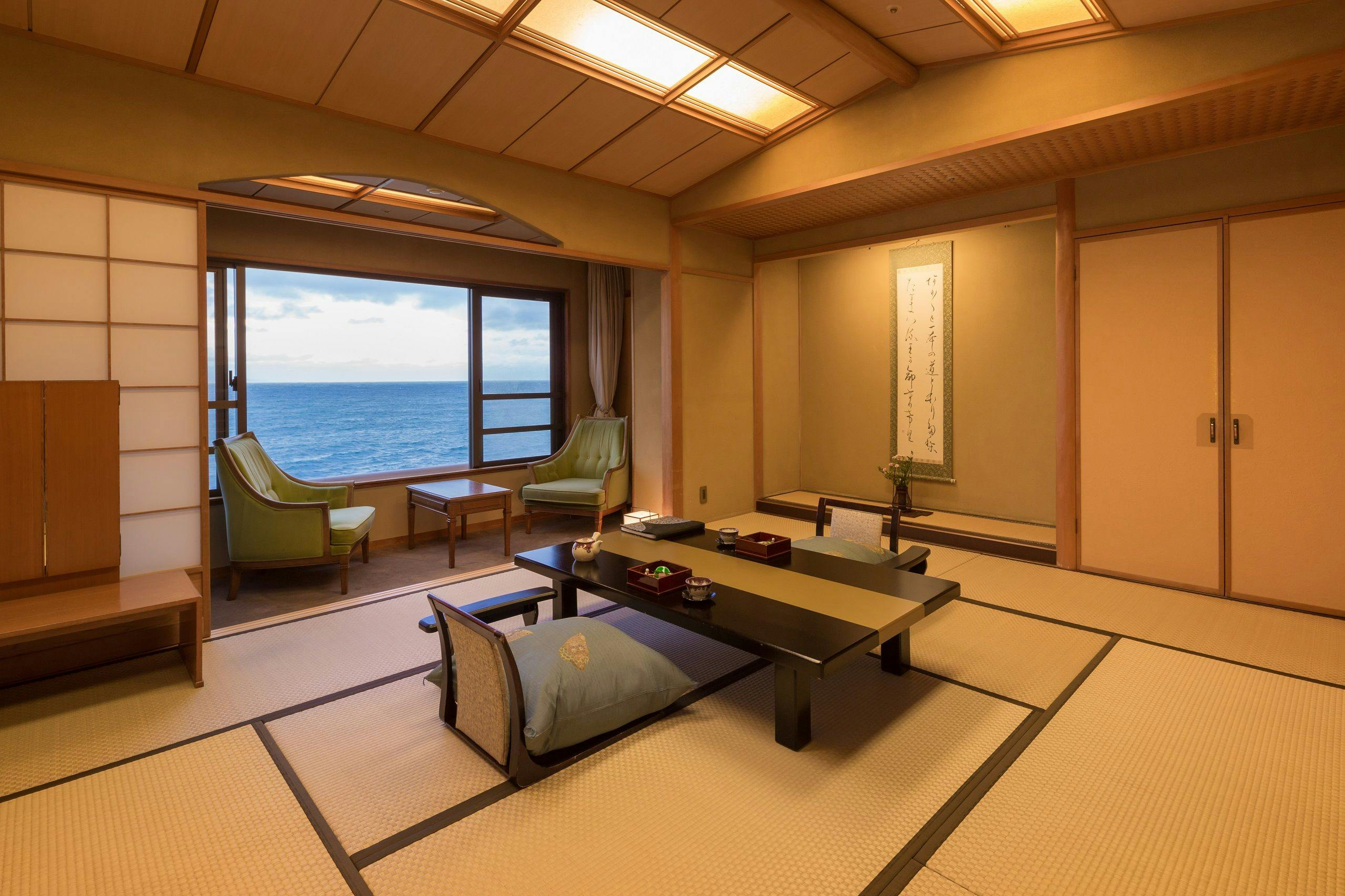 シャープな色調でまとめられたムーンロードスイート「大室」。 広々としたリビングエリア、くつろぎの和室、海に面したツインベッド、快適なシャワーブースに加え、お食事を楽しめるダイニングエリアを備えたスイートルームです。