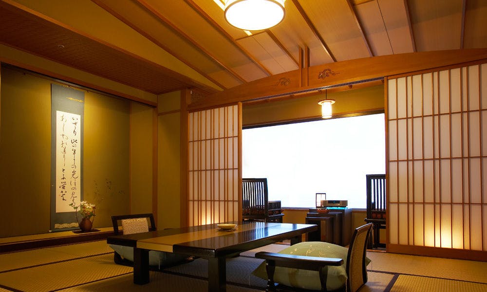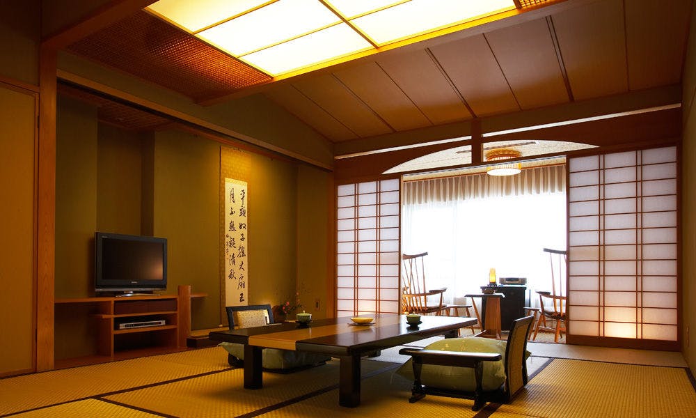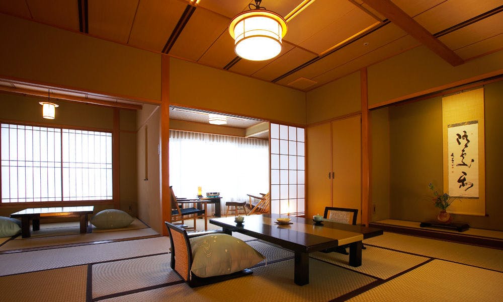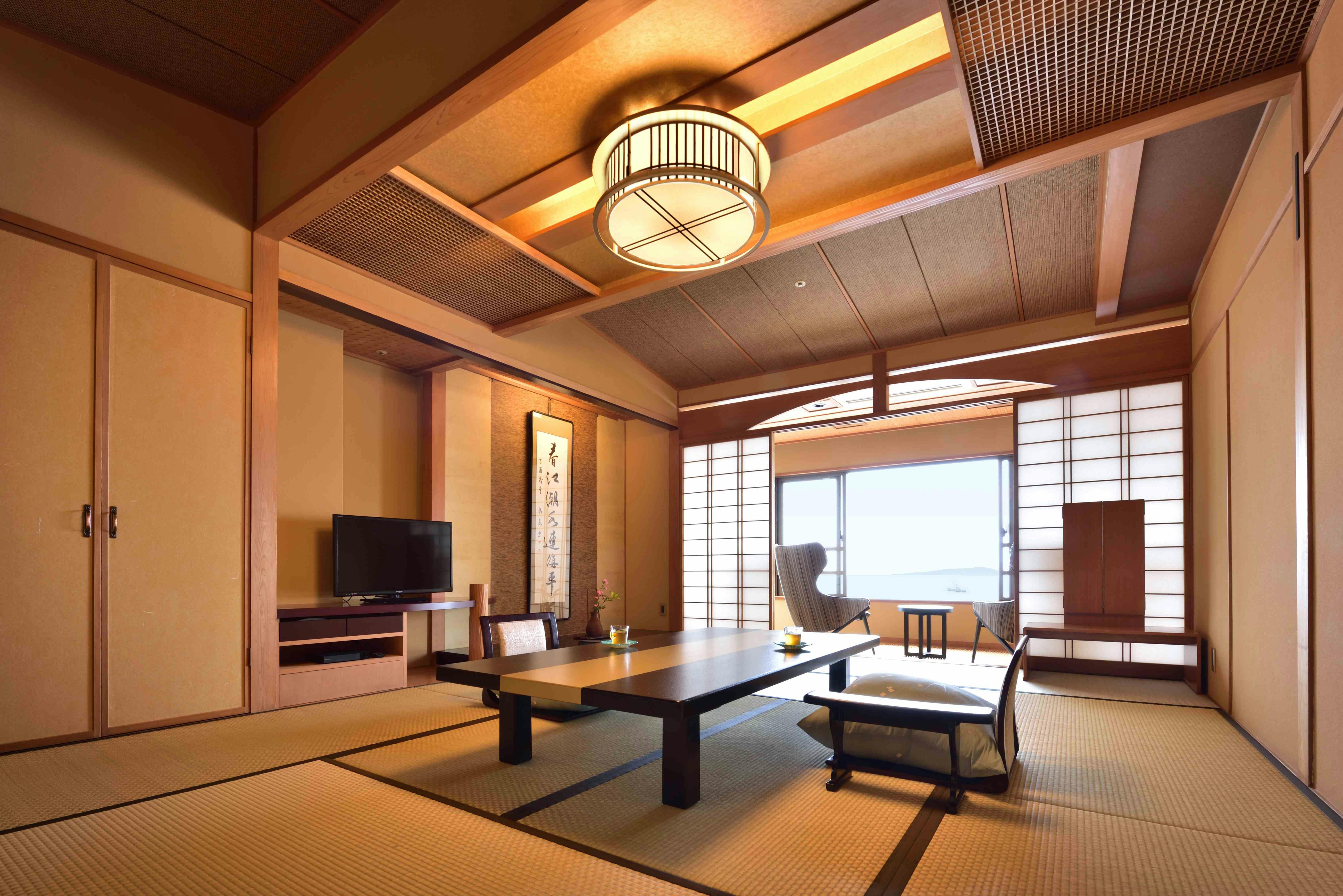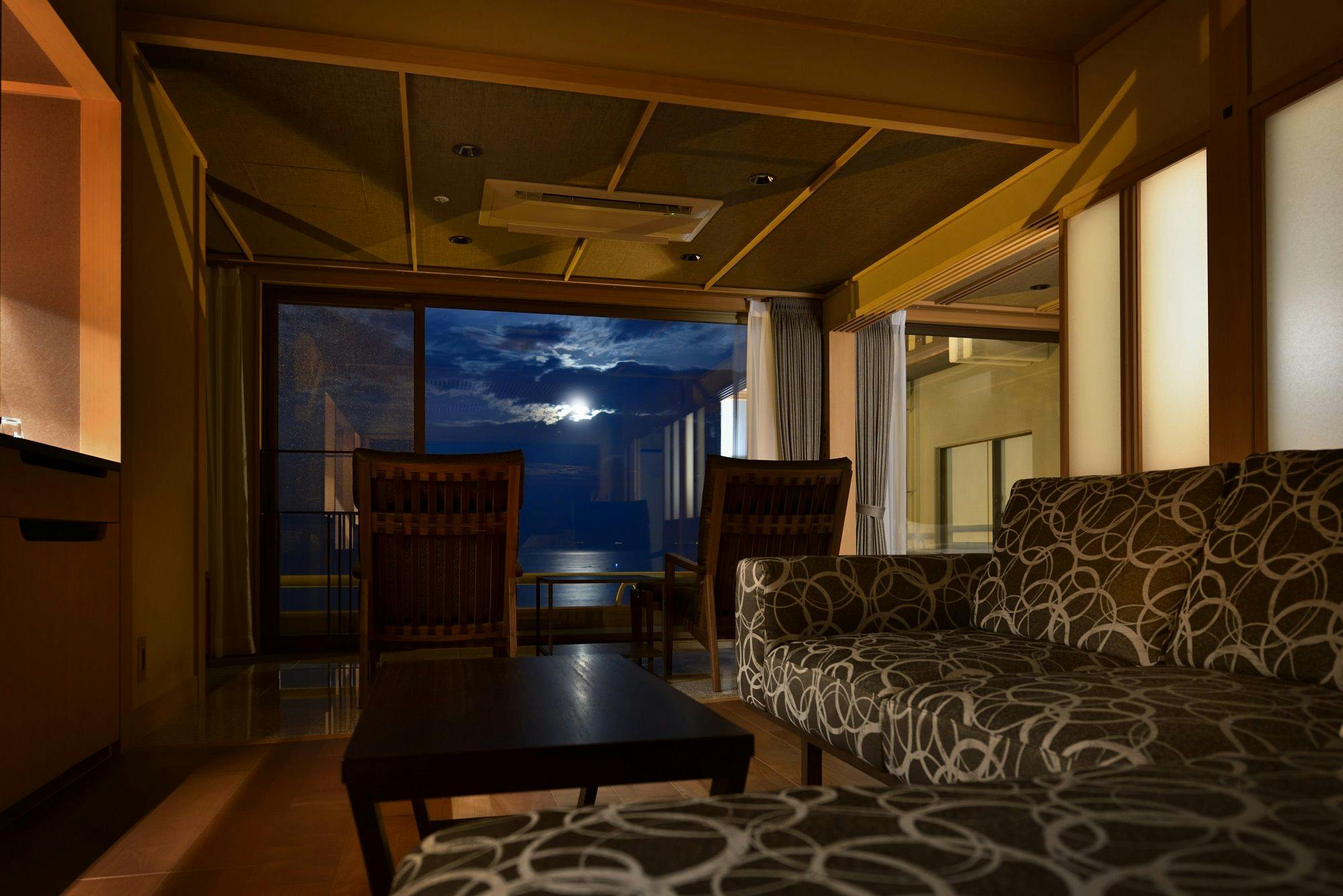 シャープな色調でまとめられたムーンロードスイート「大室」。 広々としたリビングエリア、くつろぎの和室、海に面したツインベッド、快適なシャワーブースに加え、お食事を楽しめるダイニングエリアを備えたスイートルームです。