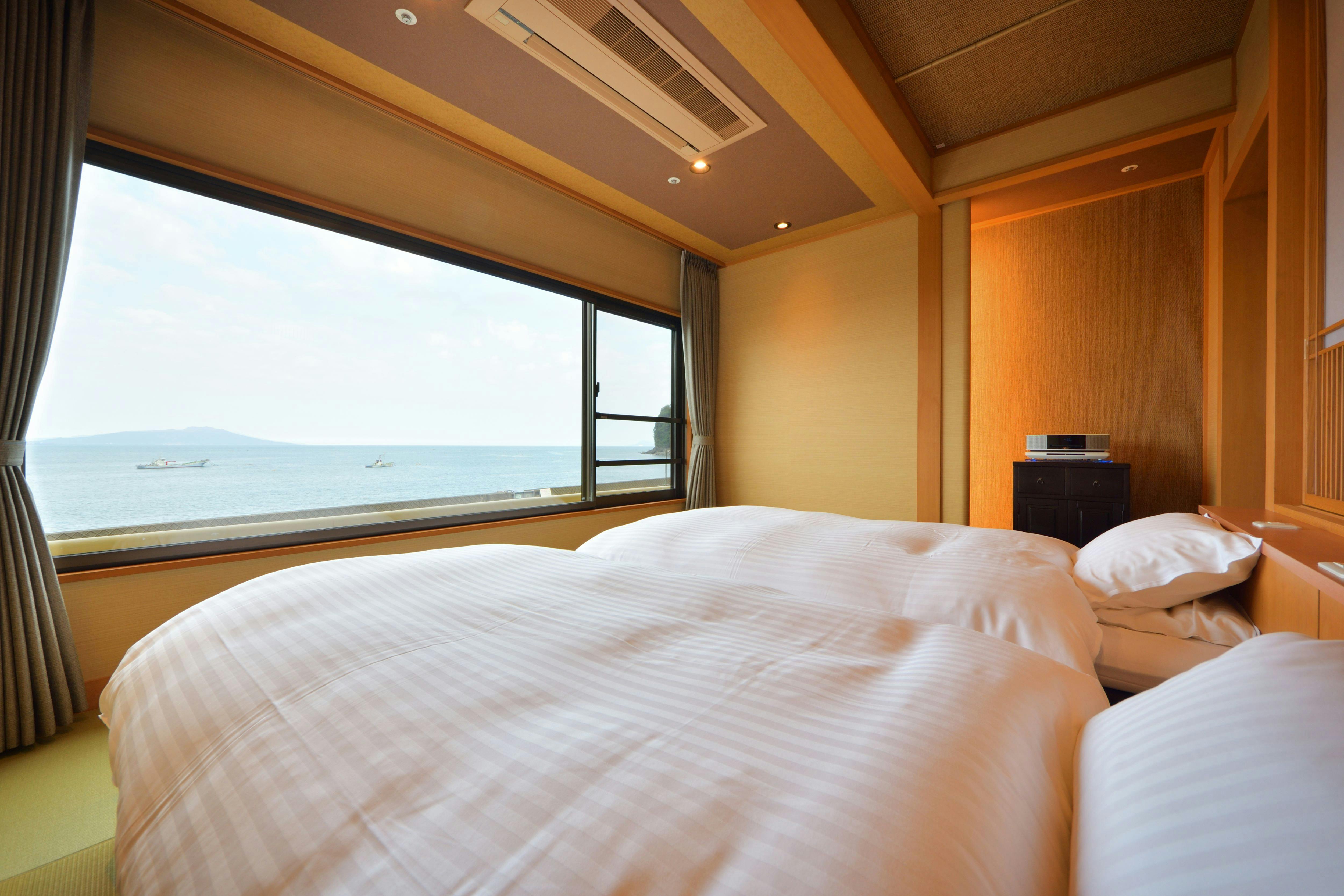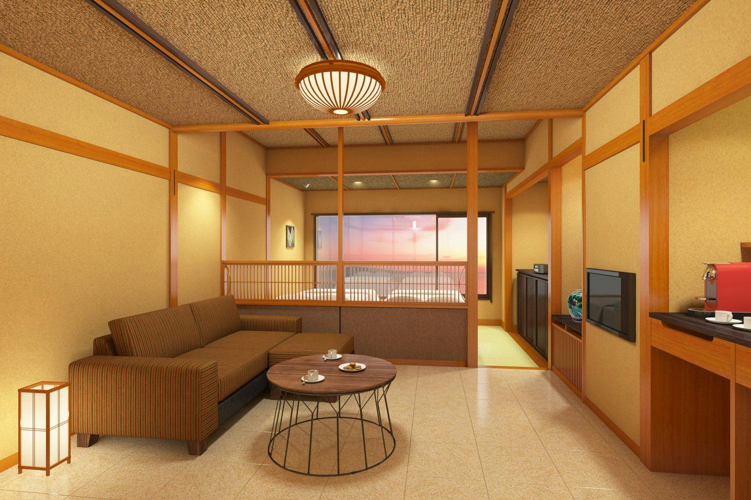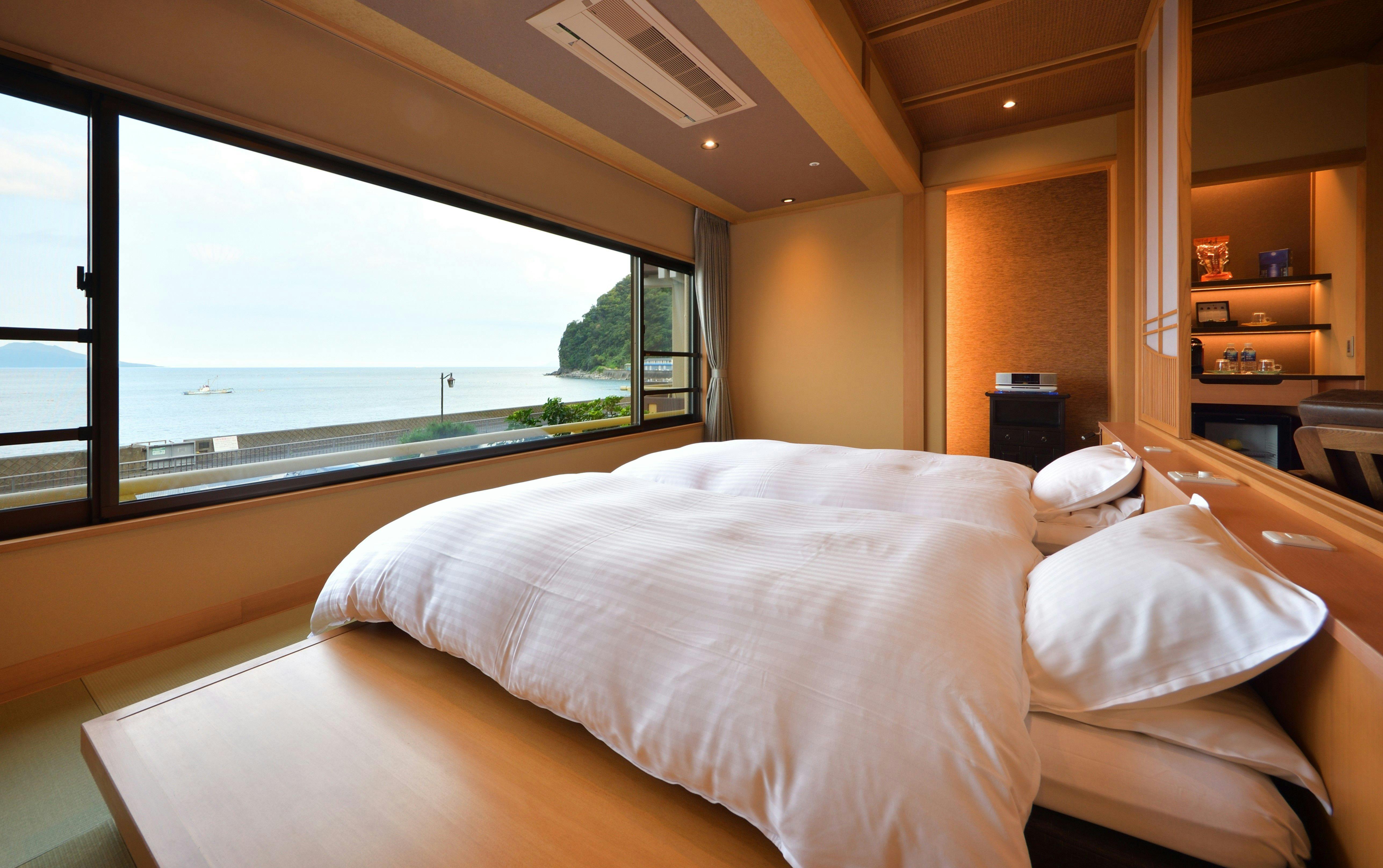 やわらかな色調でまとめられたムーンロードスイート「天城」。 広々としたリビングエリア、くつろぎの和室、海に面したツインベッド、快適なシャワーブースを備えたスイートルームです。