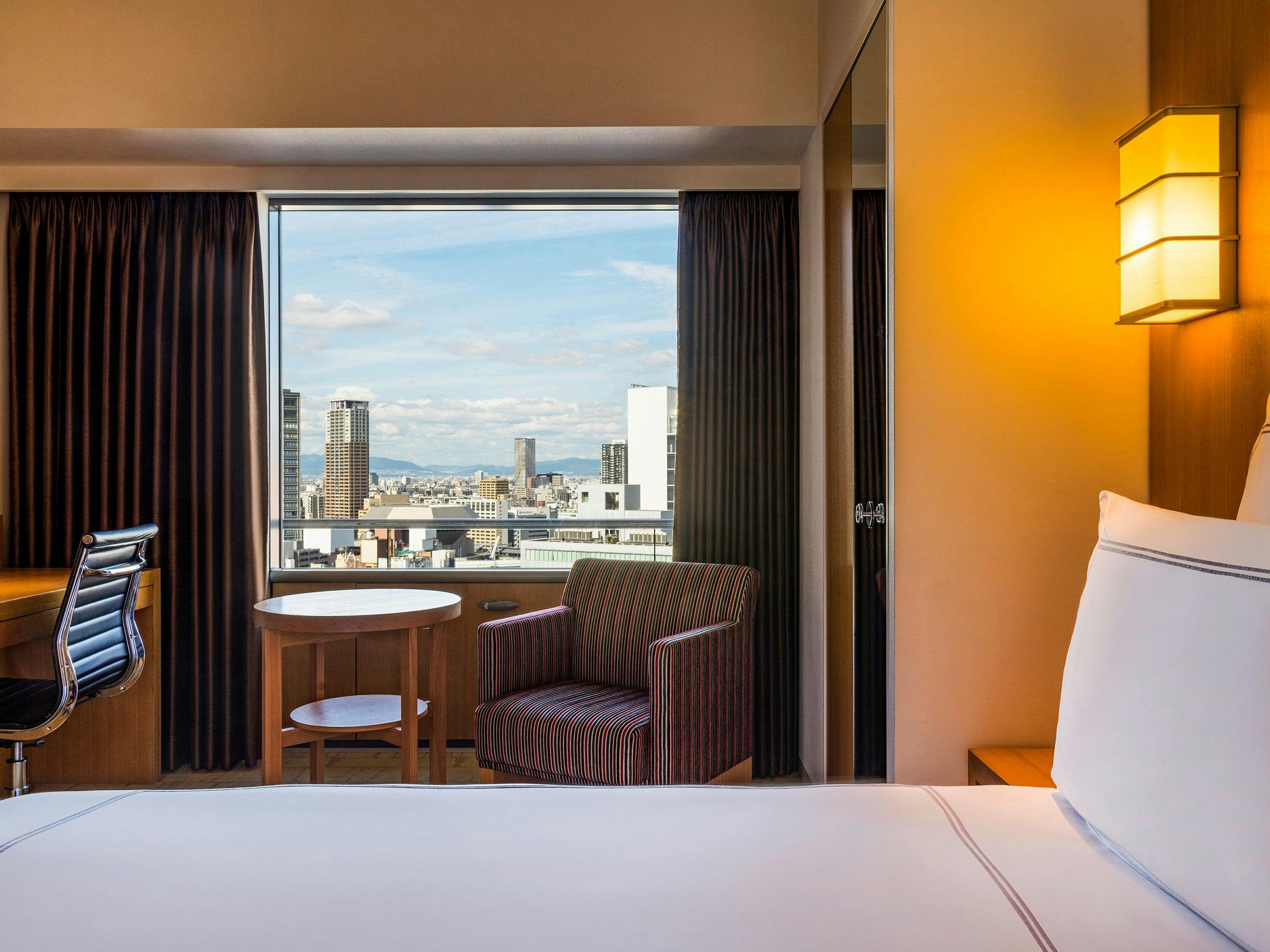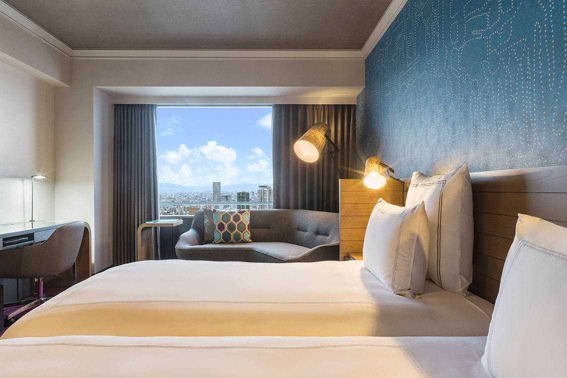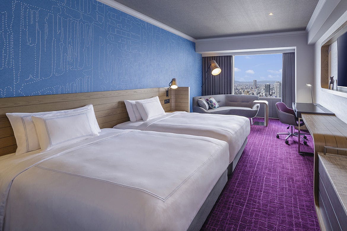 広々としたデラックス スイートは、モダンな極上の快適さをご体感いただける空間です。リビングルームにはゆったりとしたワークスペースが設けられ、55インチの大型フラットスクリーンTVを完備しています。開放的な窓からは大阪市街のパノラマビューをお楽しみいただけます。