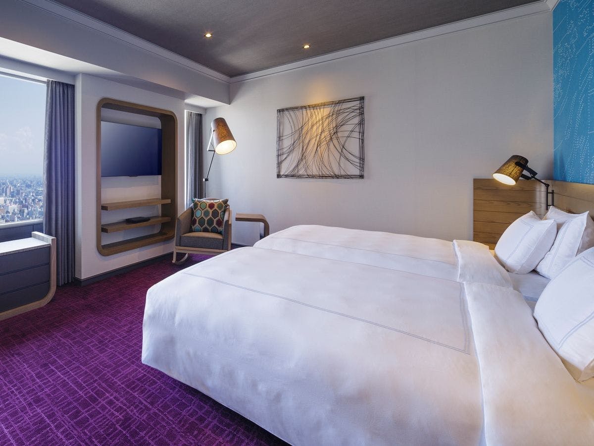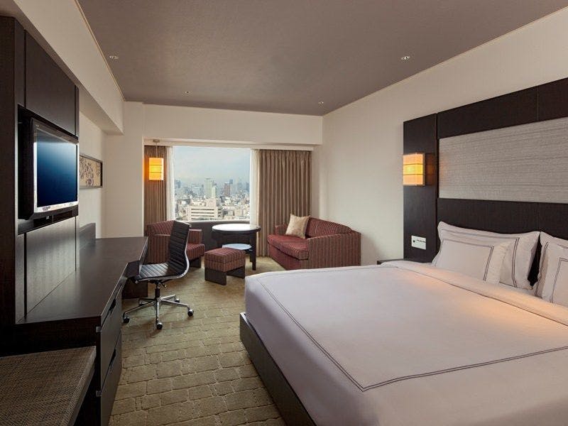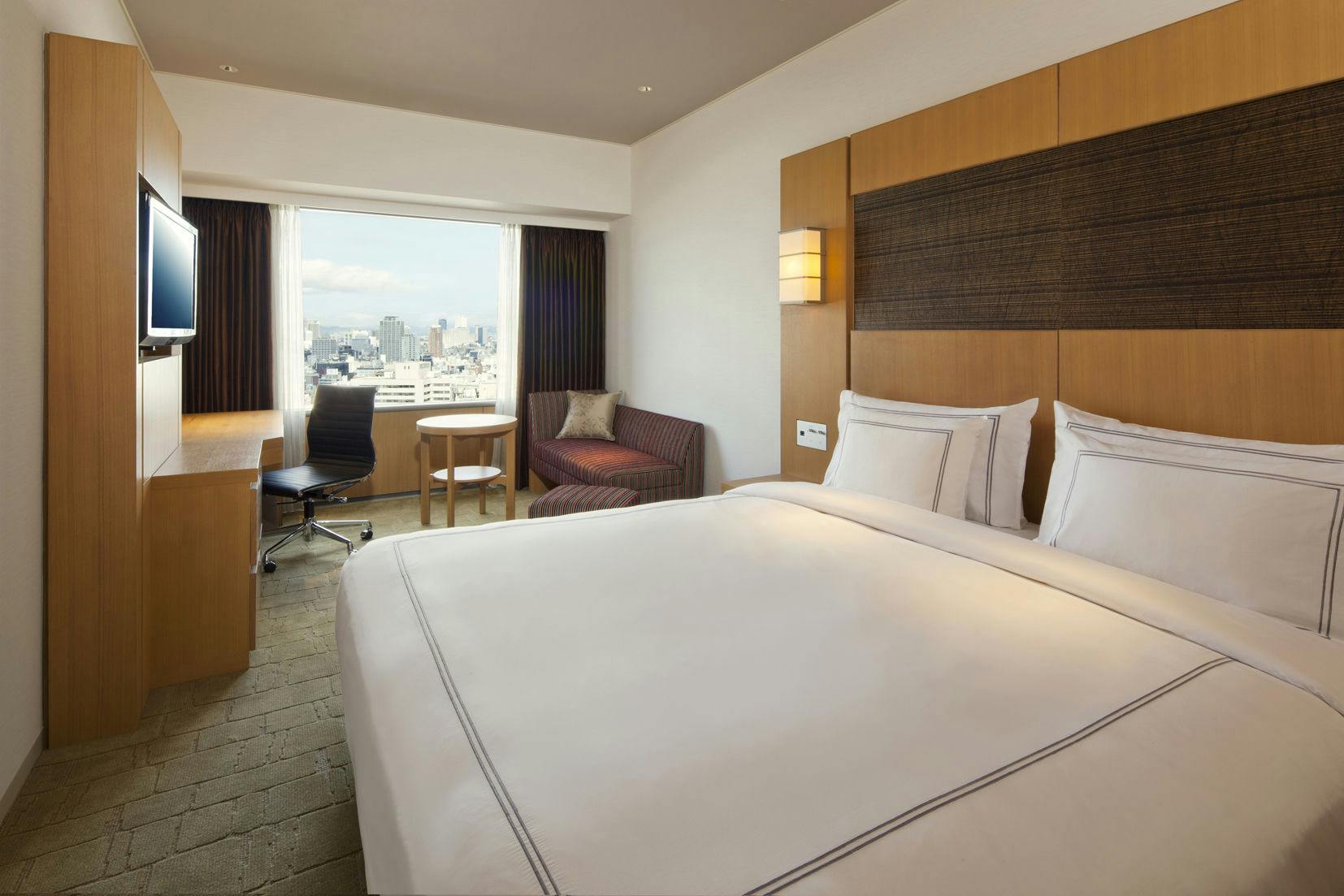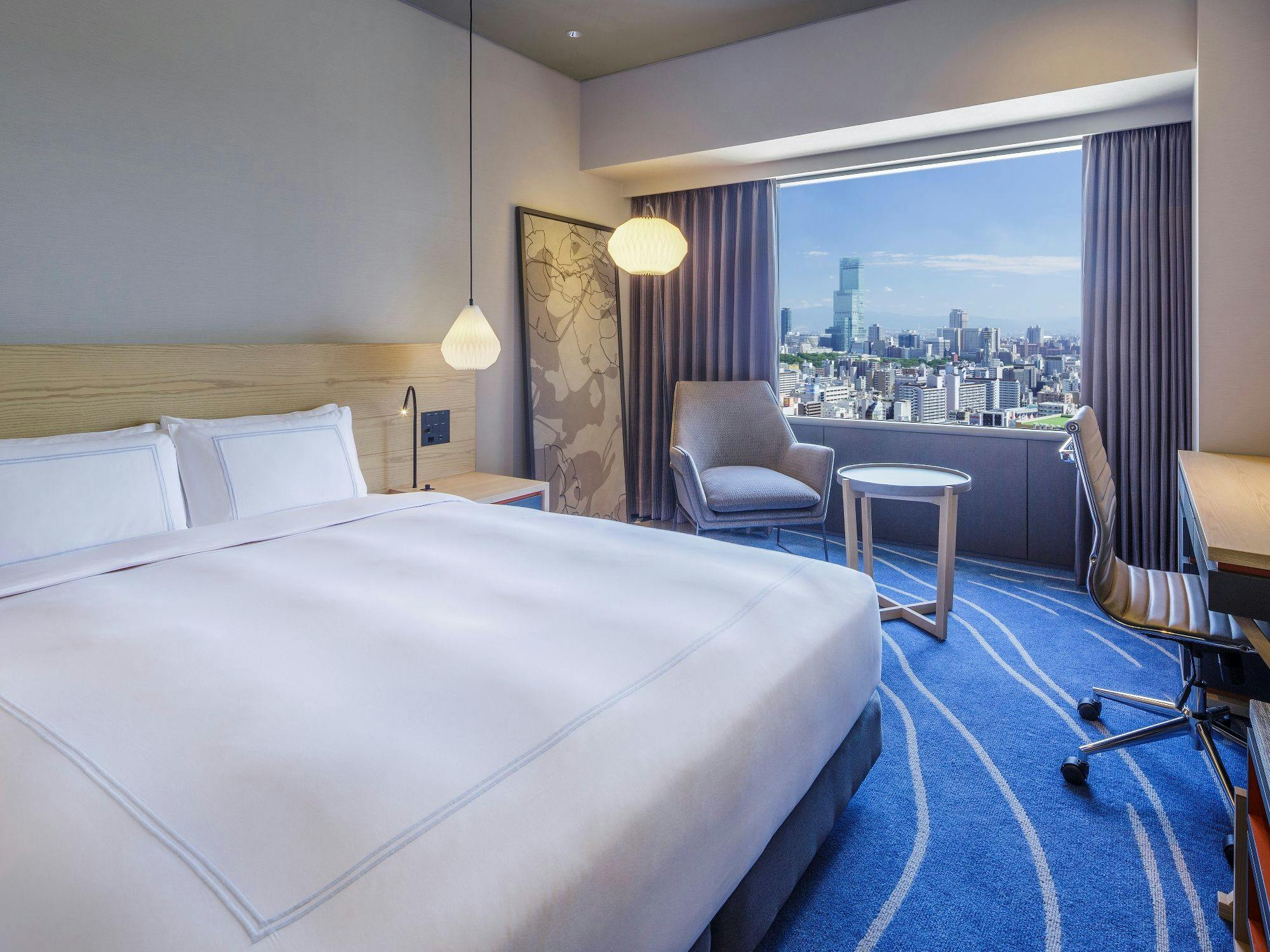広々としたデラックス スイートは、モダンな極上の快適さをご体感いただける空間です。リビングルームにはゆったりとしたワークスペースが設けられ、55インチの大型フラットスクリーンTVを完備しています。開放的な窓からは大阪市街のパノラマビューをお楽しみいただけます。
