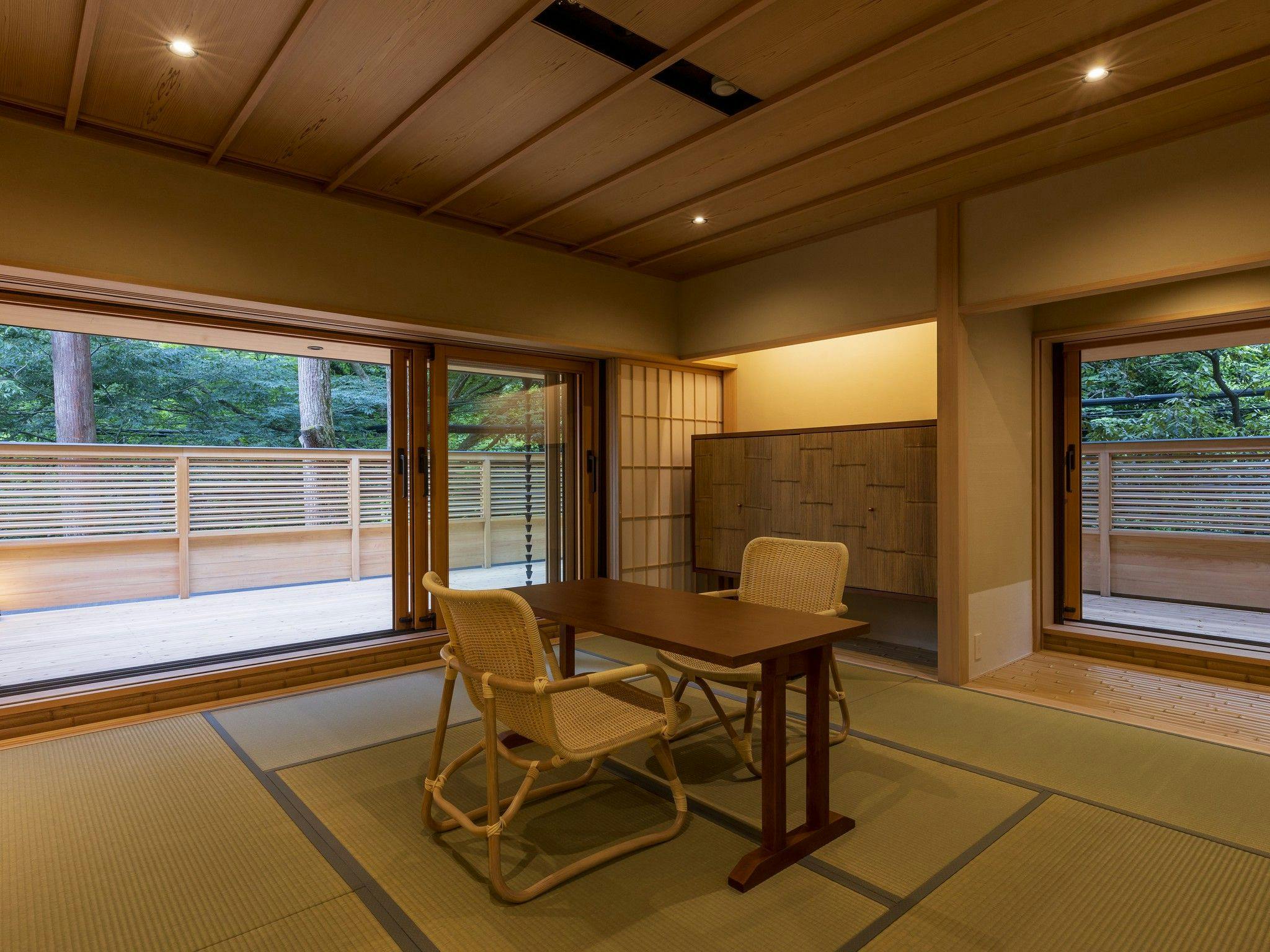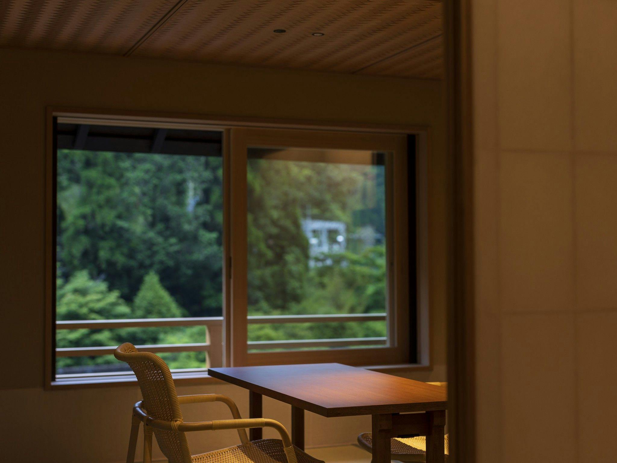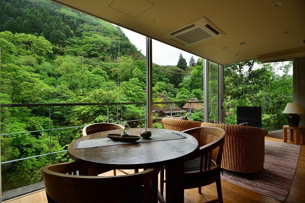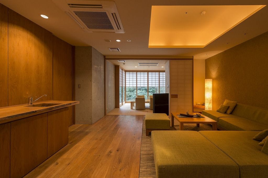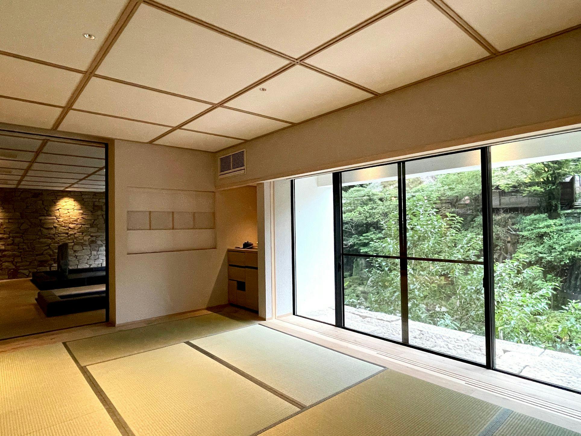 客室中央の広々としたサロン空間が、川の流れに沿うように和室・露天風呂・寝室の各スペースをつなぎ、障子を開け放てば天降川の眺めが拡がります。