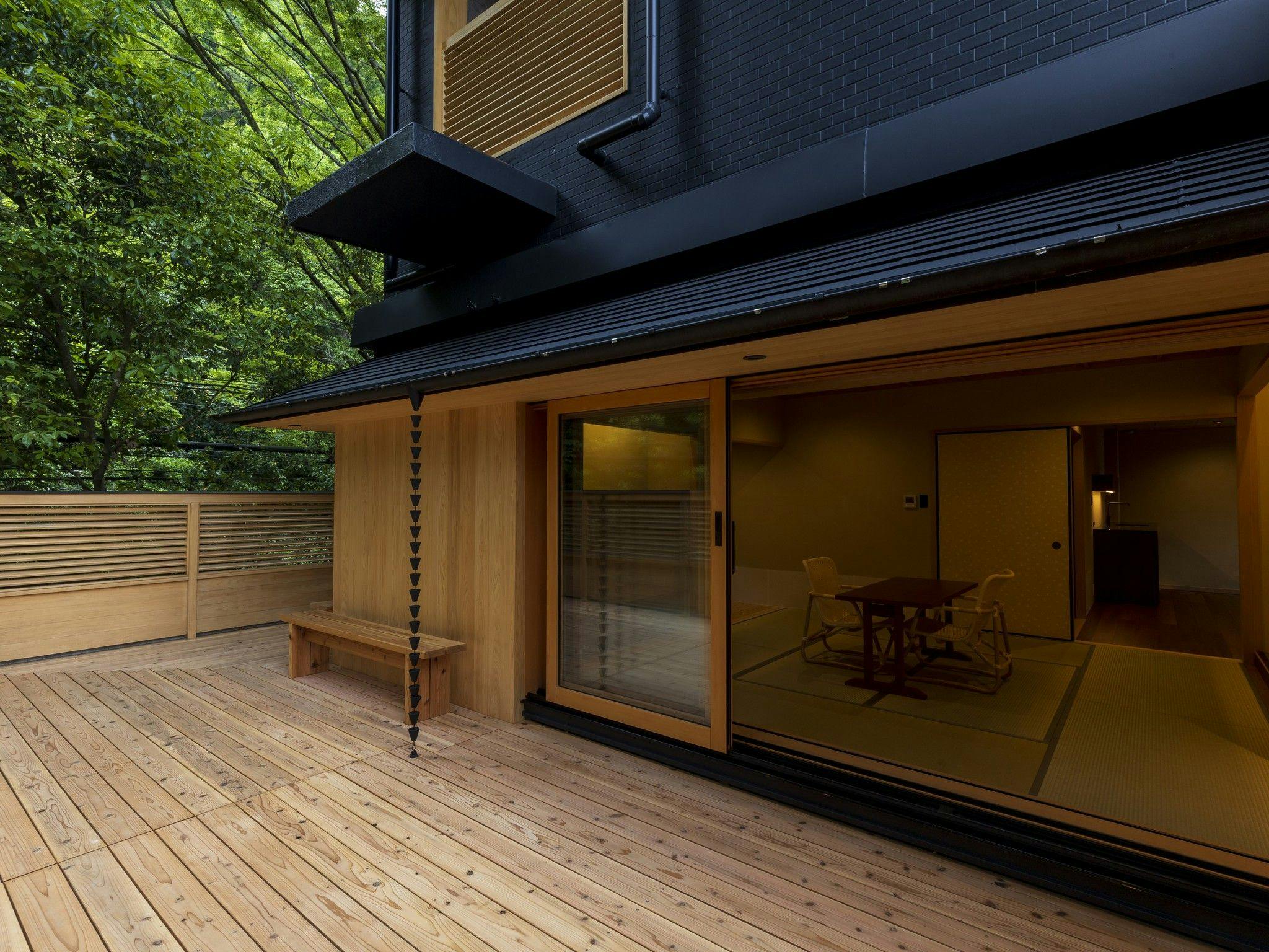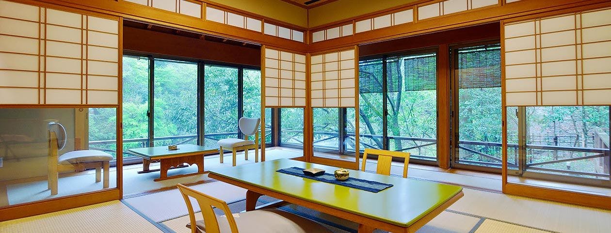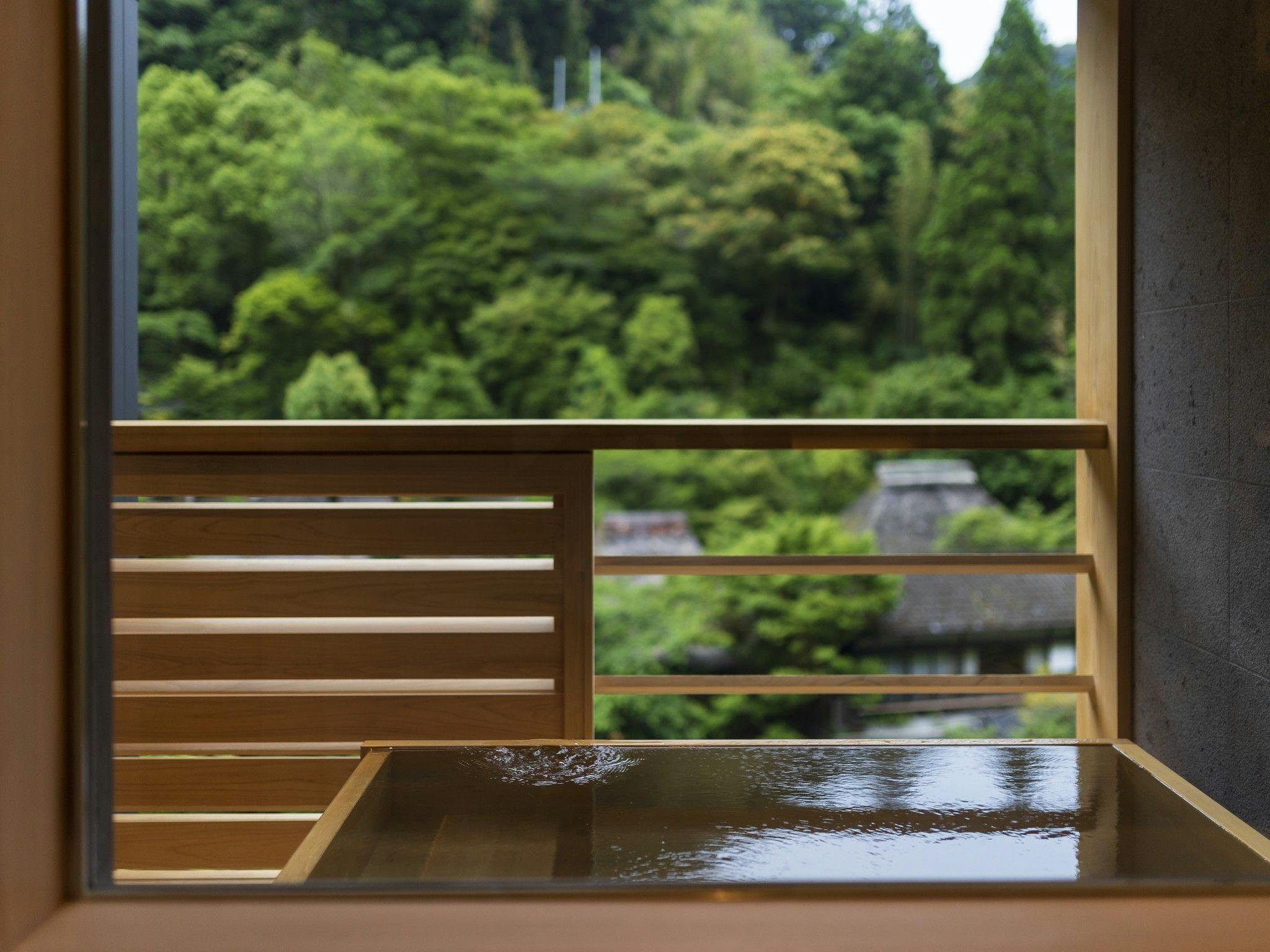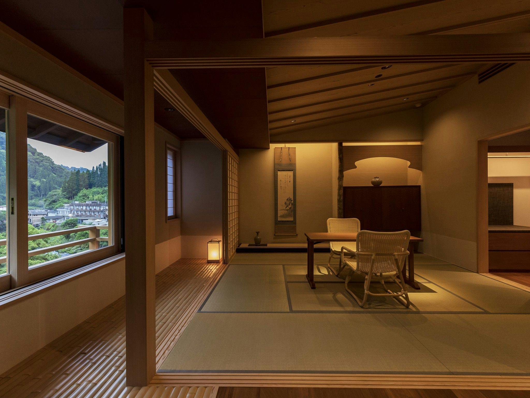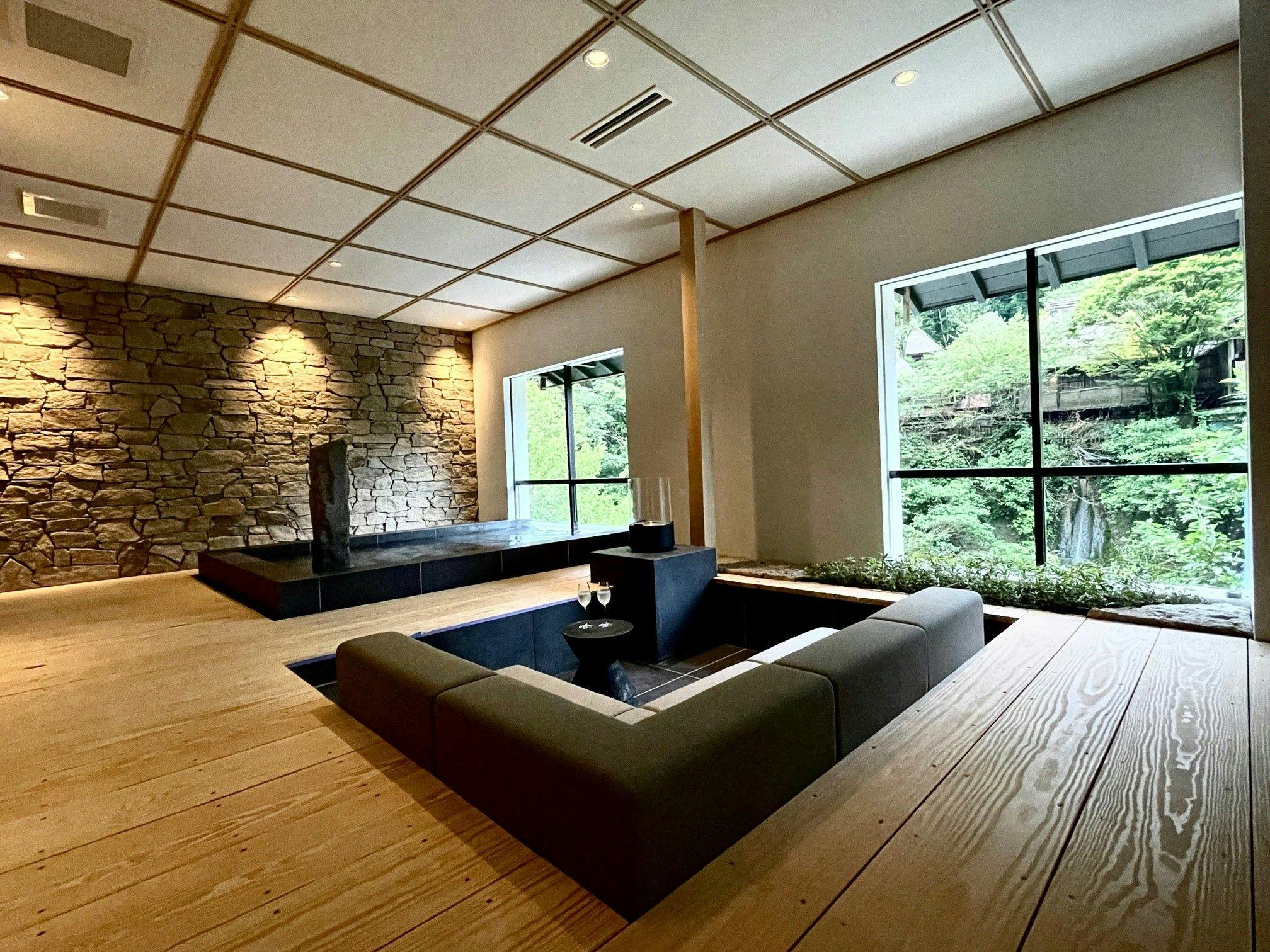 客室中央の広々としたサロン空間が、川の流れに沿うように和室・露天風呂・寝室の各スペースをつなぎ、障子を開け放てば天降川の眺めが拡がります。