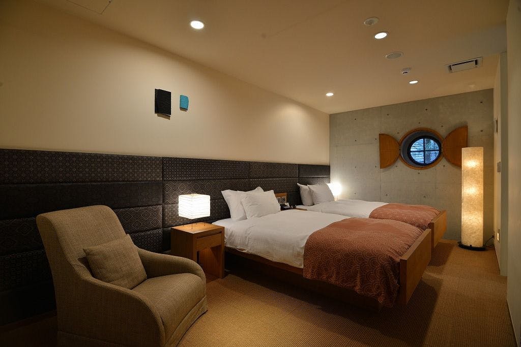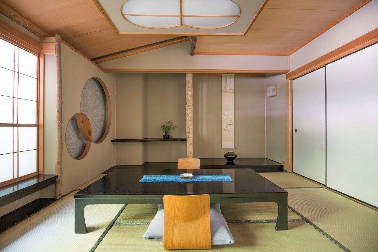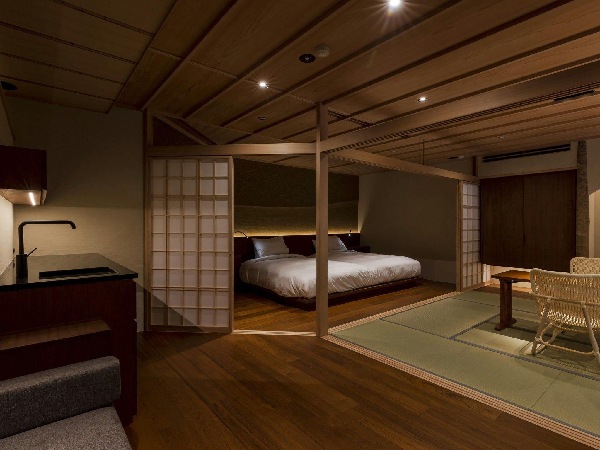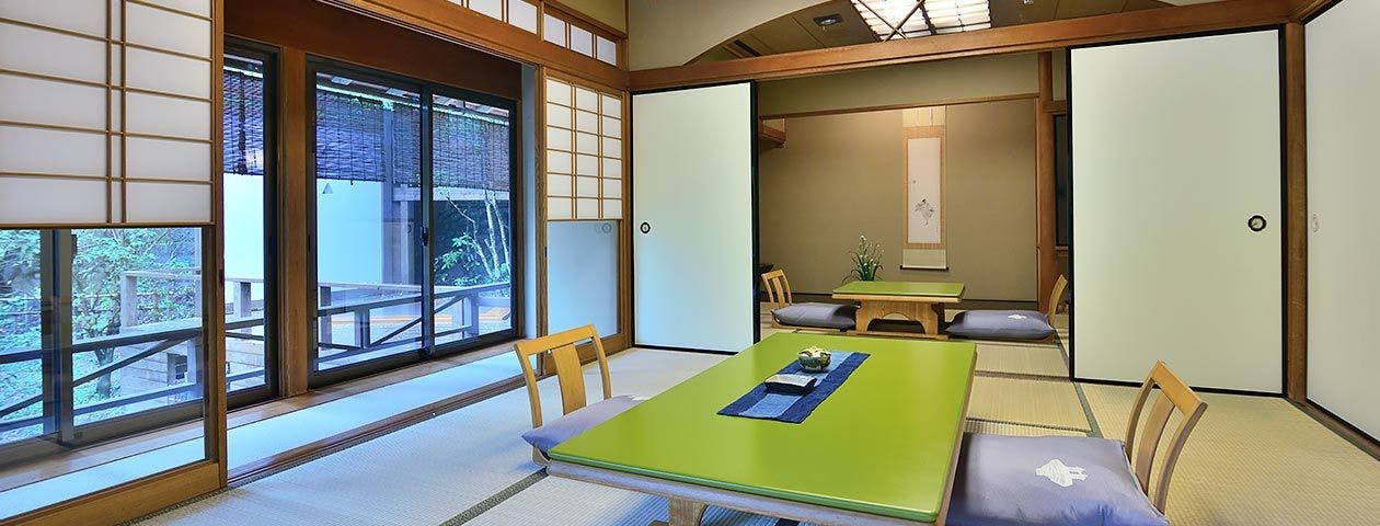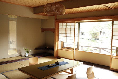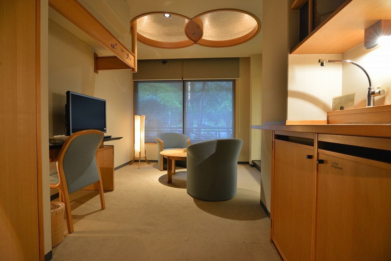 客室中央の広々としたサロン空間が、川の流れに沿うように和室・露天風呂・寝室の各スペースをつなぎ、障子を開け放てば天降川の眺めが拡がります。