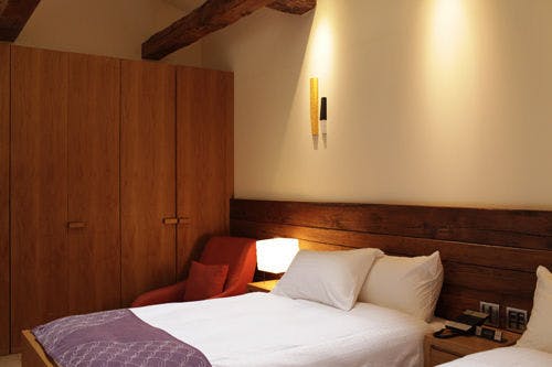 本間、ベッドルームはそれぞれ独立した空間で、樹木が迫る落ち着いた雰囲気を持ちます。
