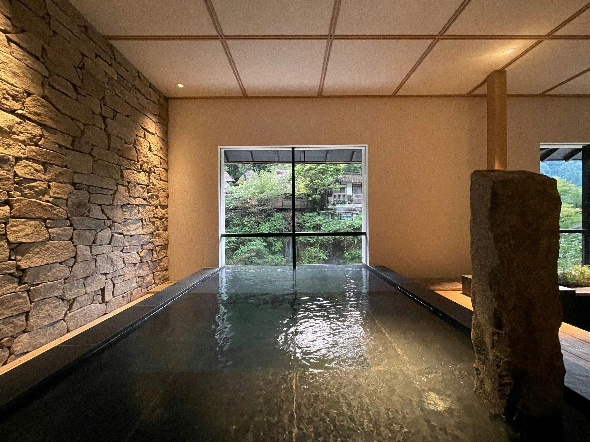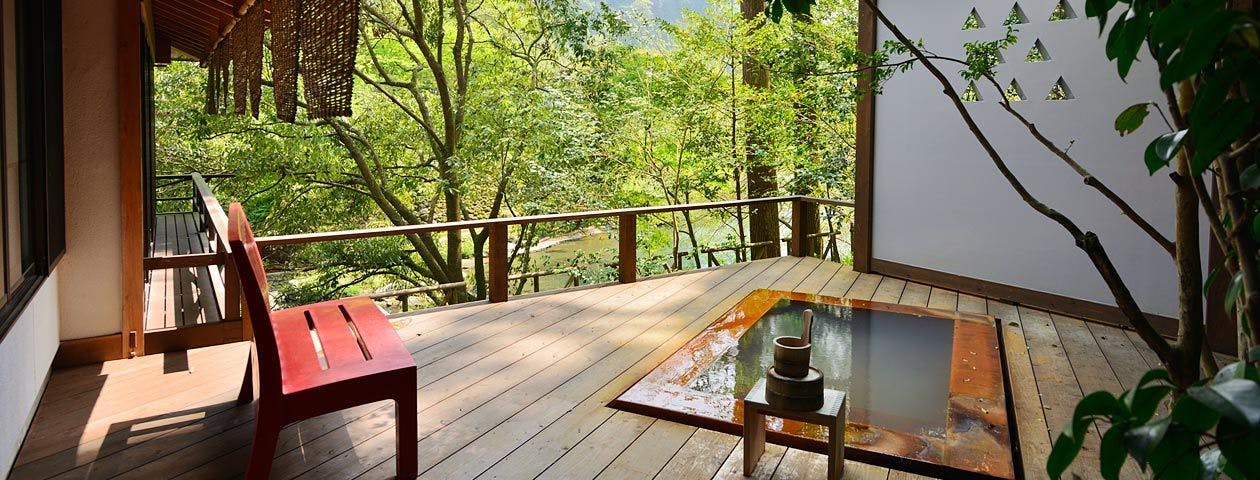 露天風呂はコーナーが解放され、天降川を臨む開放的な風景が楽しめます。
