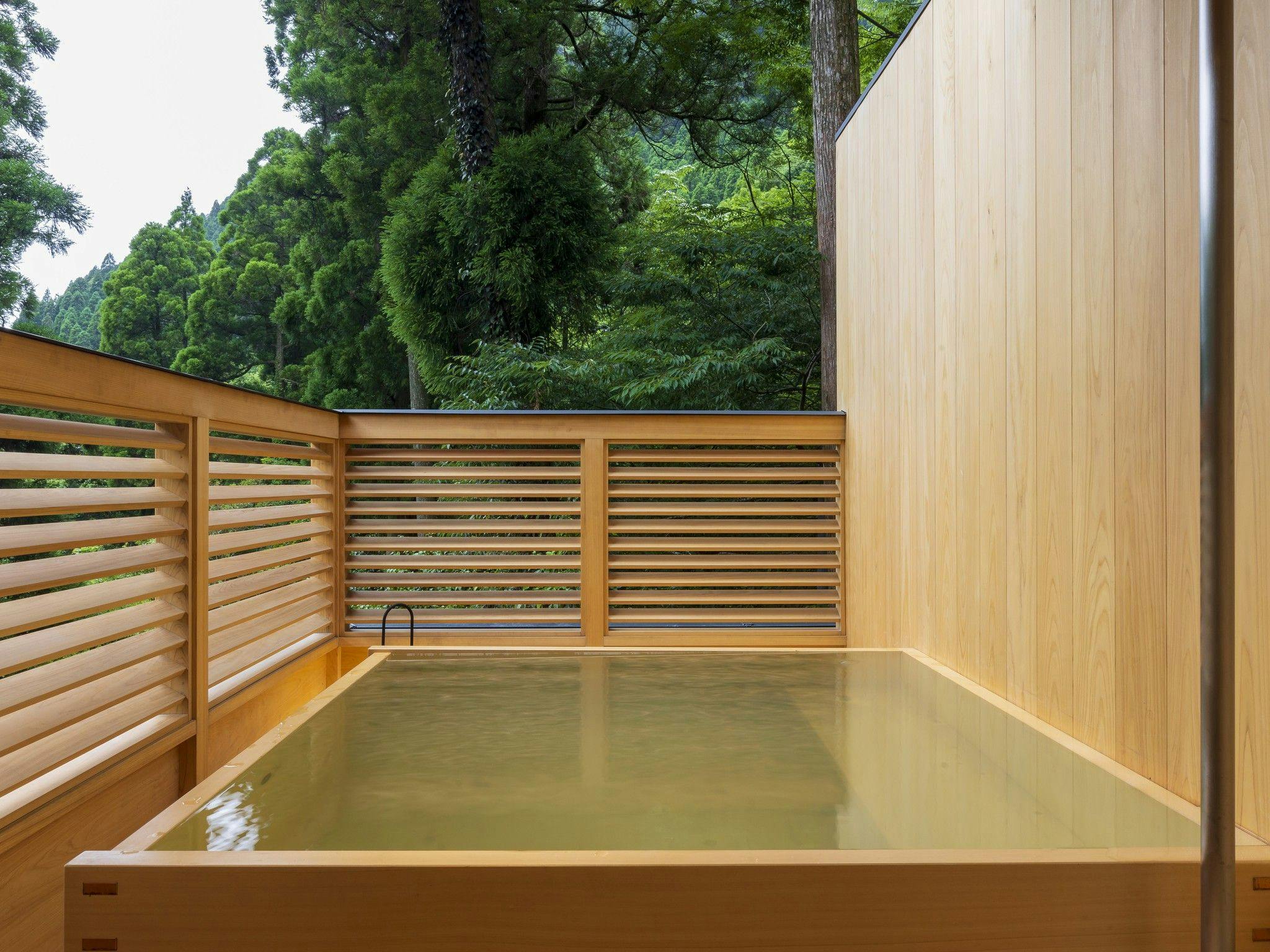 露天風呂からは、杉の木立とその奥に広がる渓谷の風景が楽しめます。