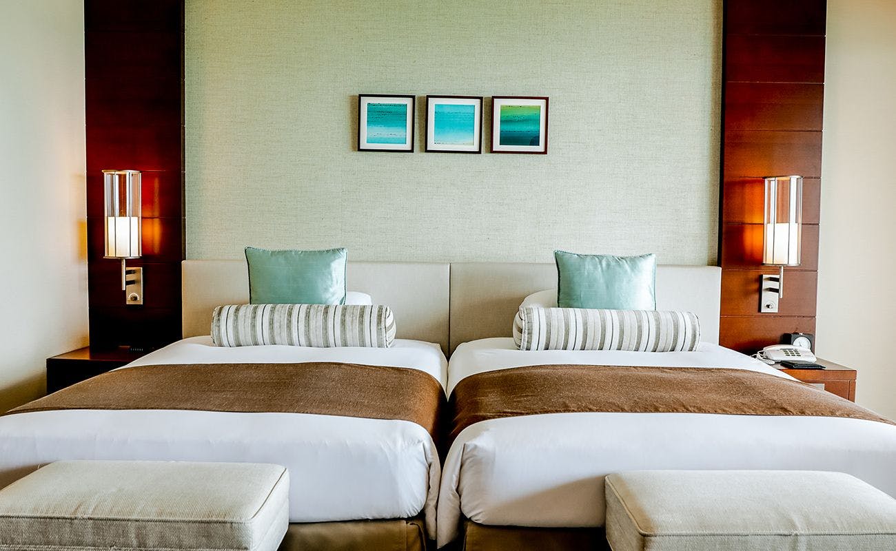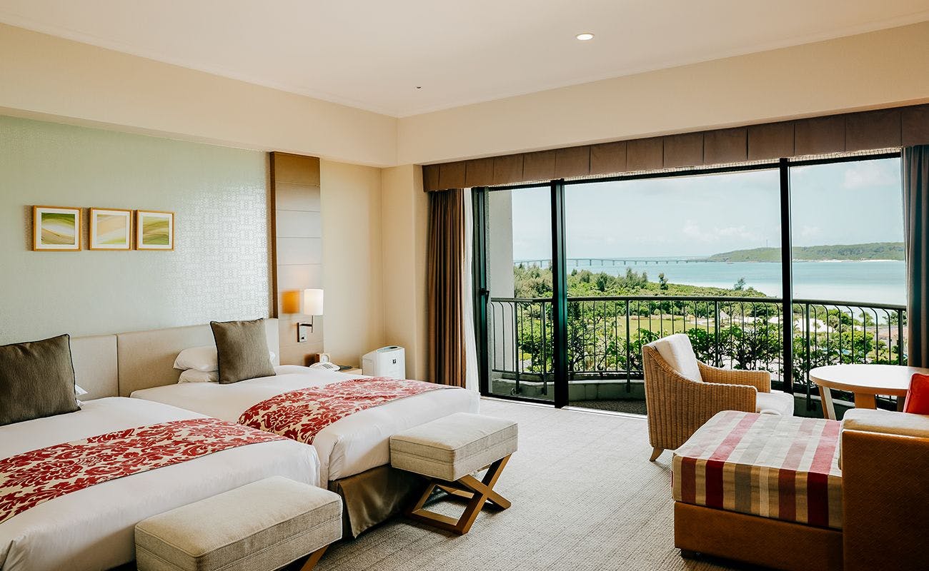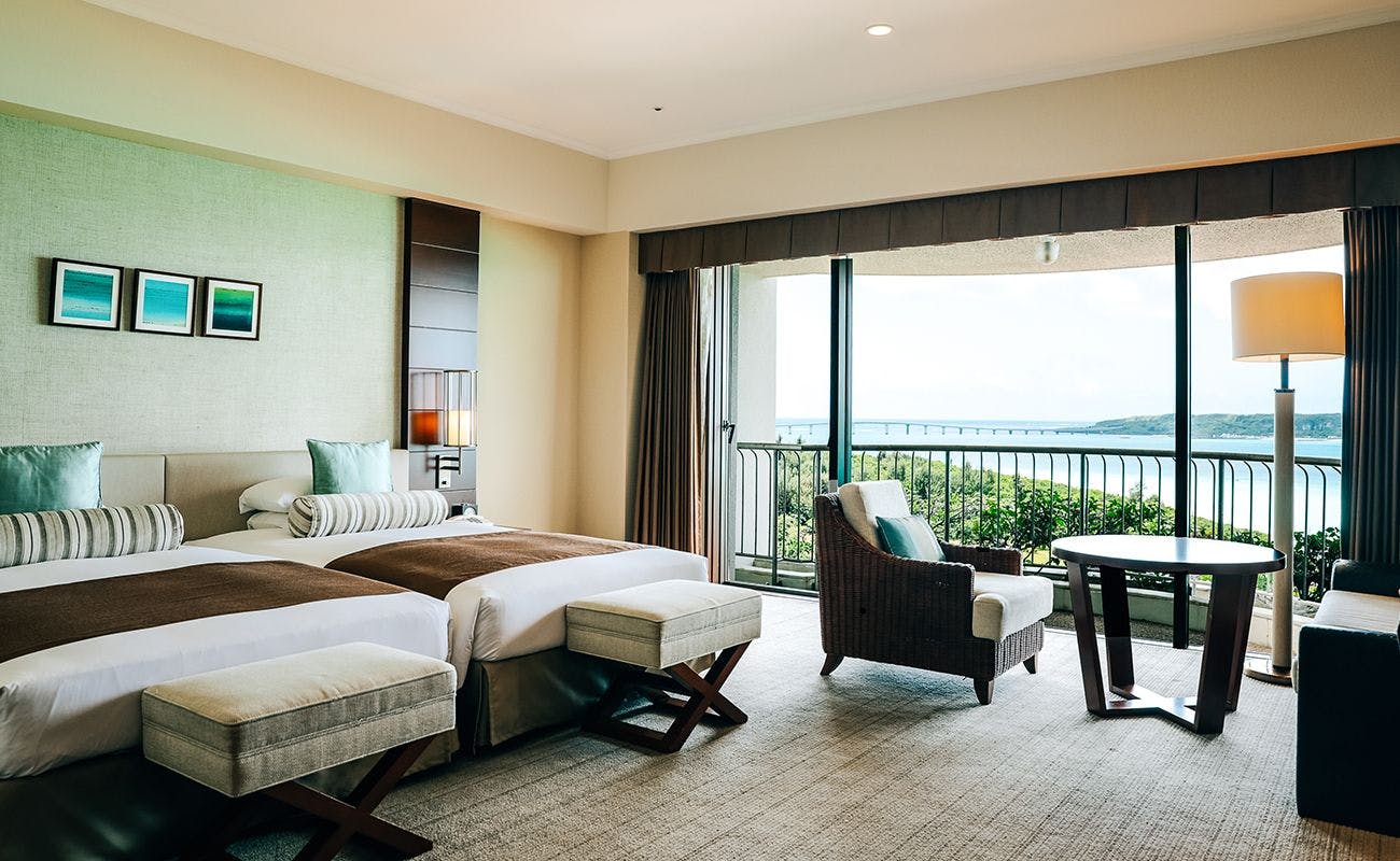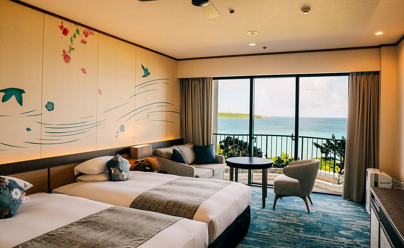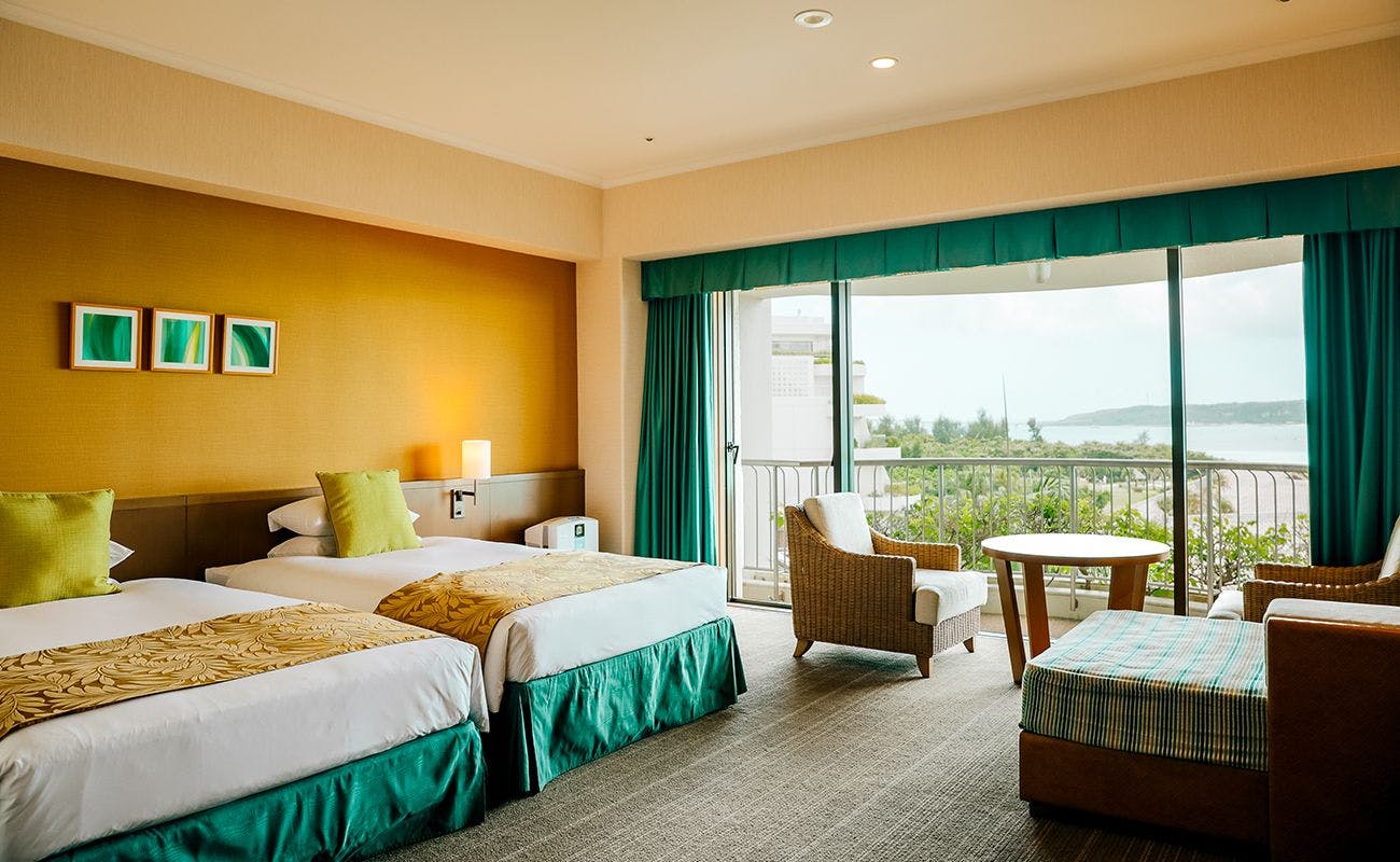 ■禁煙プレミアムツイン/ワイドビュールーム(コーラルウィング)ゆったりと寛いでいただく空間をコンセプトに、カップルからグループまで幅広くご利用いただけます。ワイドビューの窓からは、エメラルドグリーンの海と開放的な空をご堪能いただけます。※3名様でご利用の場合、エキストラベッド対応となります。※コーラルウィングは全室禁煙ルームとなります。