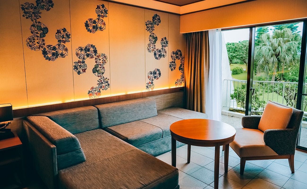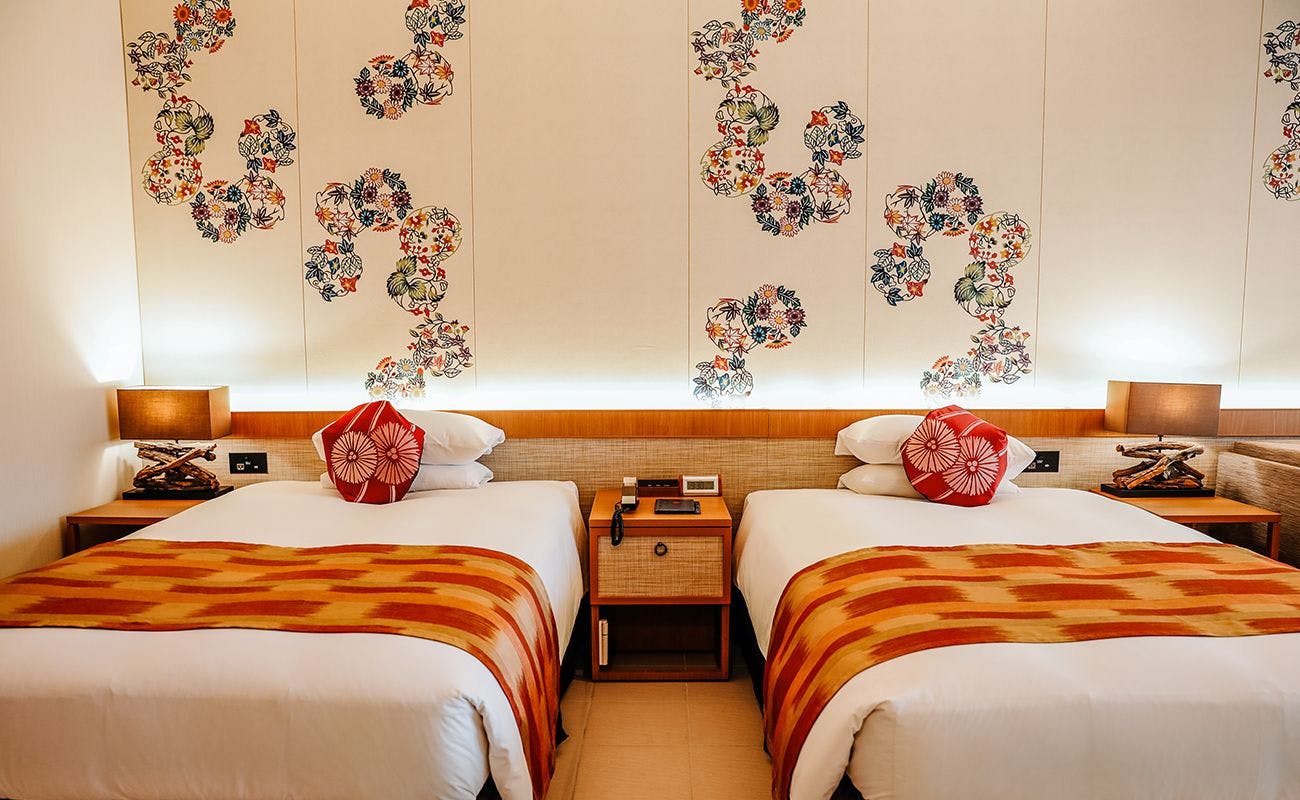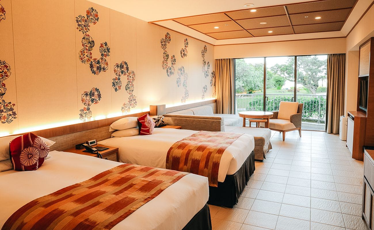 <オーシャンウィング>■ファミリー洋室ツインルームの奥に広々としたスペースがあり、ご家族やグループでゆったり過ごせます。紅型が装飾され、お部屋で寛ぎながら沖縄を感じられるのが魅力です。※ガーデンビュー(オーシャンウィング1階)※正ベッド2台のお部屋です。 3名さま以上でご利用の場合、エキストラベッド対応となります。※2018年3月リニューアル