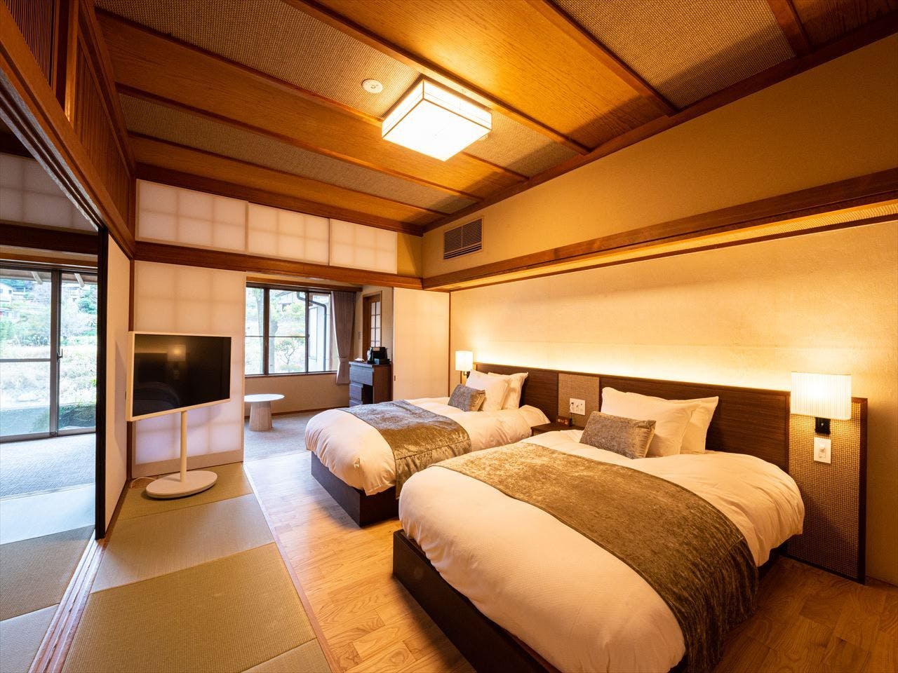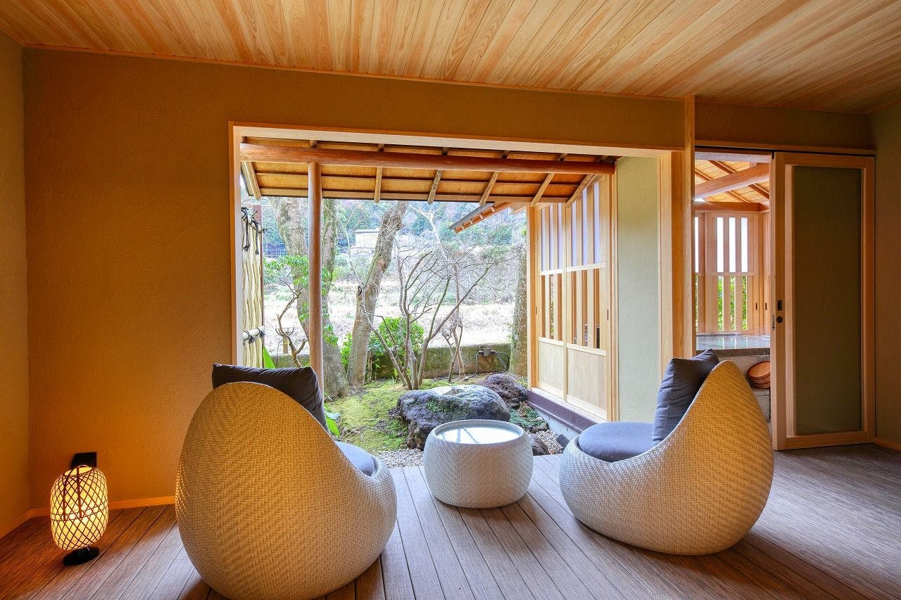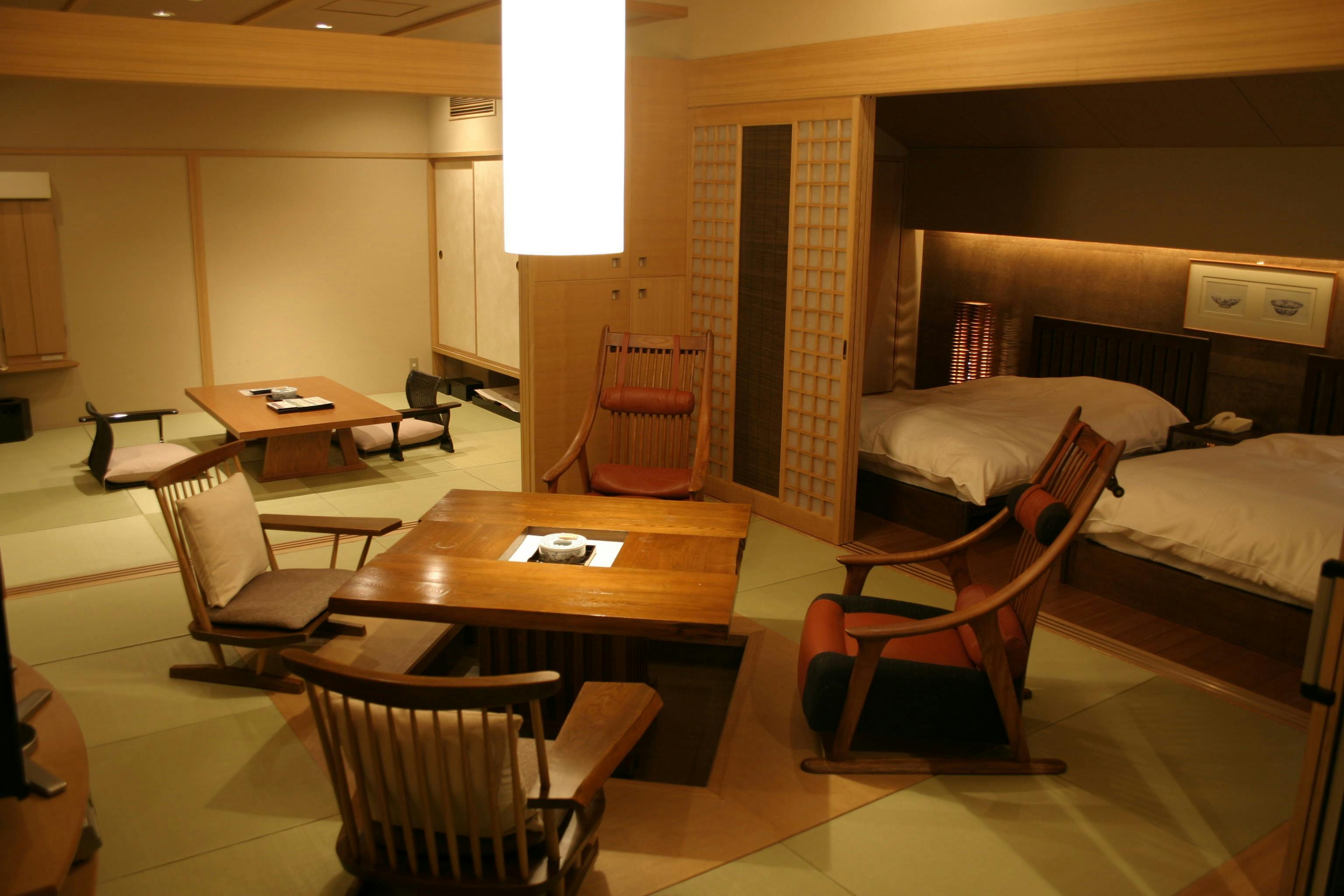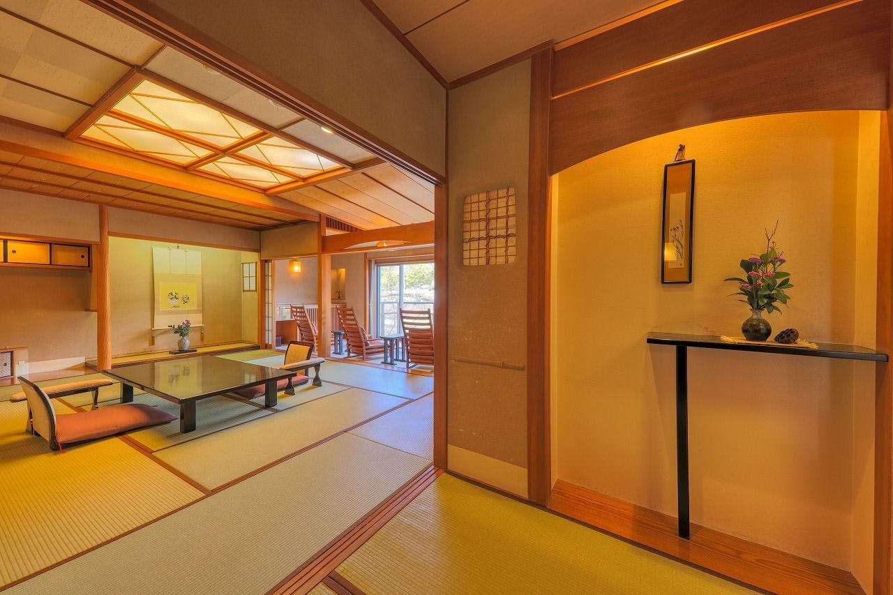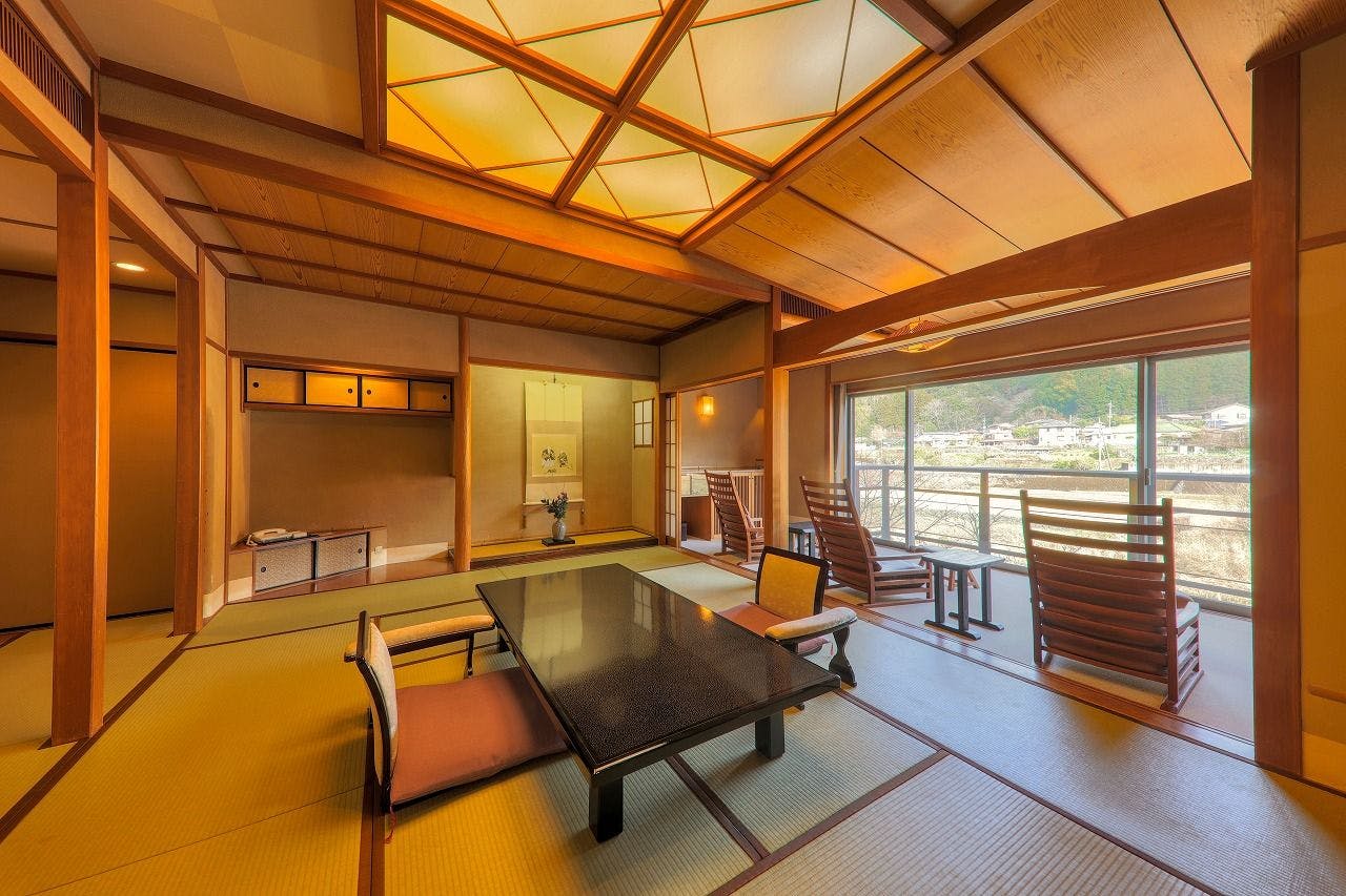 寝室にベッド又は和ベットとリビングをしつらえ、モダンな家具を配置した和洋室。2世代のご家族やお仲間同士で、プライバシーは確保しながらも和気あいあいと使用していただける、充実な広さのお部屋になっております。全室、山々や狩野川を見渡せる露天風呂付きです。