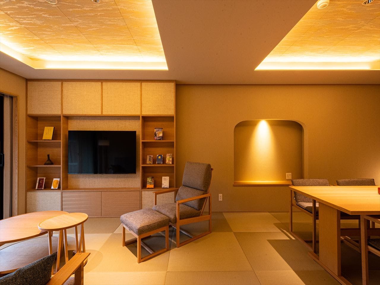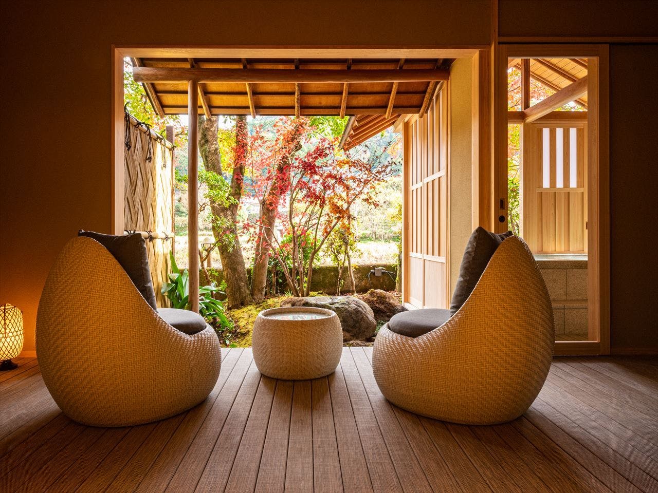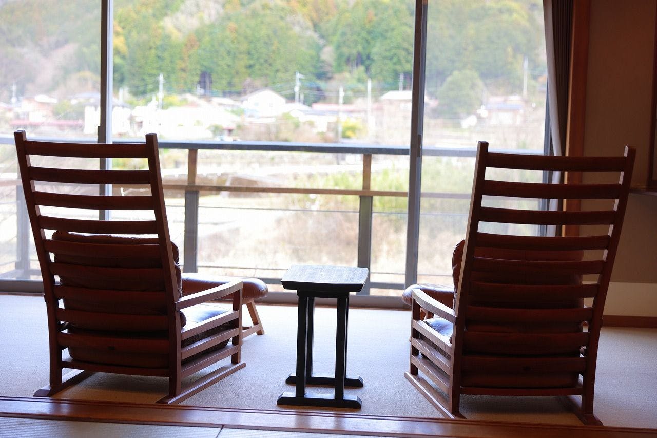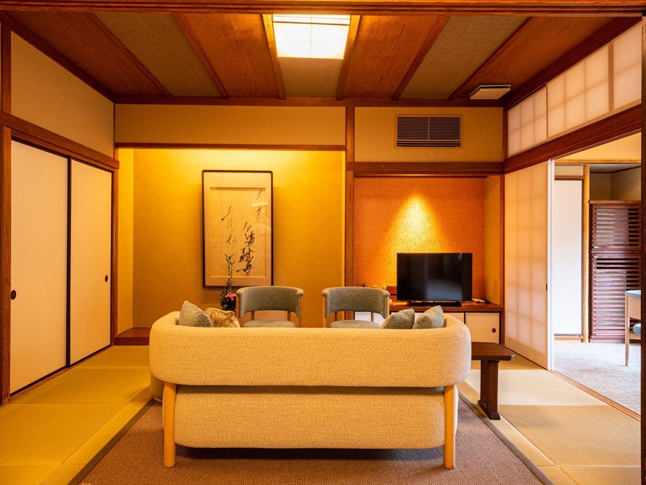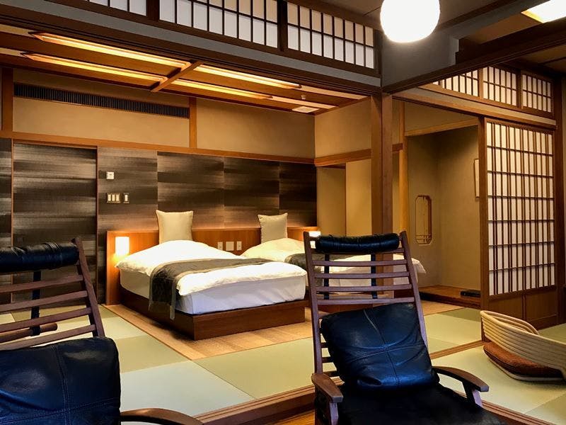寝室にベッド又は和ベットとリビングをしつらえ、モダンな家具を配置した和洋室。2世代のご家族やお仲間同士で、プライバシーは確保しながらも和気あいあいと使用していただける、充実な広さのお部屋になっております。全室、山々や狩野川を見渡せる露天風呂付きです。
