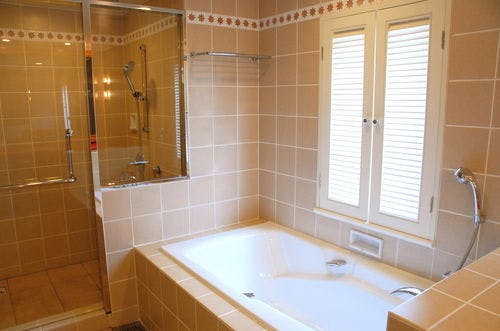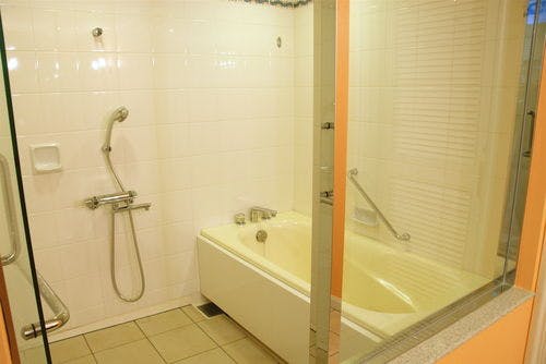 バスタブと洗い場が別のバスルーム、羽毛掛布団、デュベカバー、