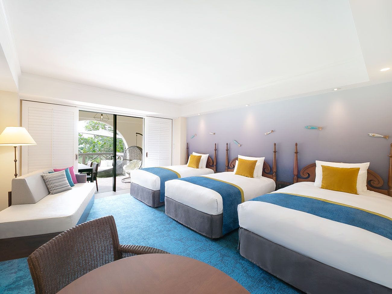 全体的にマリンブルーの色調に統一された客室は、まるで海の中で過ごしているような癒しの空間