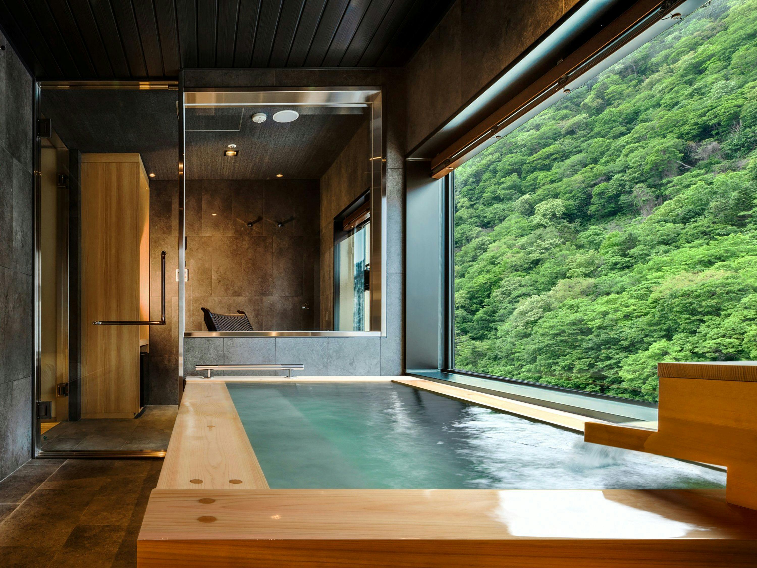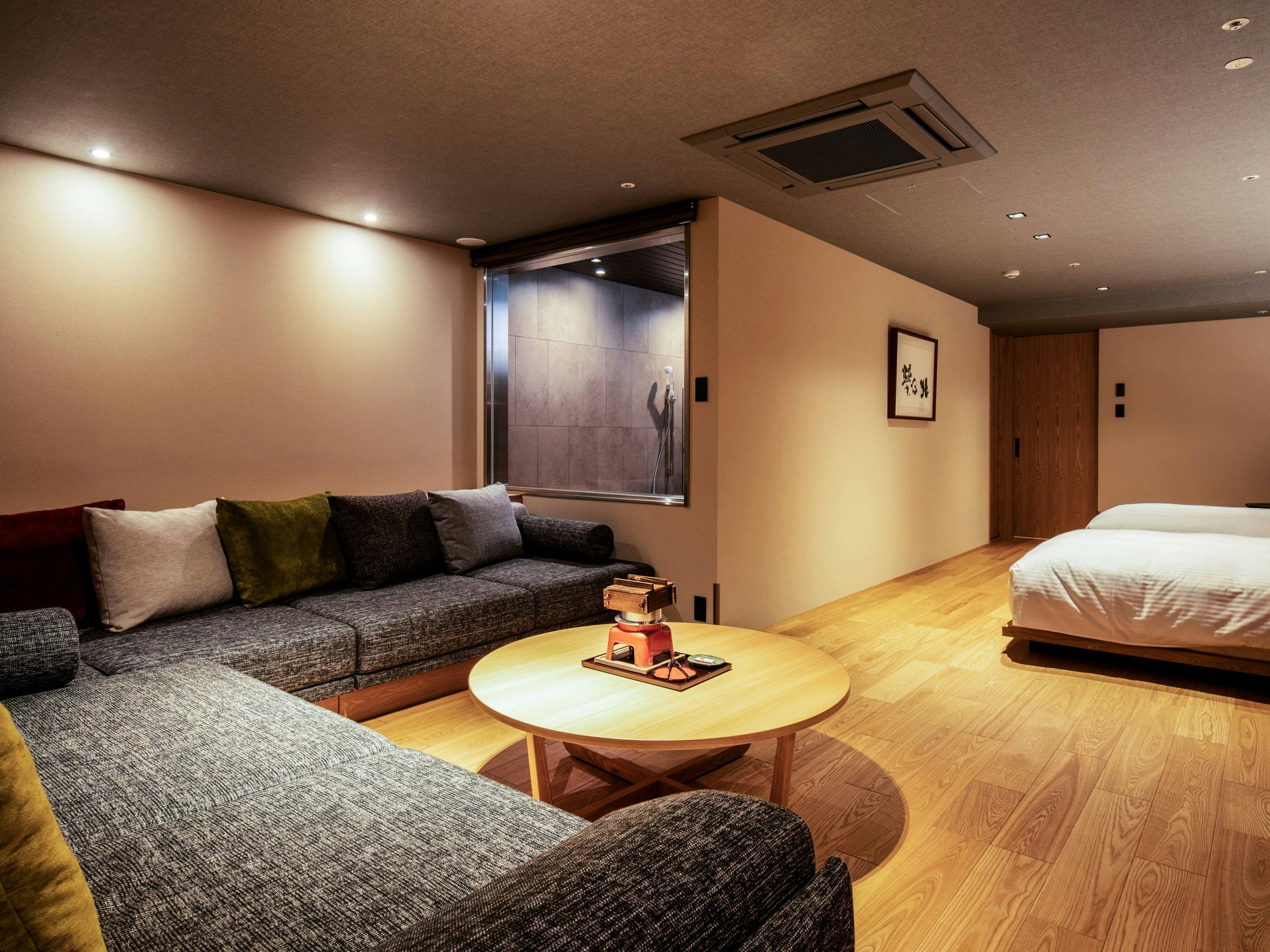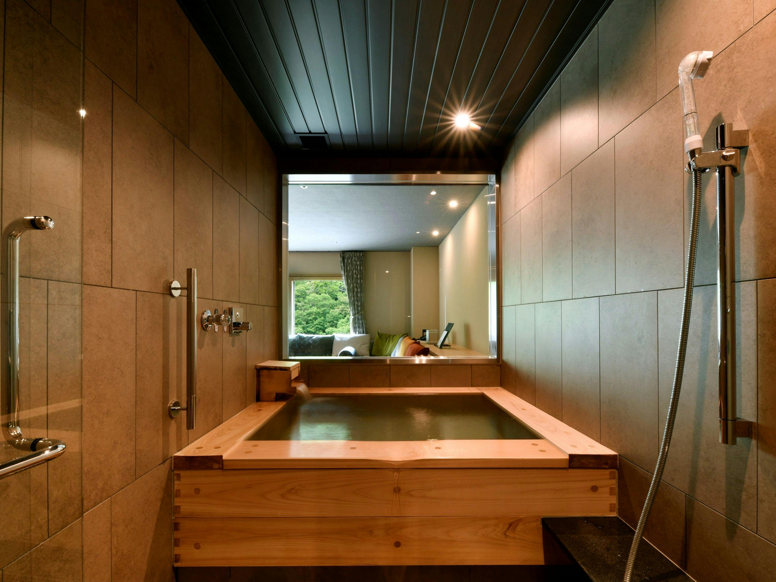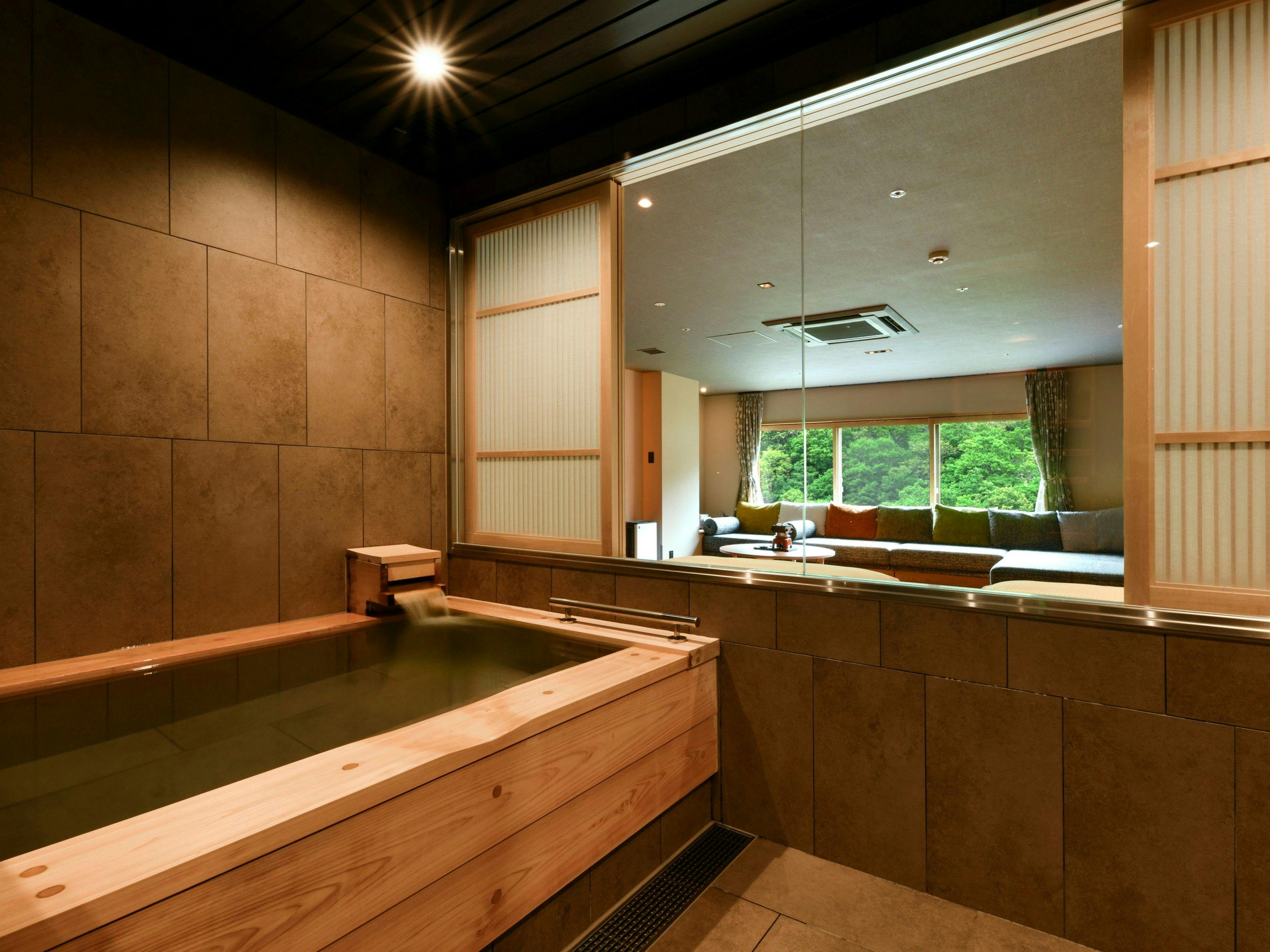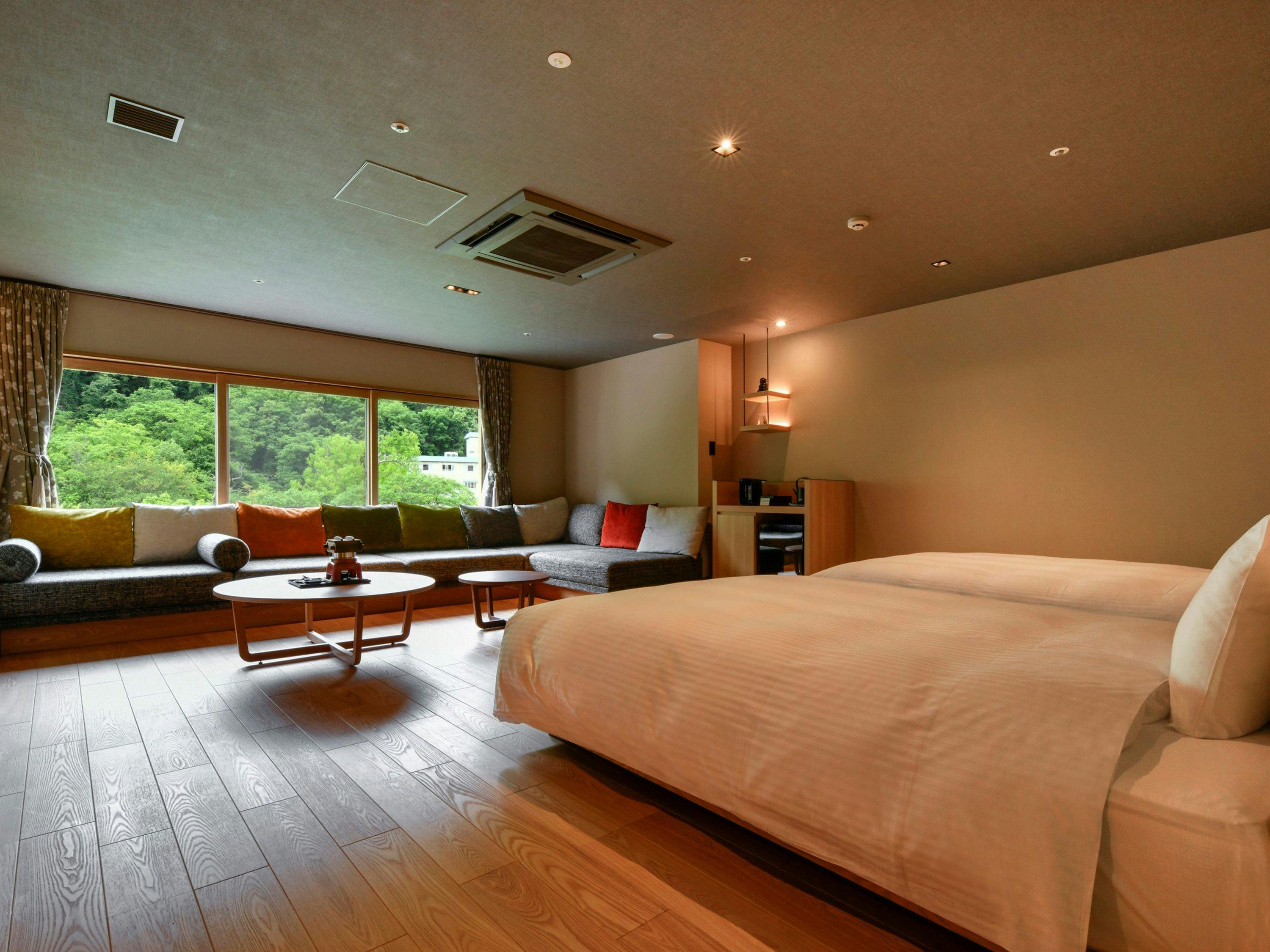 窓際に配した広々としたソファ、木の香りを愉しむ温泉付き浴槽、シモンズ社製のダブルベッド。