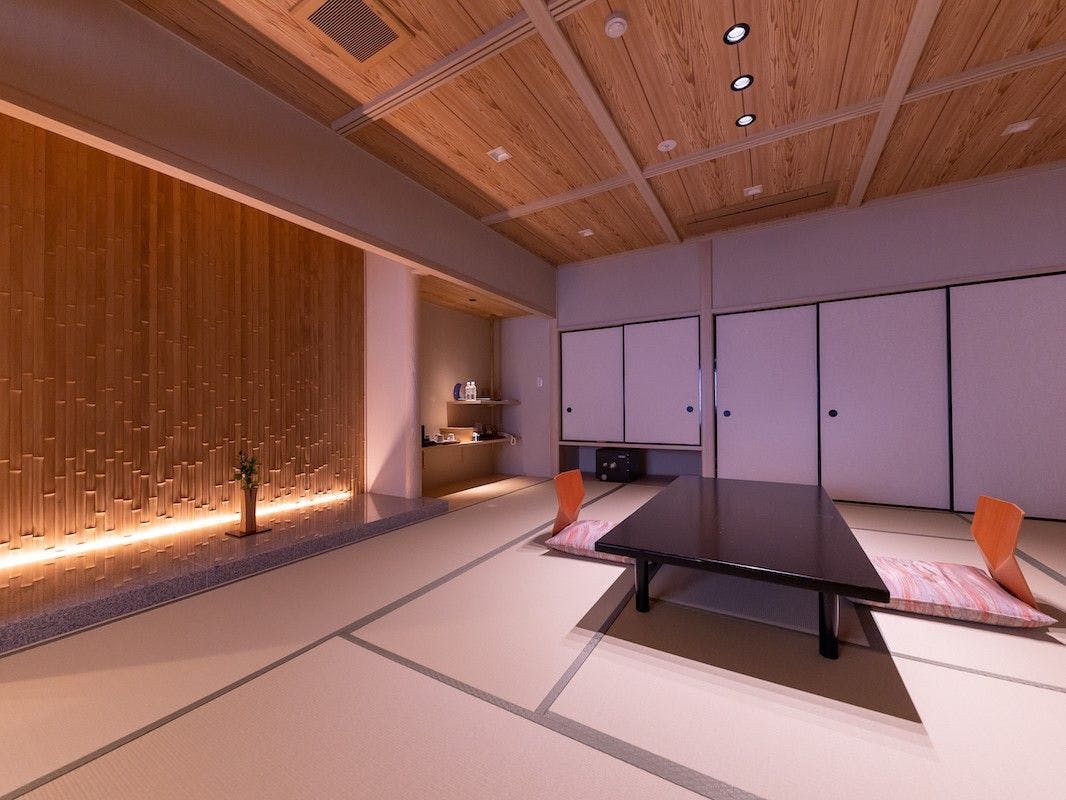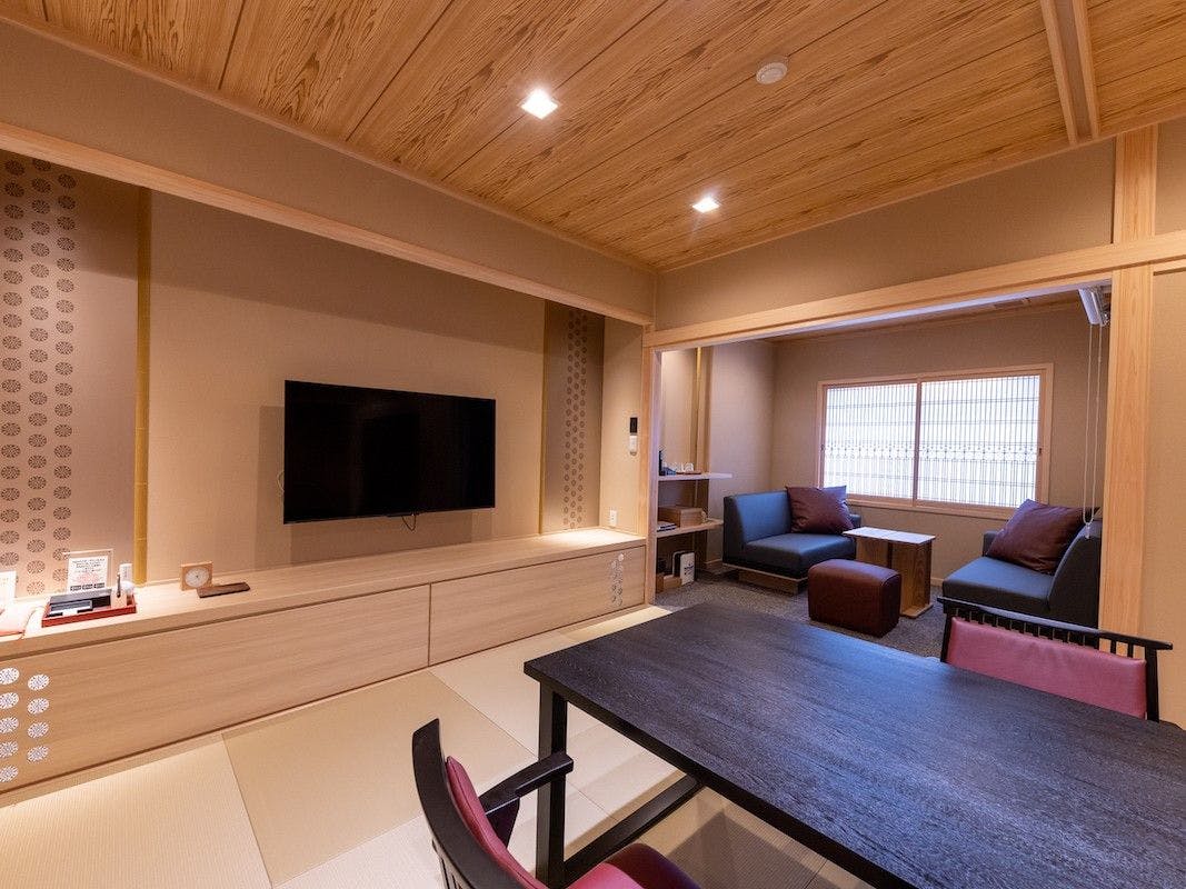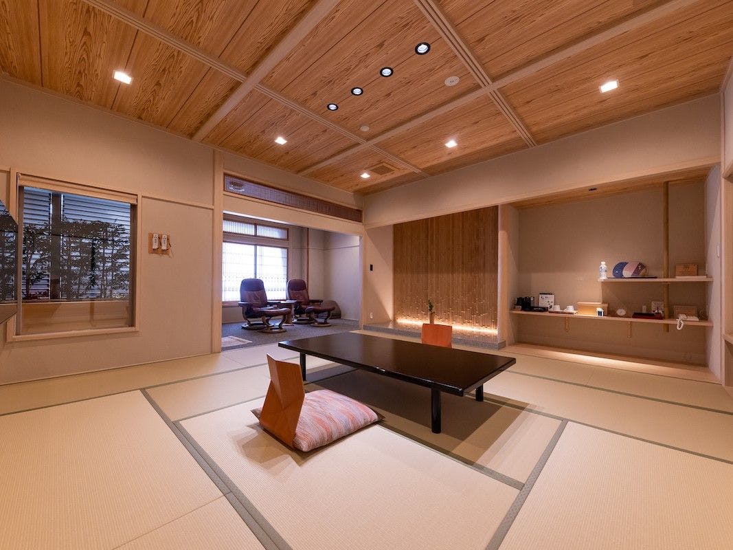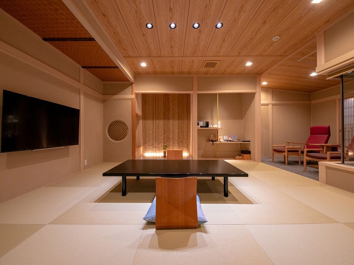 12.5畳以上の広い間取りです。広縁には小テーブルとチェアがございます。全室に日本の伝統紋様を織り込んだ、工芸品レベルの組子障子を使用しています。