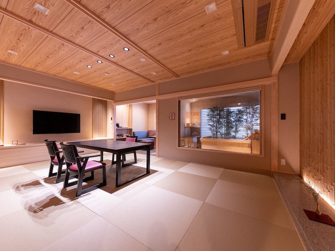 当館が開発した全天候型の「室内露天風呂」が付いた新タイプの露天付き客室。