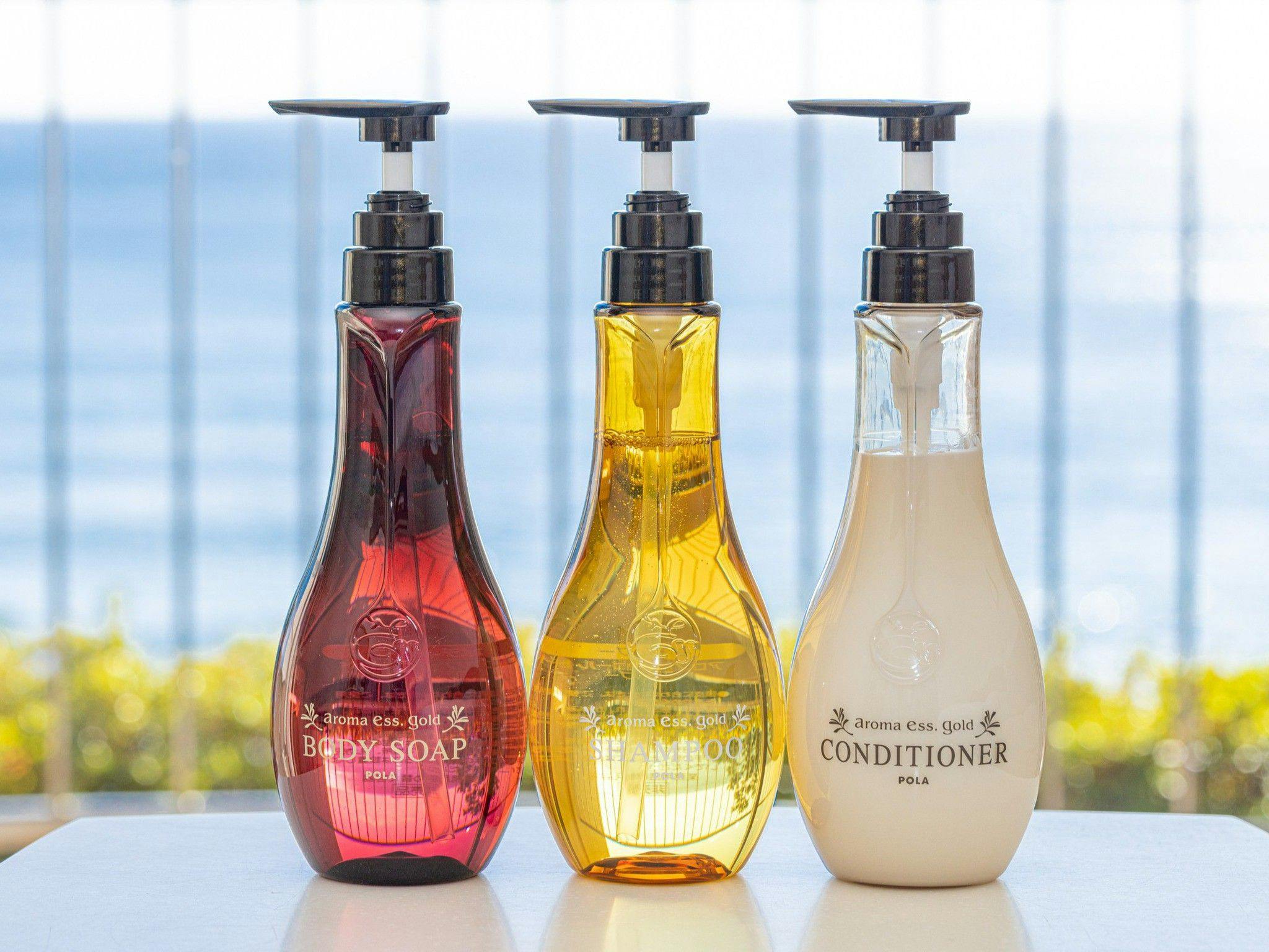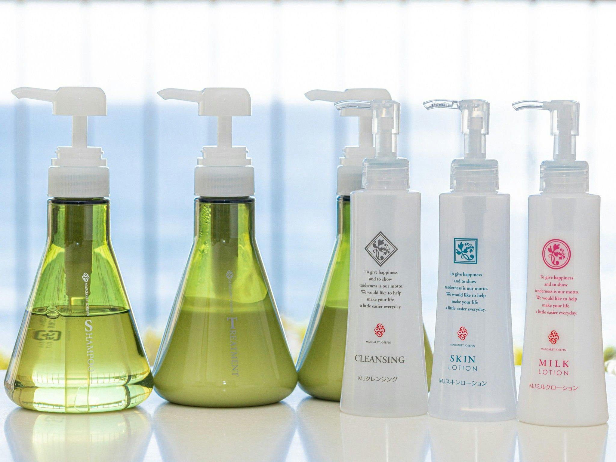 お茶セット・スリッパ・バスタオル・フェイスタオル・ハンドタオル・フェイス&ハンドソープ・ボディーソープ・シャンプー・コンディショナー・クレンジング・スキンローション・スキンミルク・歯磨きセット・ひげそり(シェービンングフォーム付き)・シャワーキャップ・ヘアブラシ・綿棒・コットン・ボディタオル・ヘアーターバン・ヘアゴム・ナイトウェア