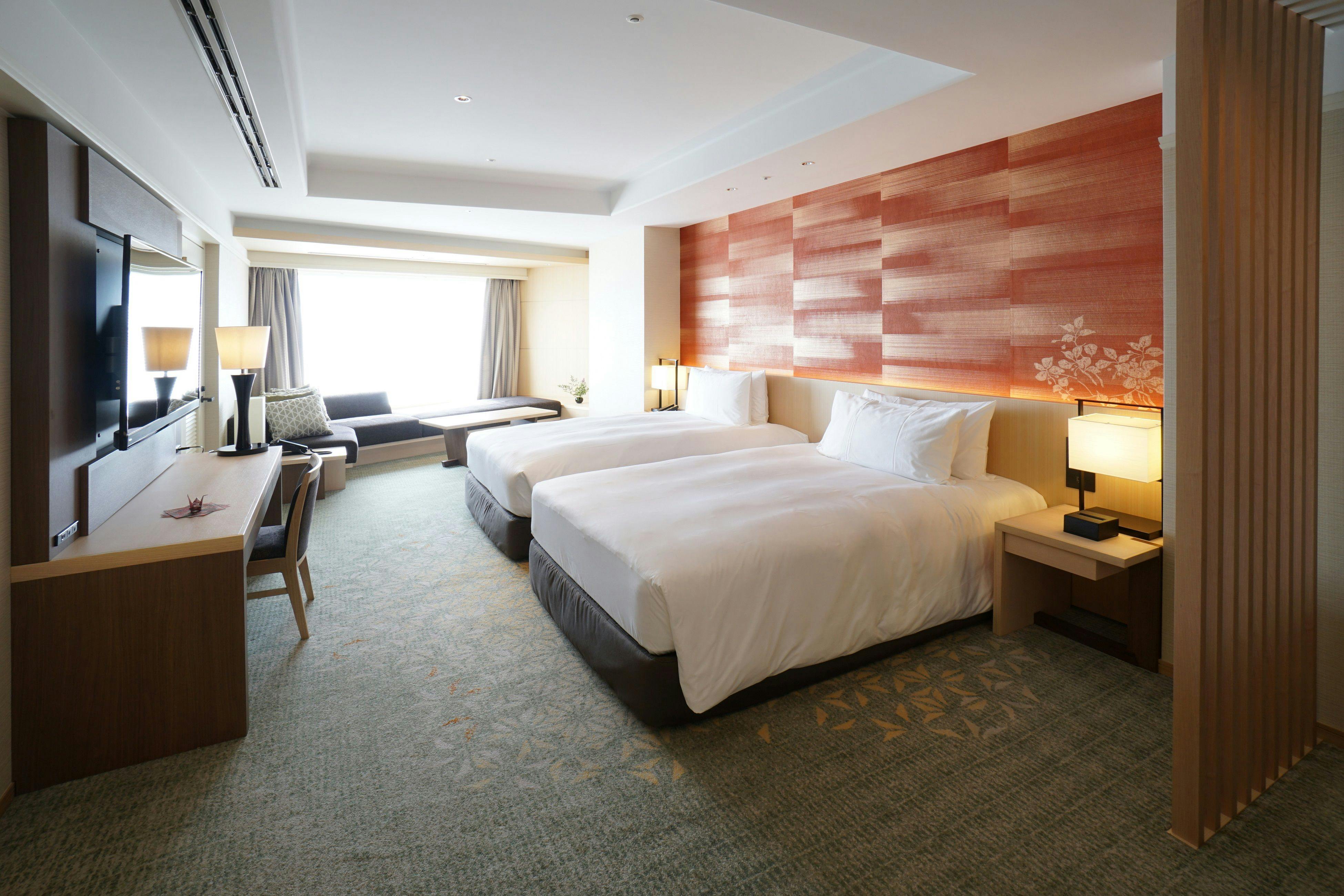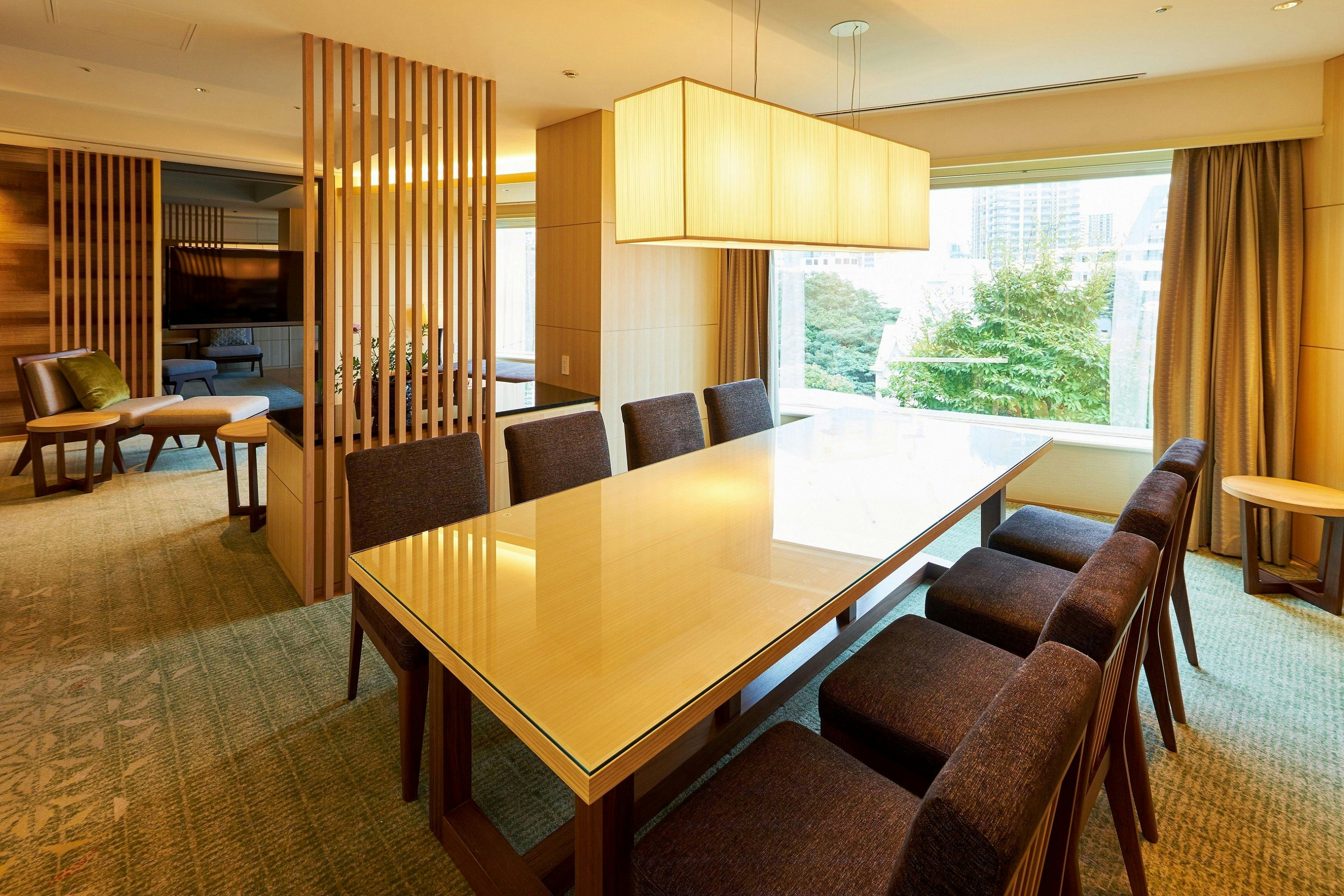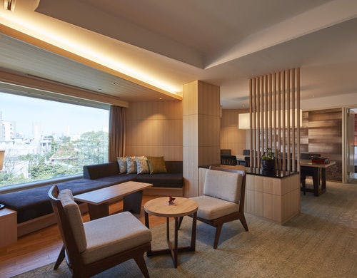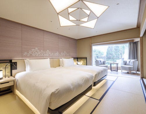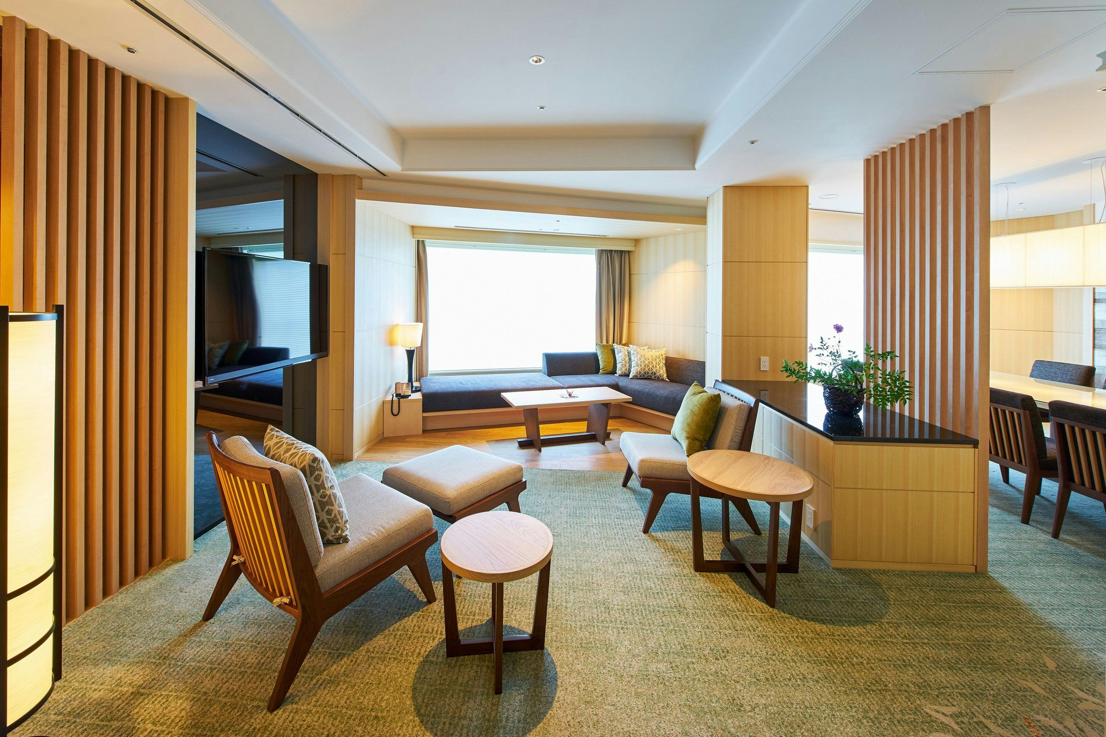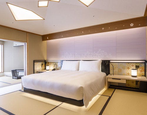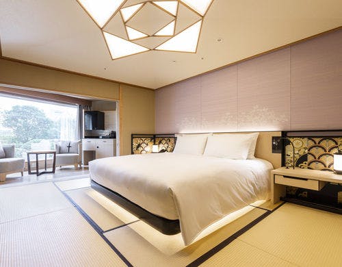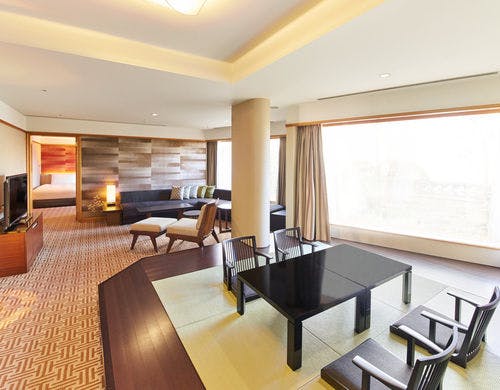 ホテル内唯一の120平米の角部屋の特別和洋室。緑豊かな庭園を望む大きな窓のリビングスペース。裸足でくつろげる琉球畳の敷かれた和のコーナーと、優雅なソファセットが置かれた洋のコーナーに分かれています。細部までこだわった家具が配された開放感のある空間で、ゆったりとおくつろぎいただけます。
