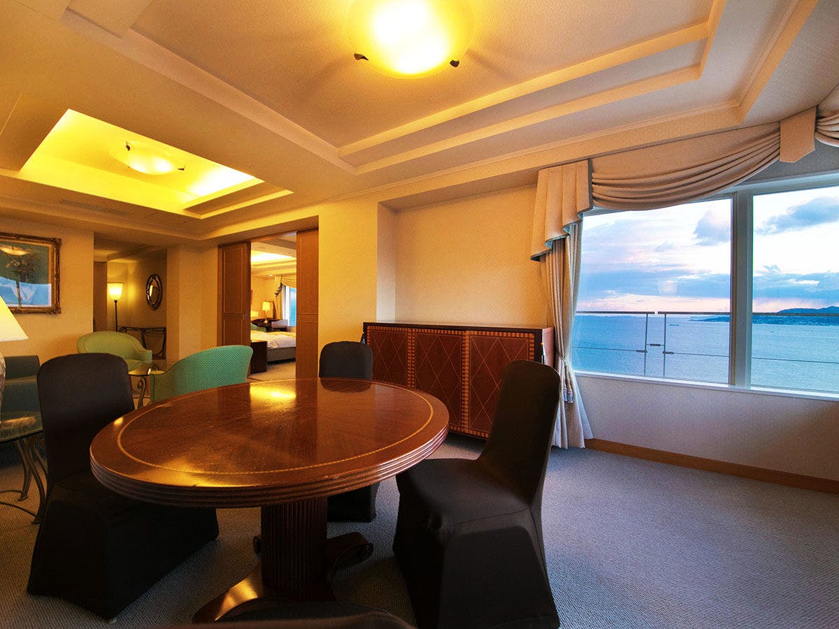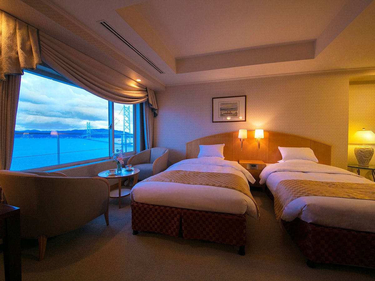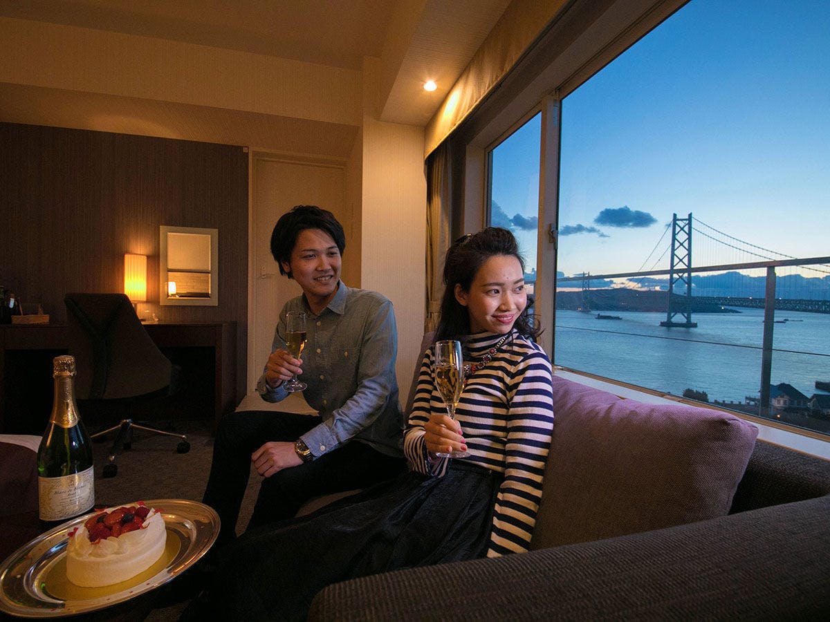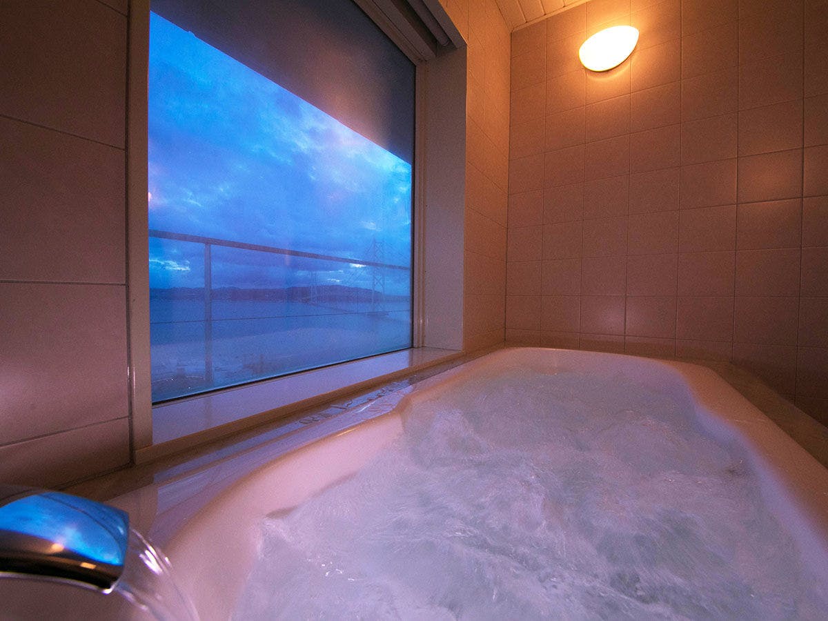 刻々と染まりゆく空と海とのグラデーション、そして窓いっぱいに広がる雄大な明石海峡大橋はここでしか味わえない特別な景色。