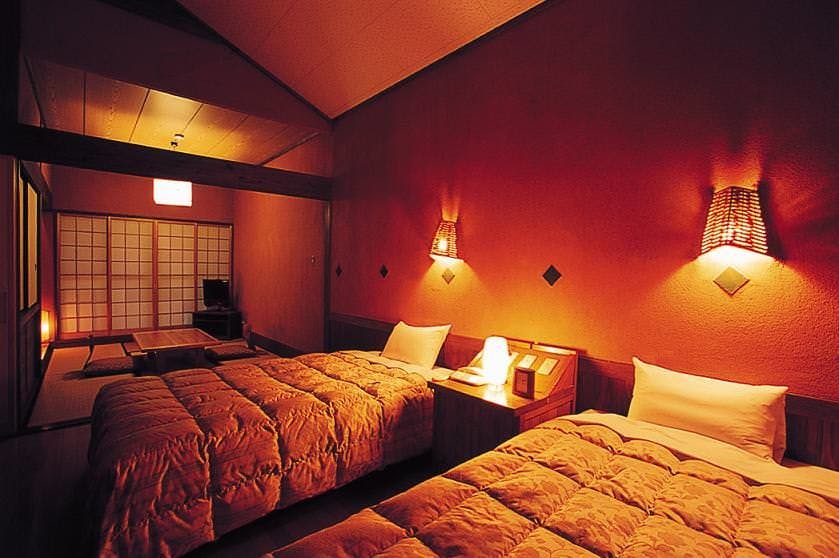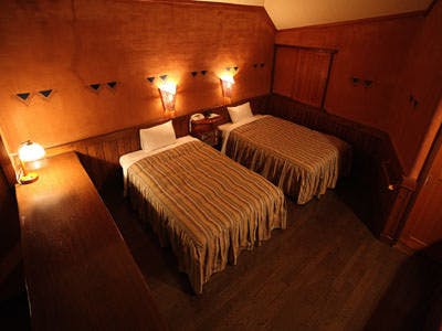 お部屋は上下段式のフローリングタイプとなります。上段がセミダブルベット2台の寝室スペース+洗面:トイレ。下段がリビングスペース+沐浴室となります。尚、3名様以上でのご利用の際は、下段にエキストラベットを配置させていただきます。お部屋は間接照明となりやや暗めのお部屋となりますが、就寝時は熟睡が出来る照明設定をしています。また、床暖房を入れています。