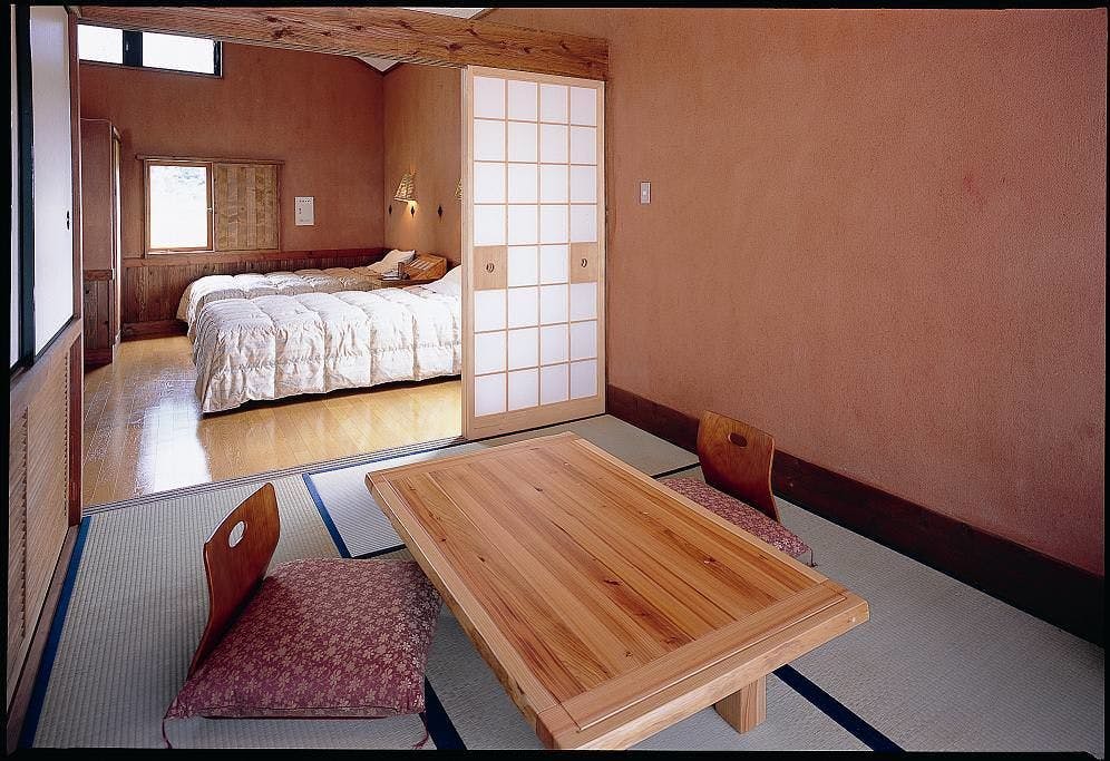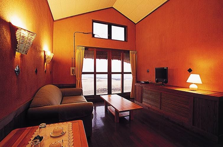 高原に面した窓を大きくし、草原から遠く宮崎県境の山々が望めるお部屋です。浴室からも同様の景色が望めます。