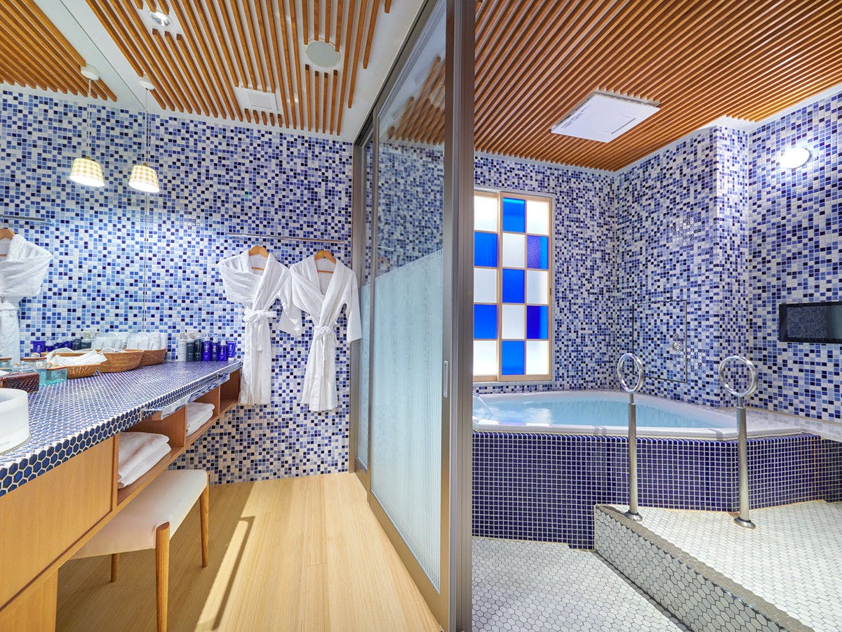 繊細なタイル遣いが特徴の“碧に包まれた”お風呂で