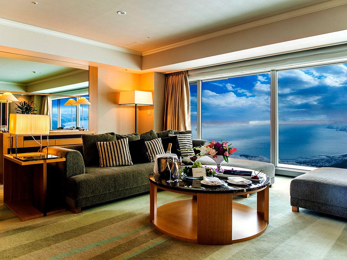 部屋いっぱいの大きな窓から、“天空リゾート”ならではの眺望を楽しめるプレミアムな客室。