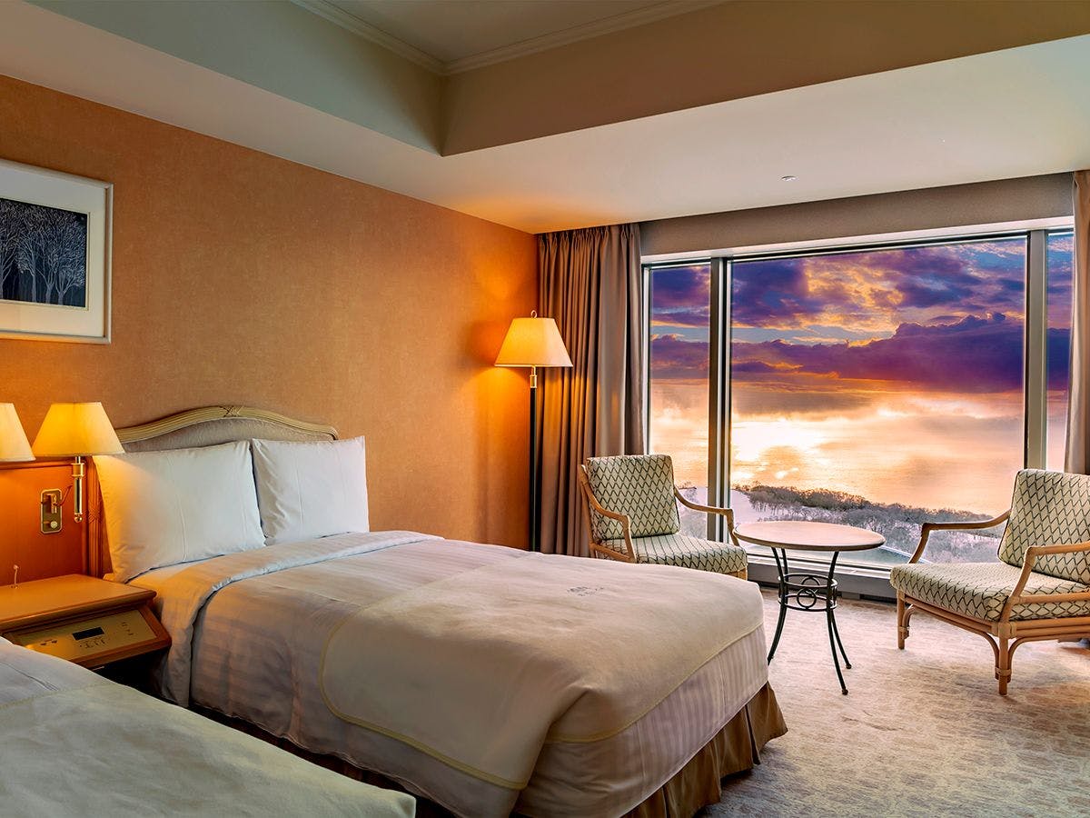 朝日に輝く洞爺湖の美しさを、目覚めのベッドからお楽しみいただけます。