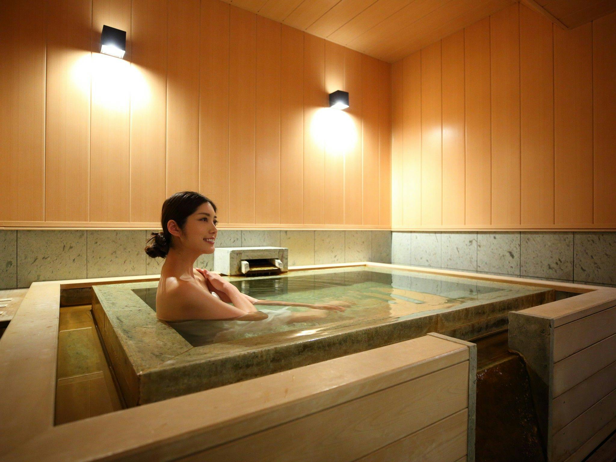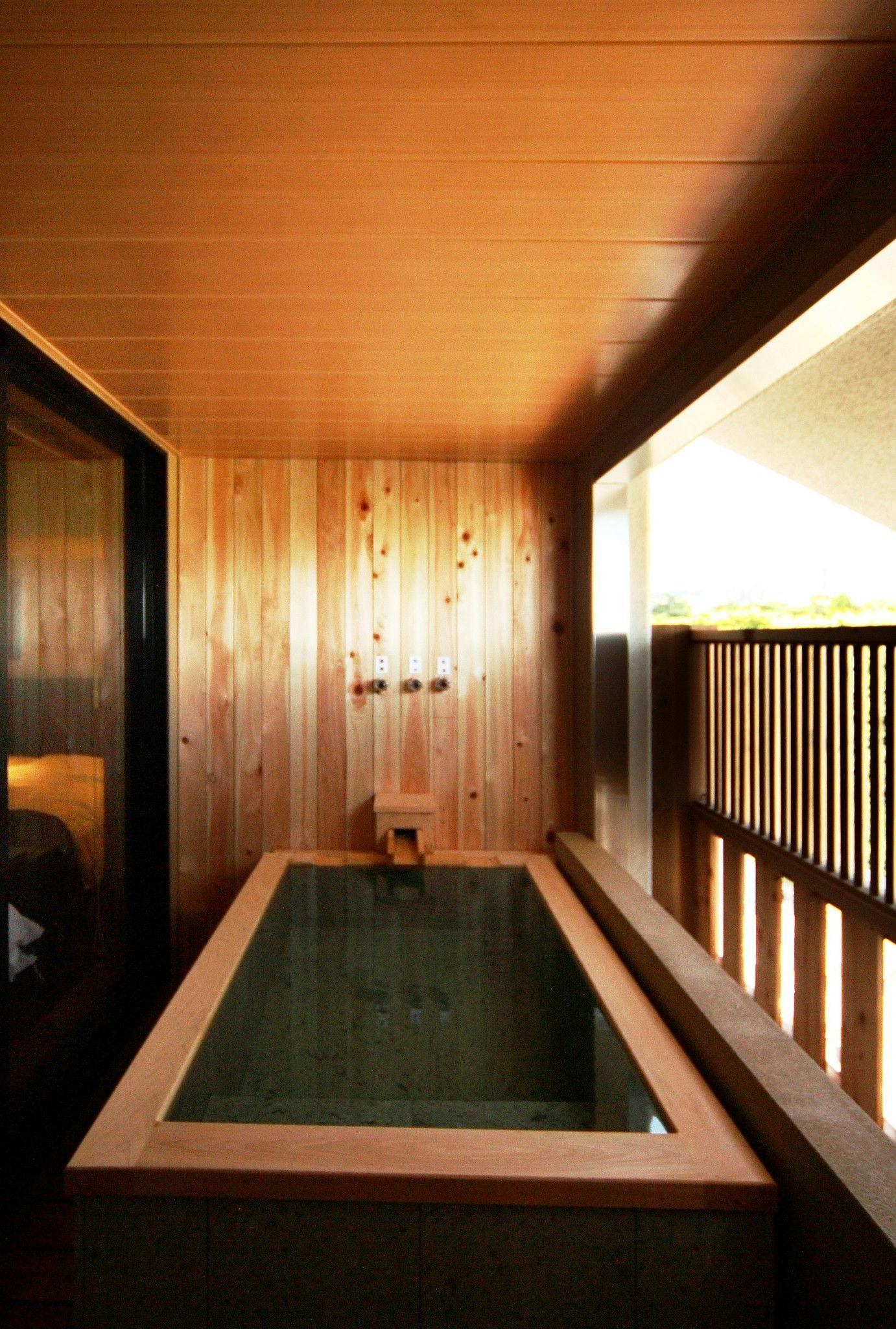 専用の源泉かけ流しの半露天風呂はご滞在中いつでもご利用いただけ、浴室空間に広がる豊かな湯の癒しを形づくります。