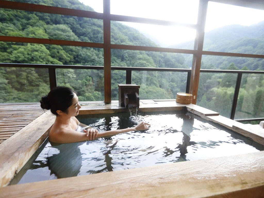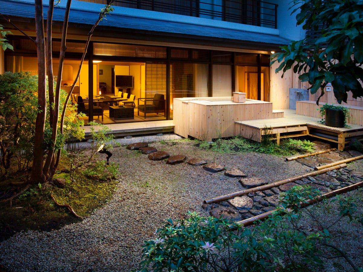 茶庭の佇まいと自然の風を感じる庭園露天風呂で、優雅な時間をお過ごしいただけます。