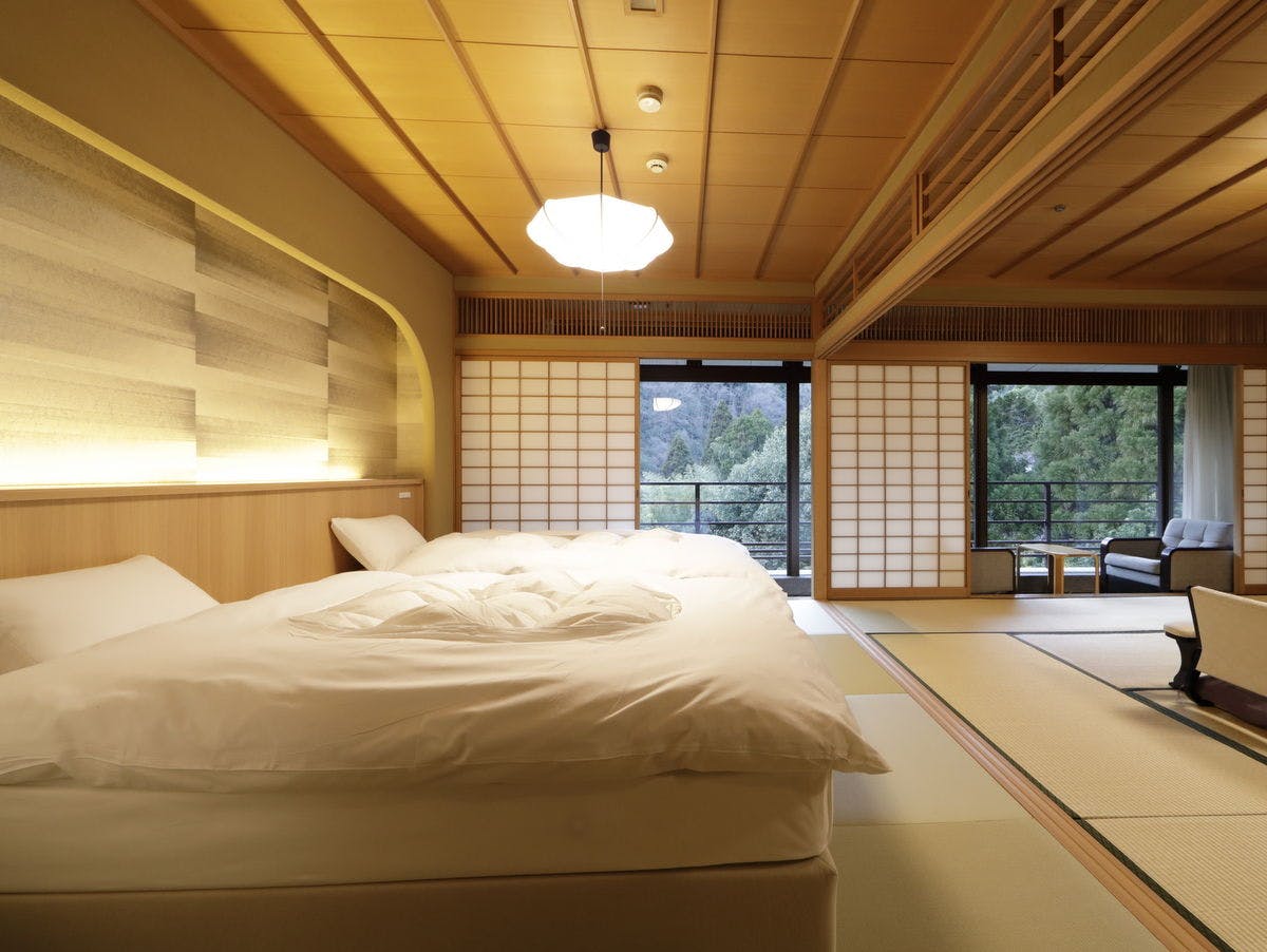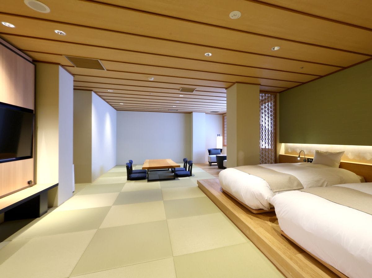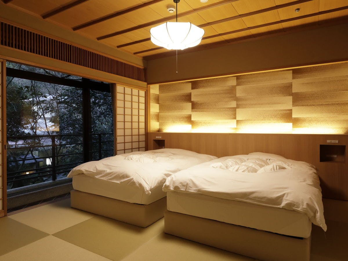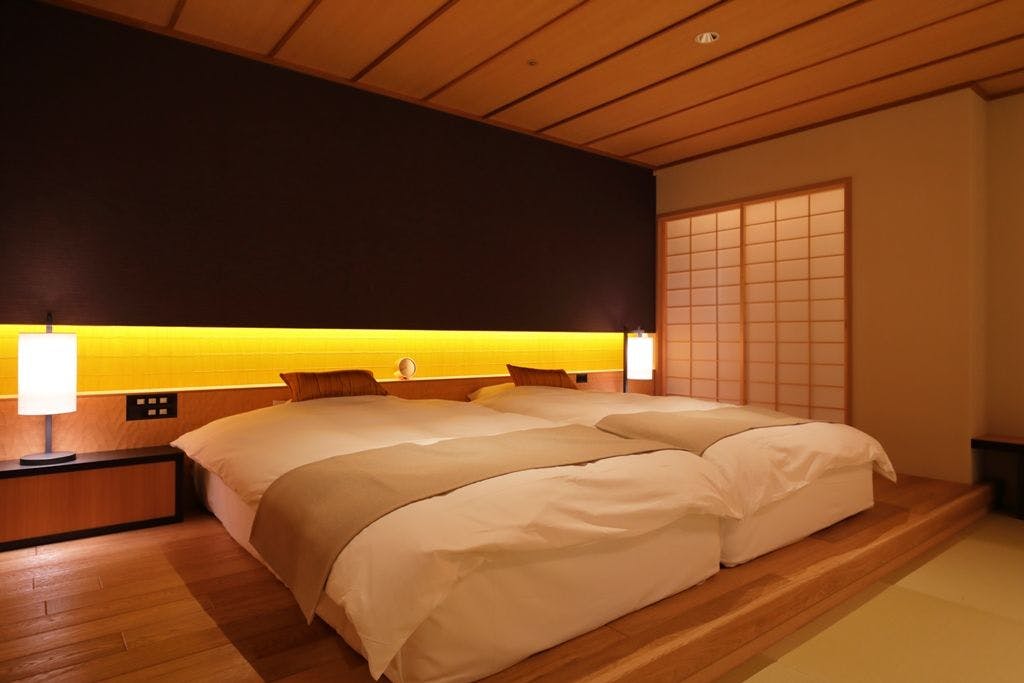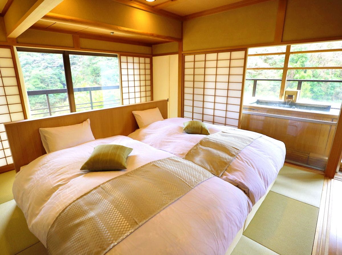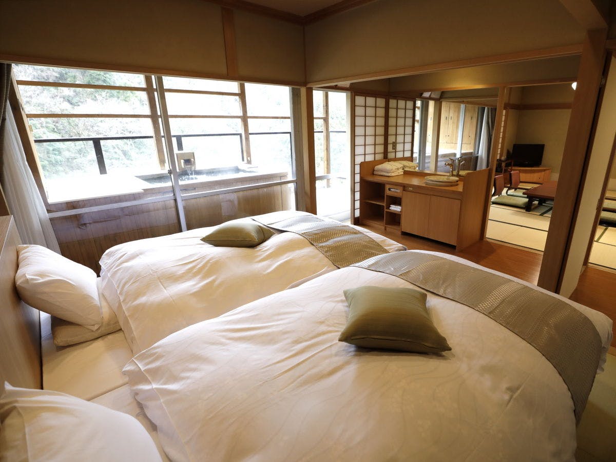 和室15畳+ツインベッドルーム(SIMMONS社製のベッド)+パウダールーム+広縁+庭園露天風呂