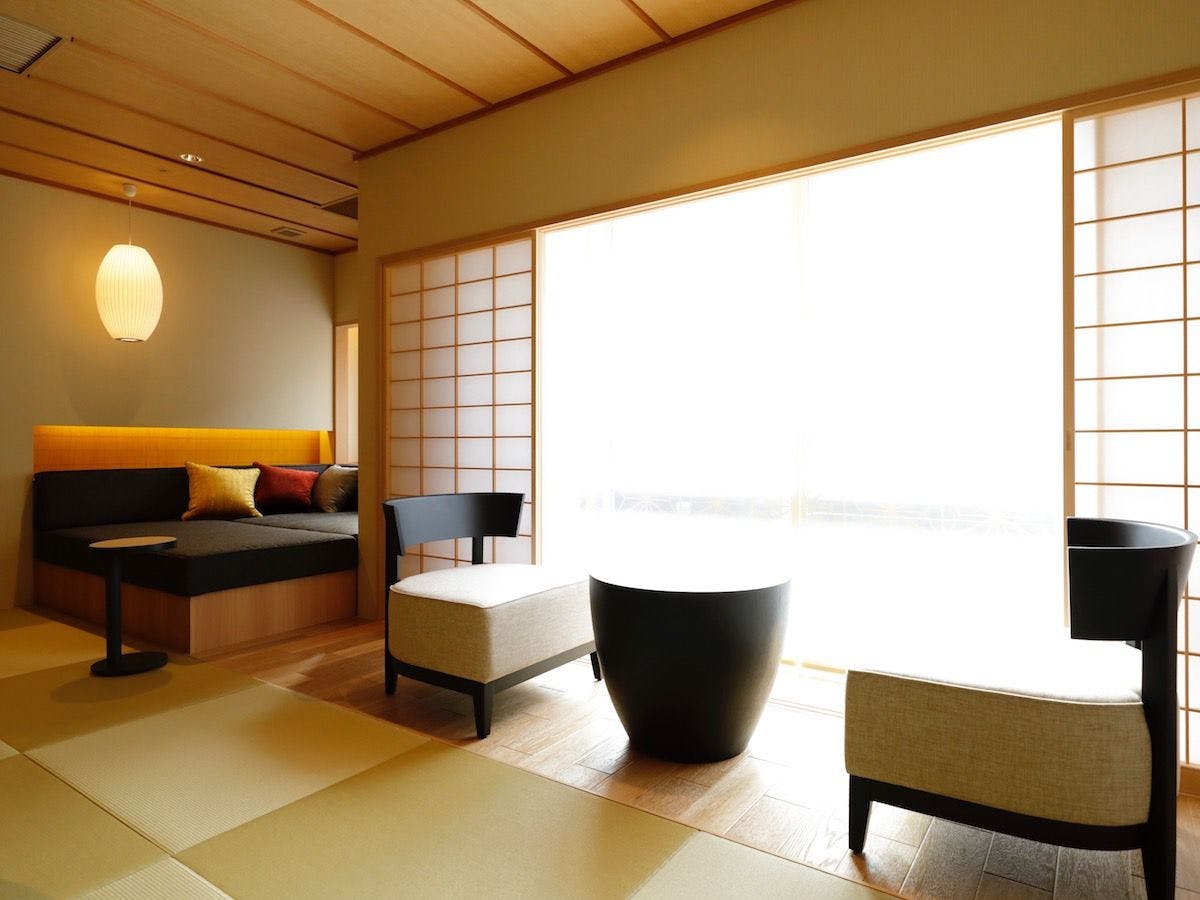 15畳の本間は贅沢な空間だけでなく、しつらえ・調度品も典雅な雰囲気を演出しております。6畳の広縁にあるデザイナーズソファに身を委ね、陽だまりの中のうたた寝も贅沢のひとつです