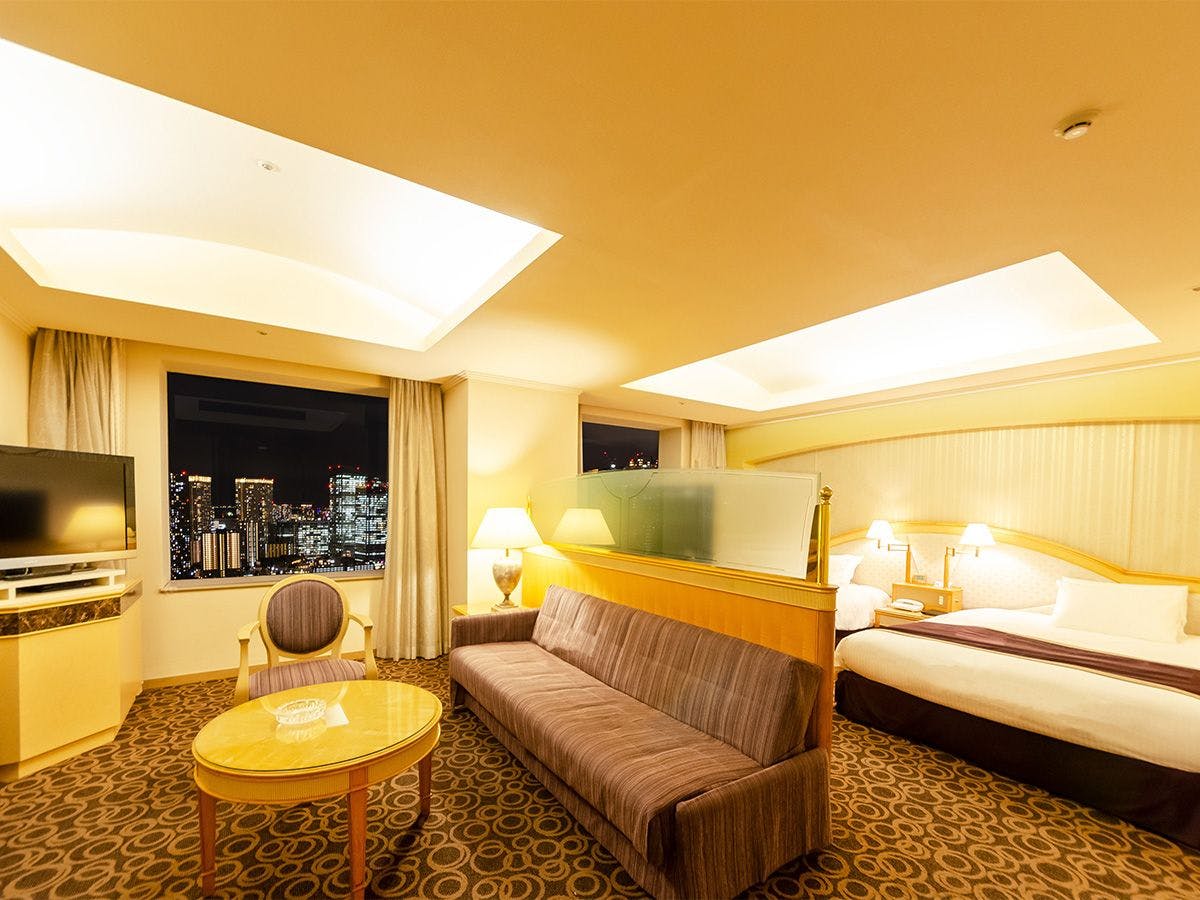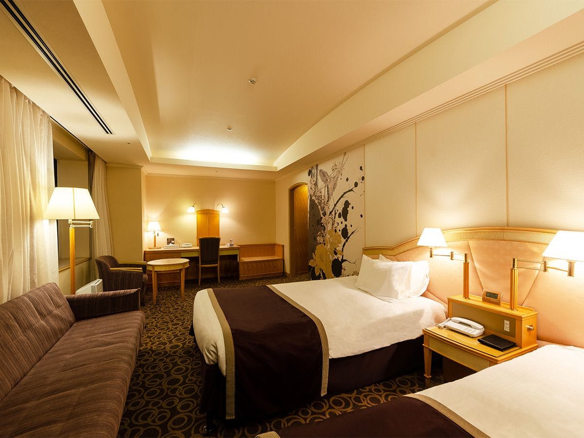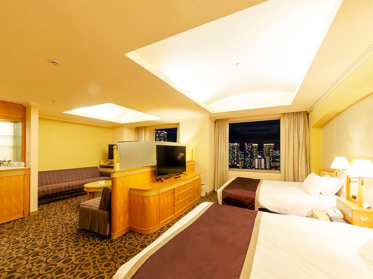 約40平米のゆったりとしたお部屋に1,200mmのベッドをご用意したツインルームです。ペアーベッドとソファーベッドのご利用で4名様でもご利用いただけます。33階以上の高層階に位置する客室からは東京の夜景をお楽しみいただけ、くつろぎの空間を彩ります。※一部のお部屋ではマッサージチェアのご用意はいたしておりません。あらかじめご了承ください。