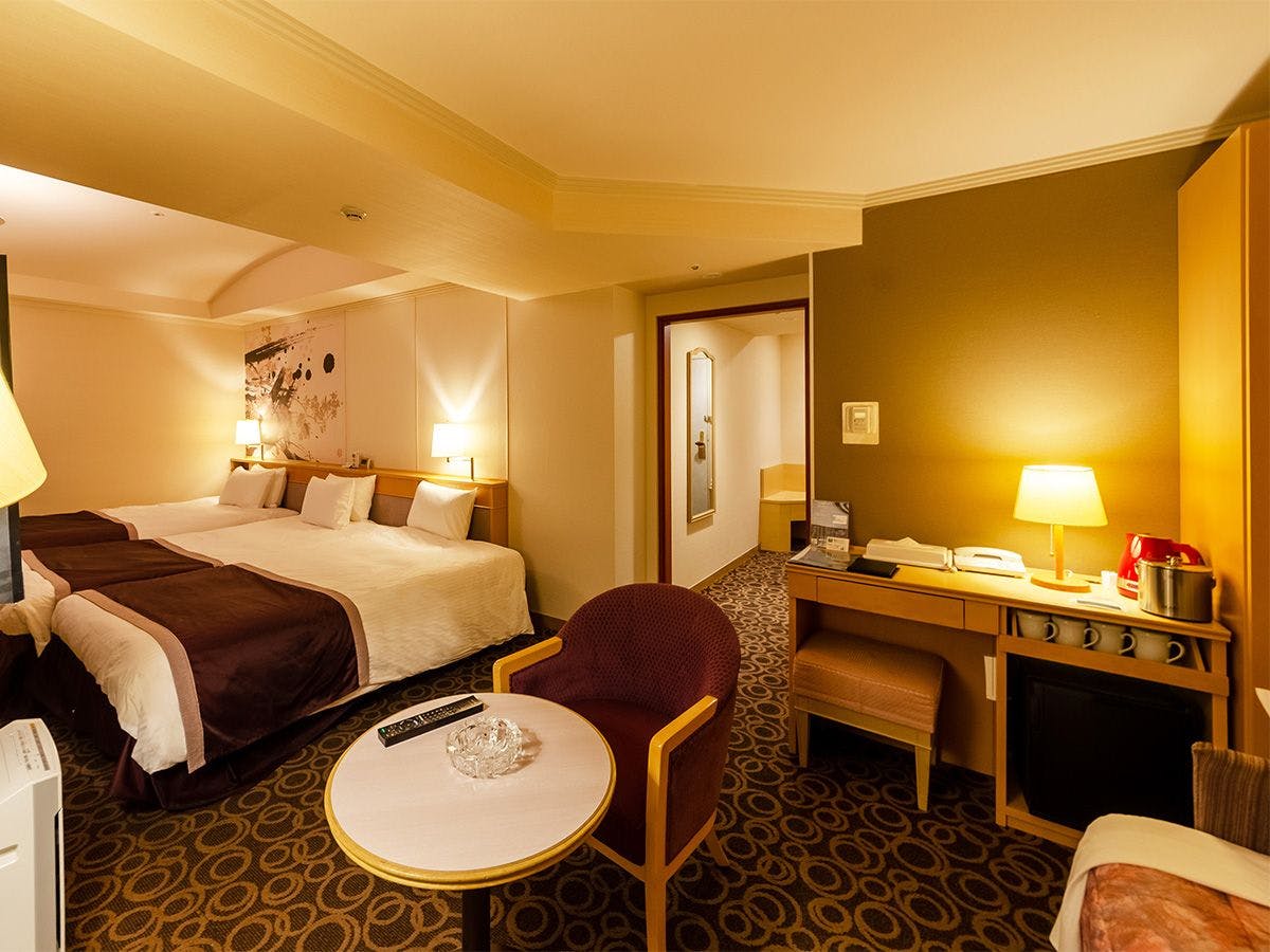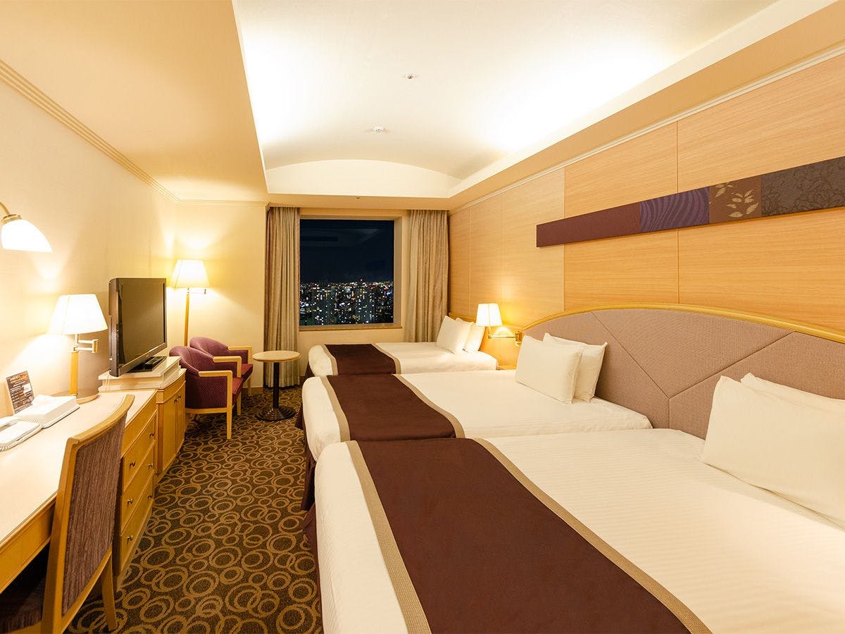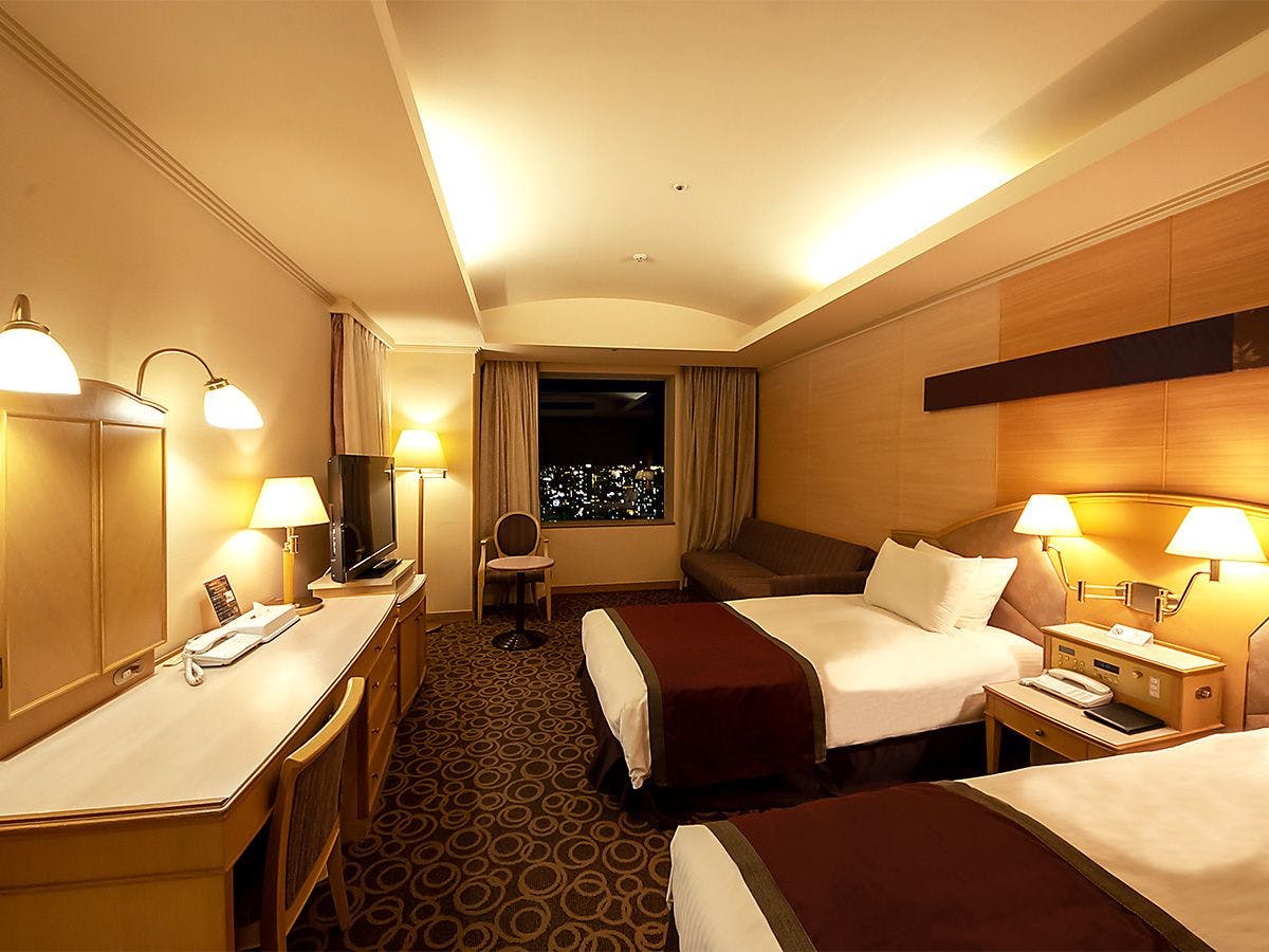 約40平米のゆったりとしたお部屋に1,200mmのベッドをご用意したツインルームです。ペアーベッドとソファーベッドのご利用で4名様でもご利用いただけます。33階以上の高層階に位置する客室からは東京の夜景をお楽しみいただけ、くつろぎの空間を彩ります。※一部のお部屋ではマッサージチェアのご用意はいたしておりません。あらかじめご了承ください。