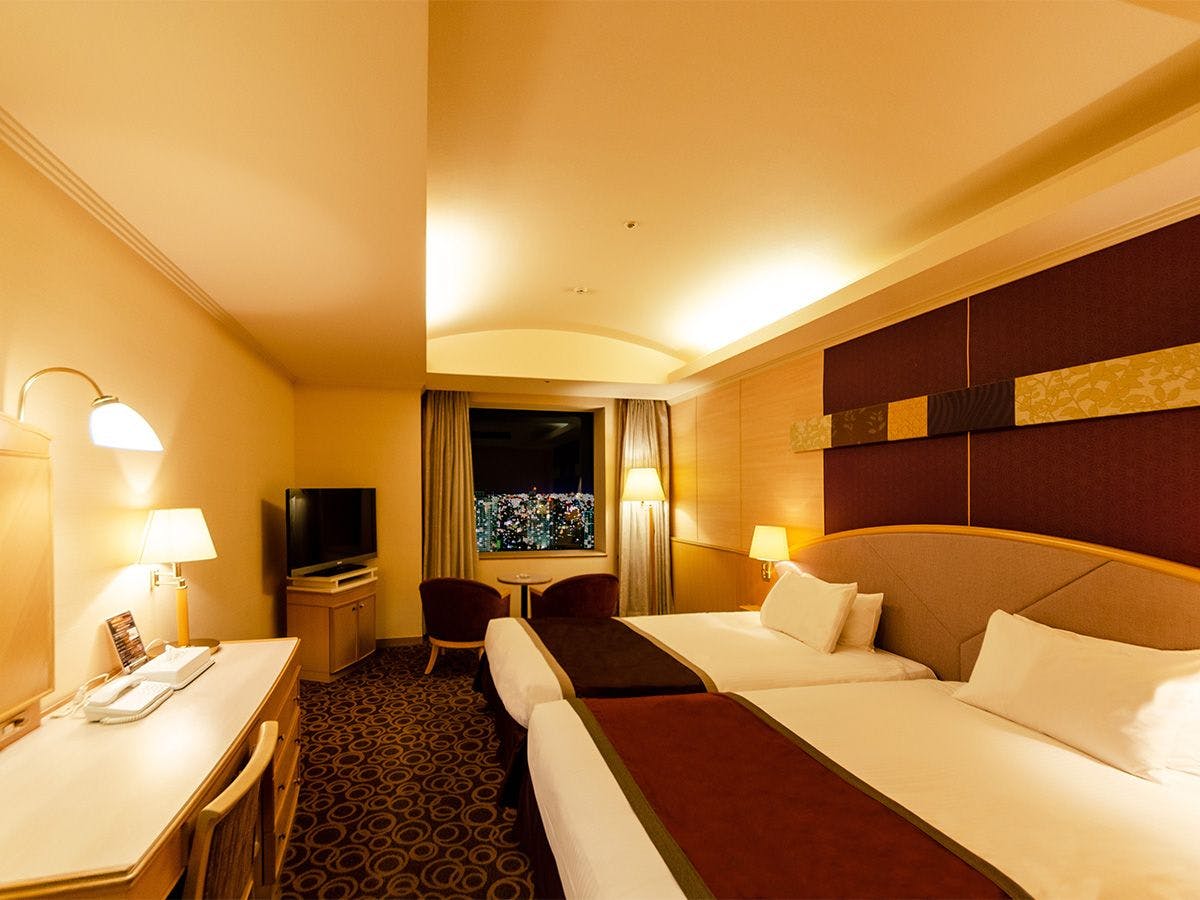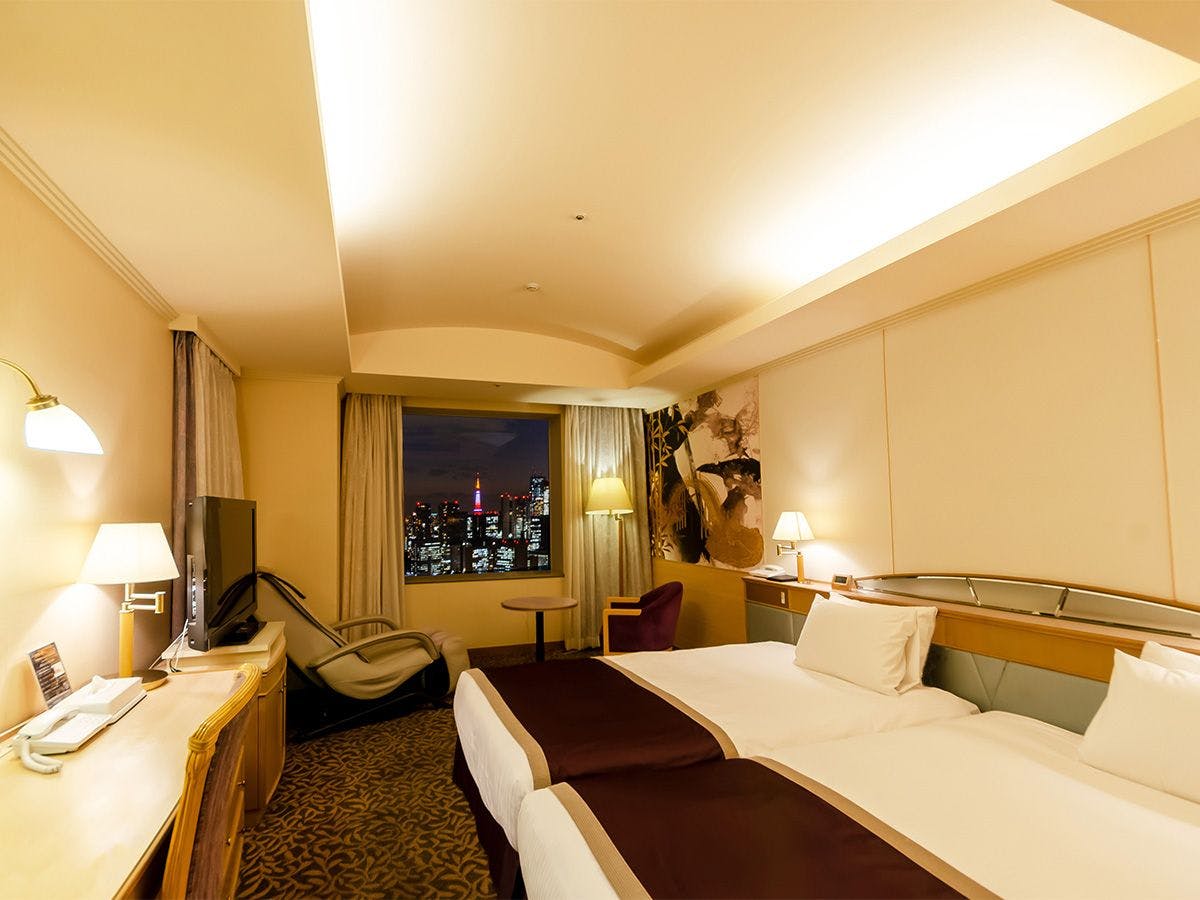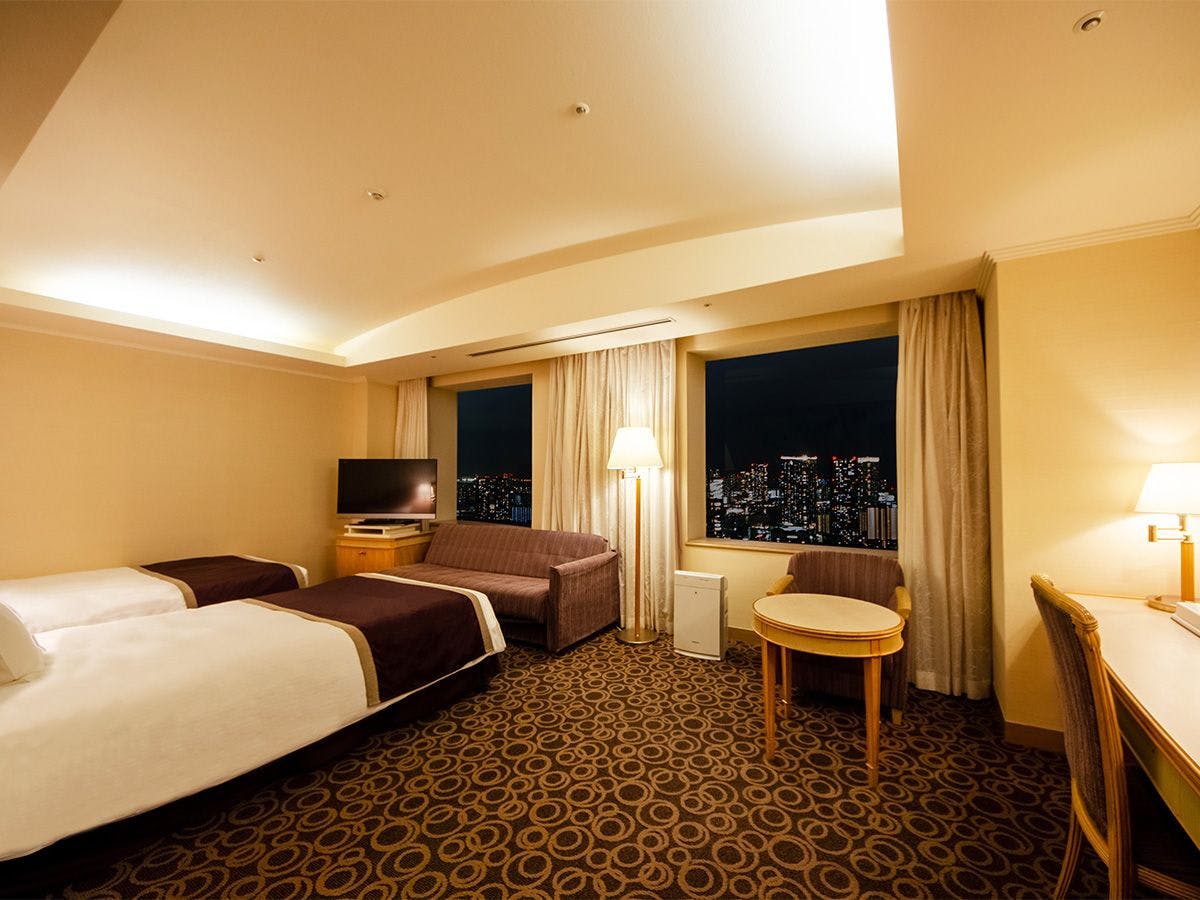 約29平米のお部屋に1,200mmのベッドをご用意したツインルームです。ペアーベッドのご利用で3名様でもご利用いただけます。33階以上の高層階に位置する客室からは東京の夜景をお楽しみいただけ、くつろぎの空間を彩ります。※一部のお部屋ではマッサージチェアのご用意はいたしておりません。あらかじめご了承ください。
