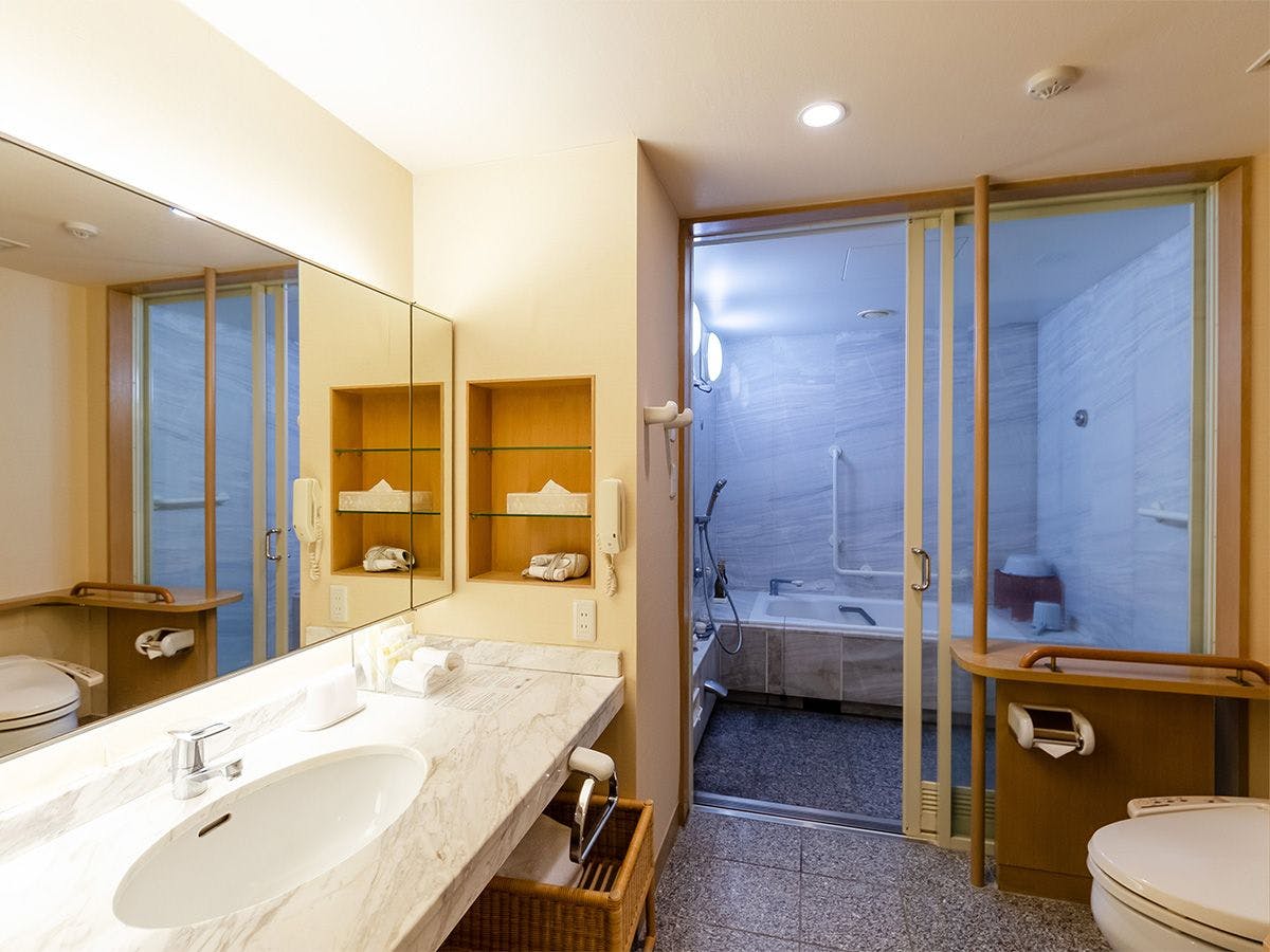 約45平米のゆったりとしたお部屋に1,200mmのベッドをご用意したツインルームです。お部屋はバリアフリー対応で、正ベッド2台のほかにペアベッドとソファーベッドを使用するとで4名様でもご利用いただけます。※一部のお部屋ではマッサージチェアのご用意はいたしておりません。あらかじめご了承ください。