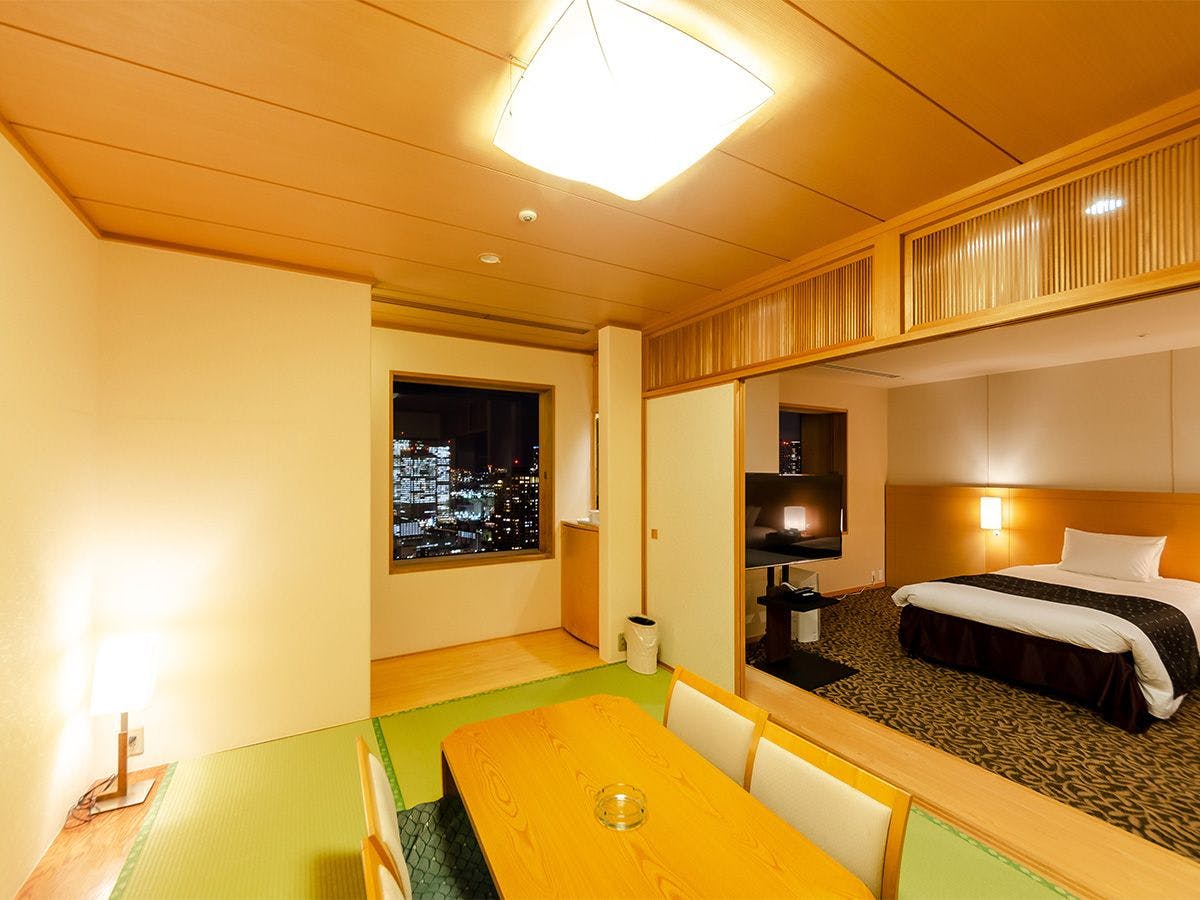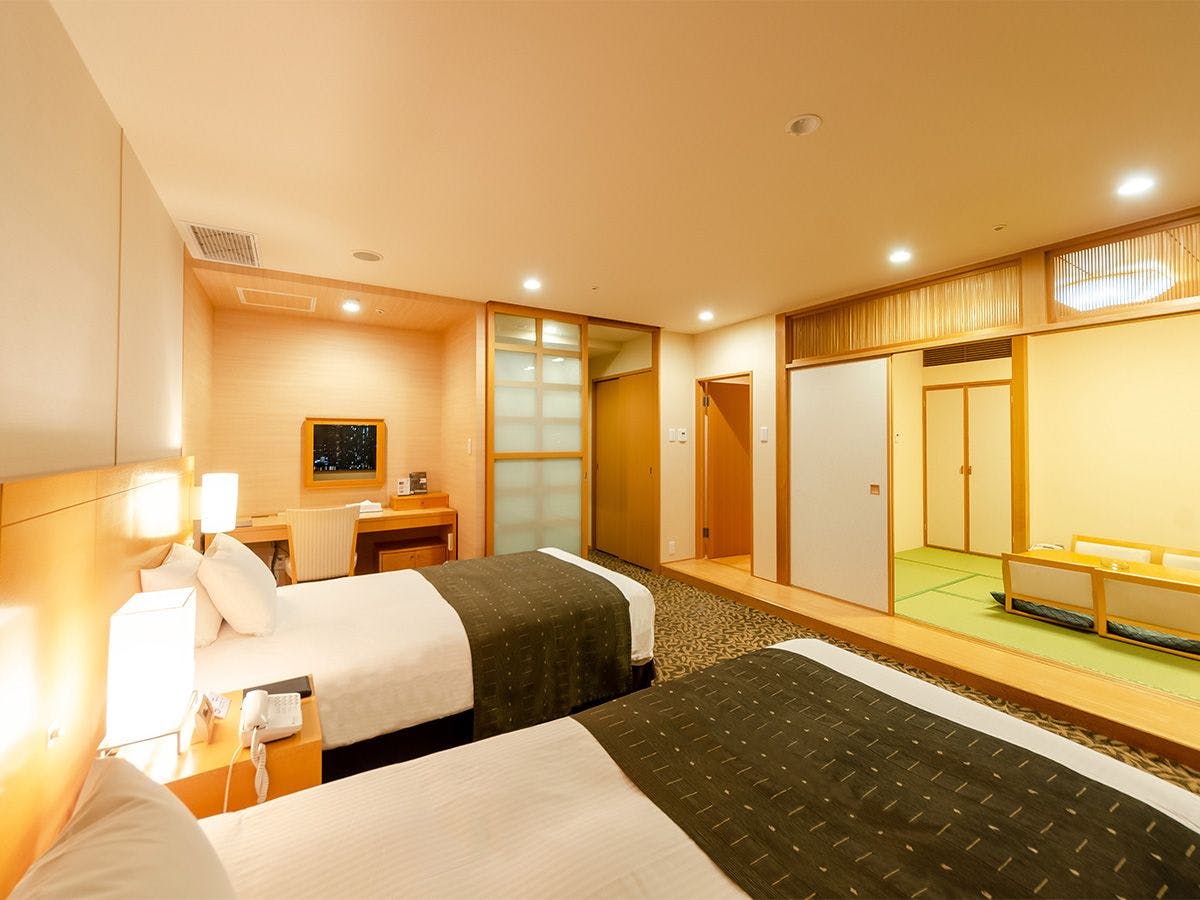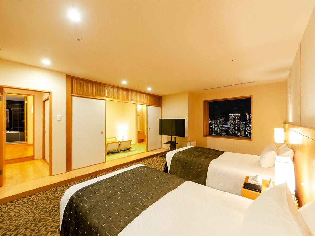 62平米の和洋室は洋室と6畳の和室で1,200mmのベッドを2台ご用意しております。33階以上の高層階に位置する客室からは東京の夜景をお楽しみいただけます。※一部のお部屋ではマッサージチェアのご用意はいたしておりません。あらかじめご了承ください。