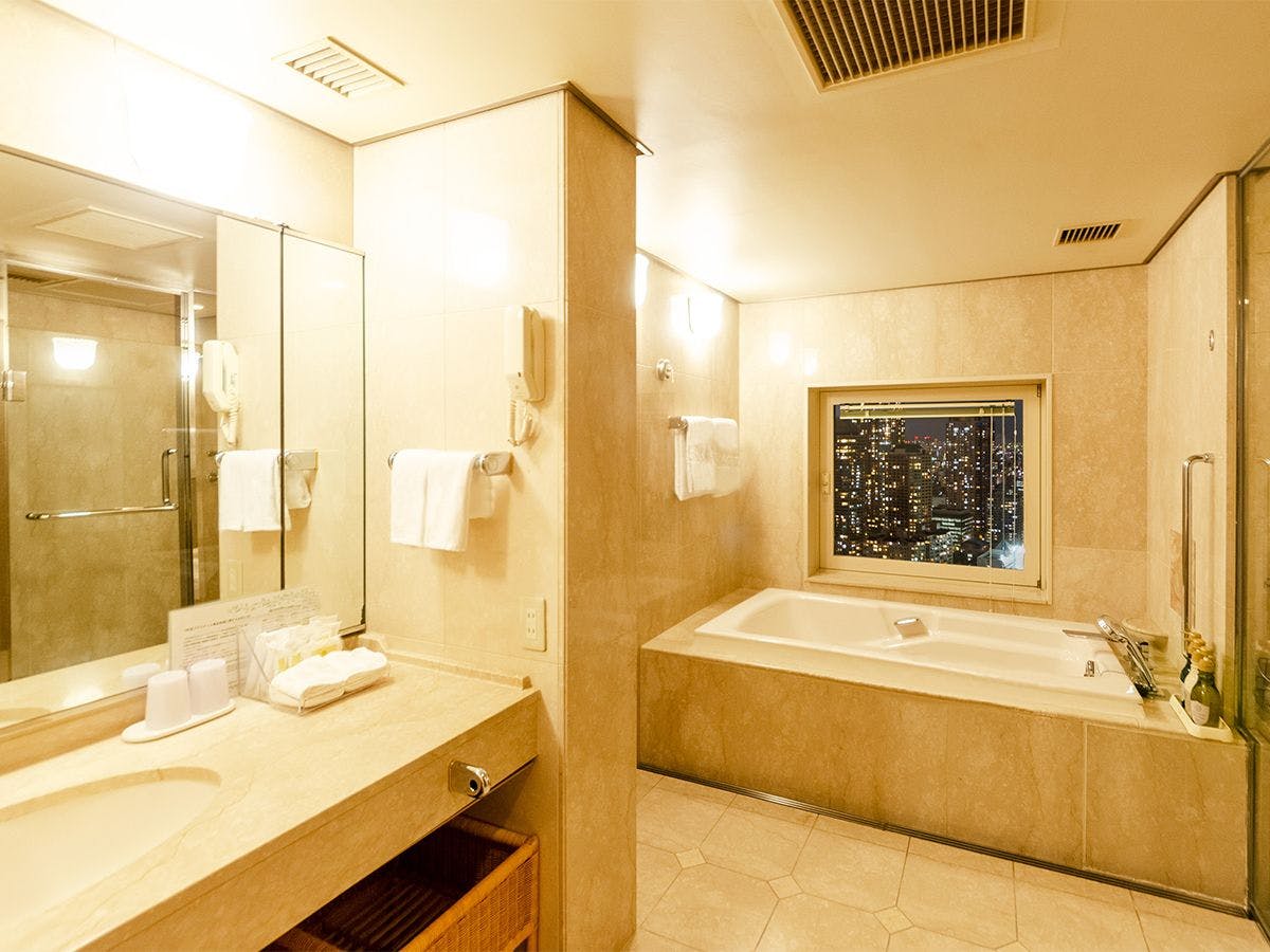 約47平米のゆったりとしたお部屋に1,200mmのシルキーベッドをご用意したツインルームです。33階以上の高層階に位置する客室とバスルームからは東京の夜景をお楽しみいただけ、くつろぎの空間を彩ります。※一部のお部屋ではマッサージチェアのご用意はいたしておりません。あらかじめご了承ください。