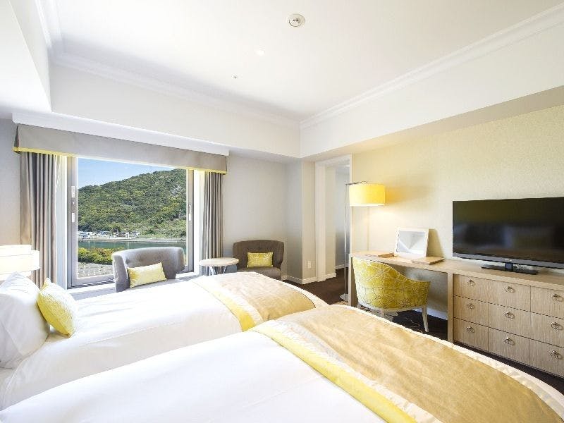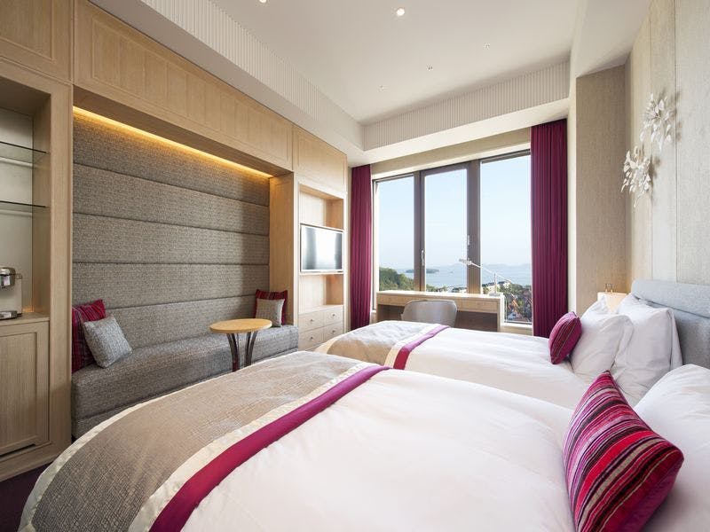 波静かな大村湾とヨーロピアンな街並みを望むハウステンボス側のお部屋です。