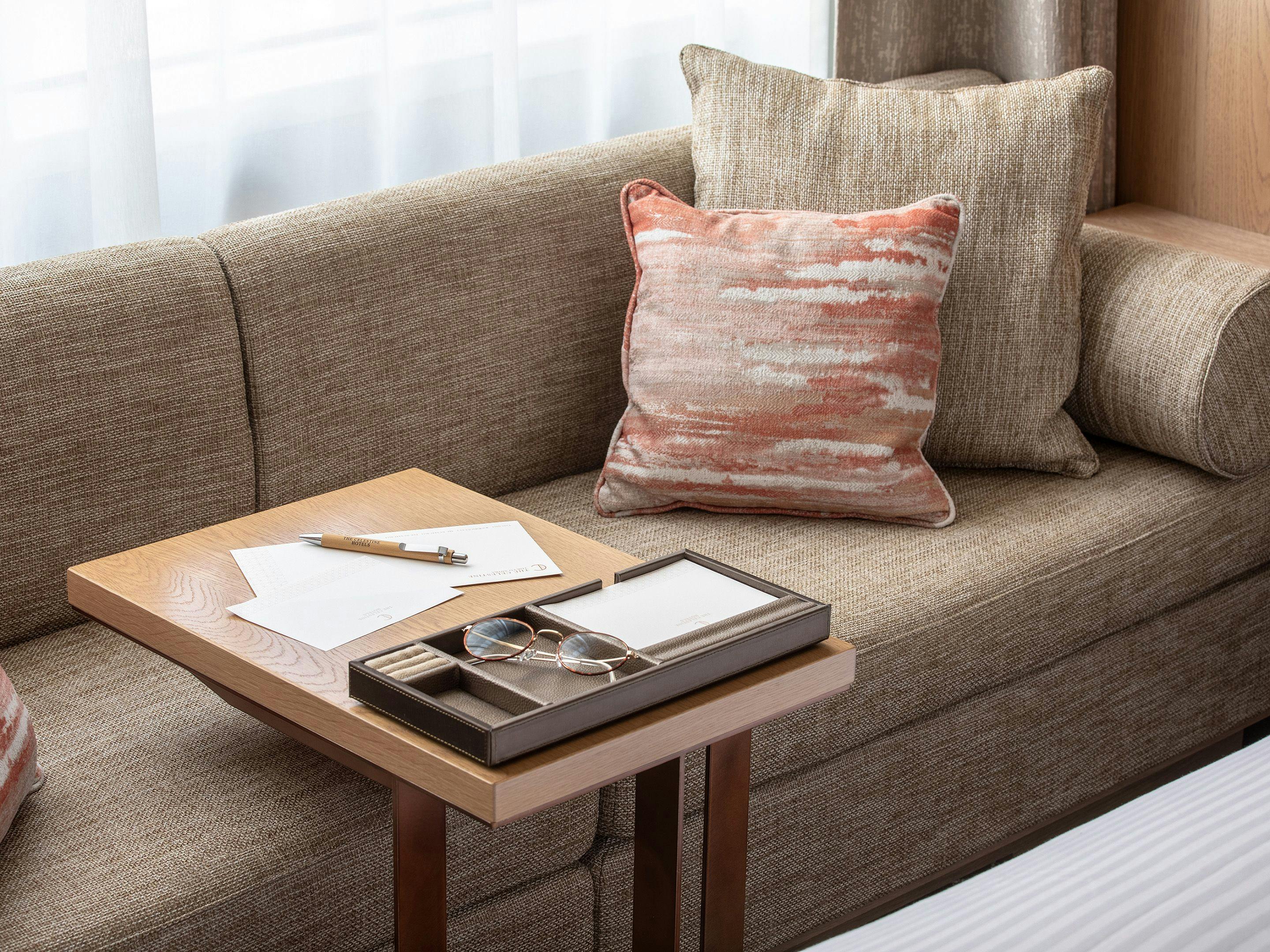 窓側にソファを備えた、ゆったりと寛げるリビング空間。解放感のある大きな窓から差し込む自然光は都会のオアシスで過ごす“癒しの時間”をご提供いたします。