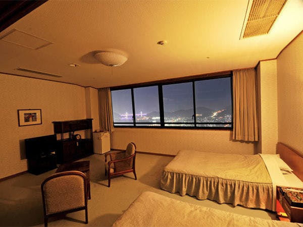 すべての客室から長崎随一と言われる最高の夜景が一望できます。12.5畳と6畳の2間の和室と3畳の前室を備え、角部屋のため2面に広縁と大きな窓があります。特別室ならではのゆとりの空間は旅の疲れを癒してくれます。全室がバス・トイレ付(洗浄機付トイレ)です。
