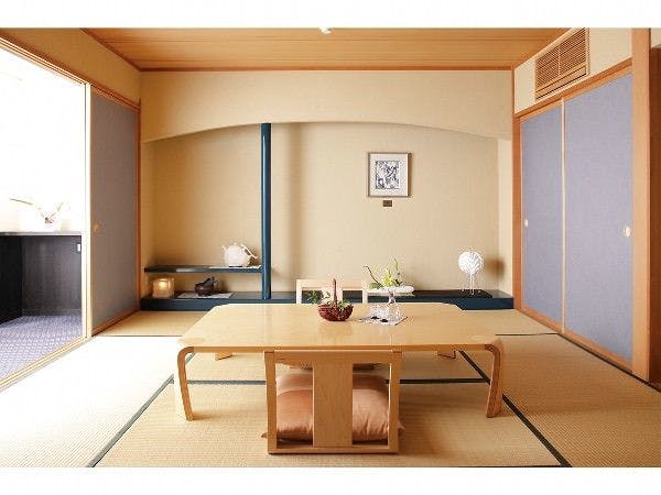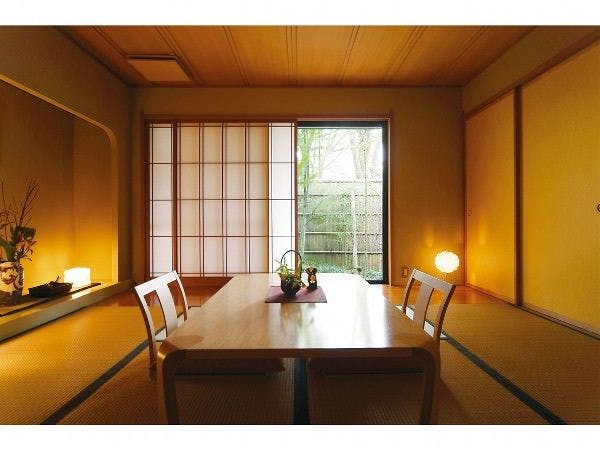 ■禁煙室7つの離れで過ごす寛ぎの時間2017年9月完成。リビングとテラスをリニューアル。床暖完備でモダンな木の温もりが素足で感じられます。テーマは「かぎろい」。太陽の光を浴びて輝く絹のように、清楚でやさしく明るい、女性のようなイメージを色にして表現しました。窓から見える清らかな五百川の流れ、そして四季折々の表情を見せる山々の風景とともに、穏やかな時間をお過ごしください。