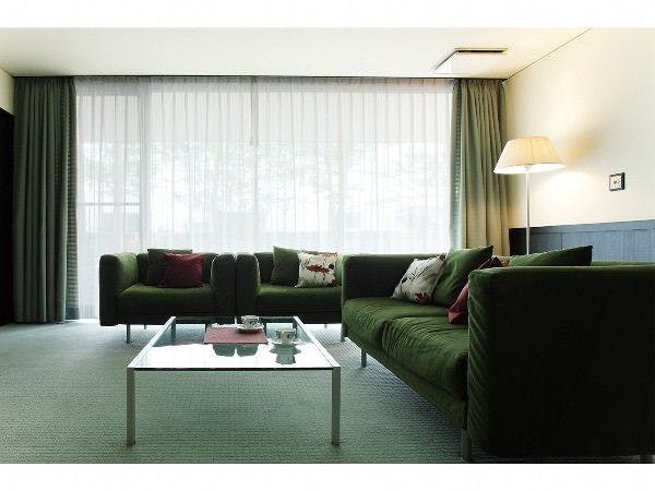 7つの離れで過ごす寛ぎの時間テーマは「感触の香」。やわらかな風が吹く初夏のような雰囲気の色調でコーディネートし、清々しさを演出しました。部屋の窓からは、清らかな五百川と、四季の移ろいを感じさせる山々の風景がゆっくり楽しめます。こちらのお部屋は2階建てになります。